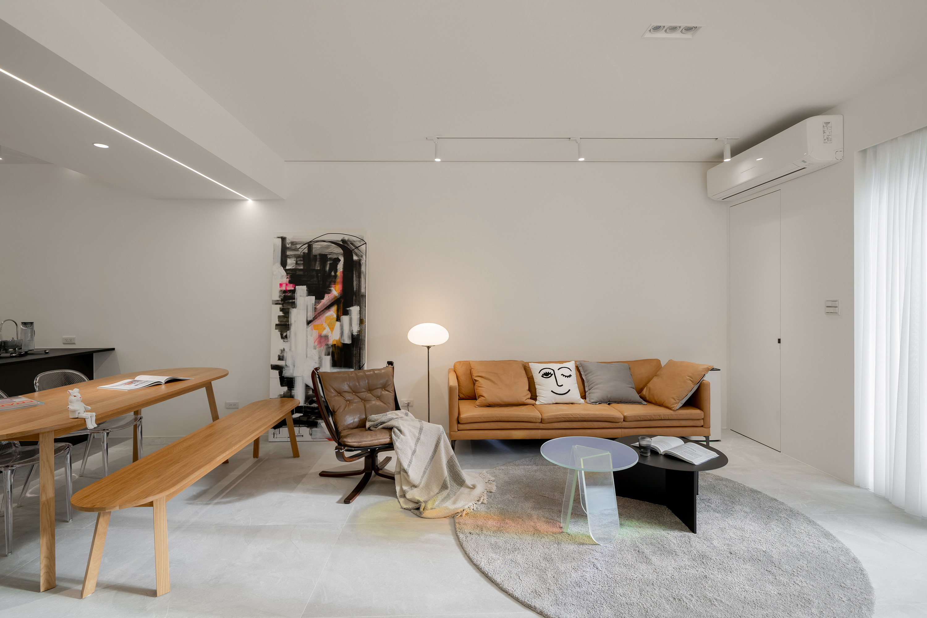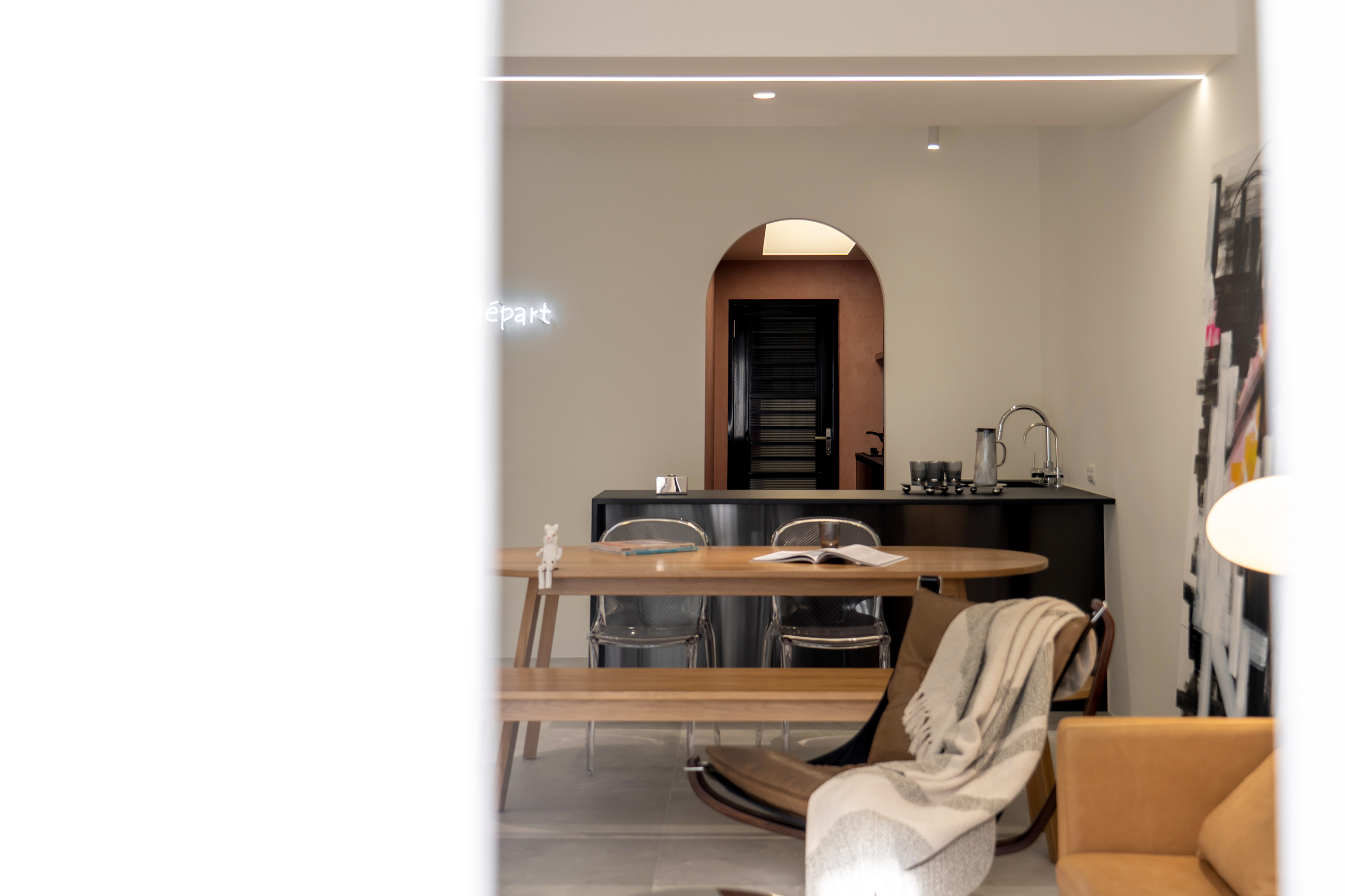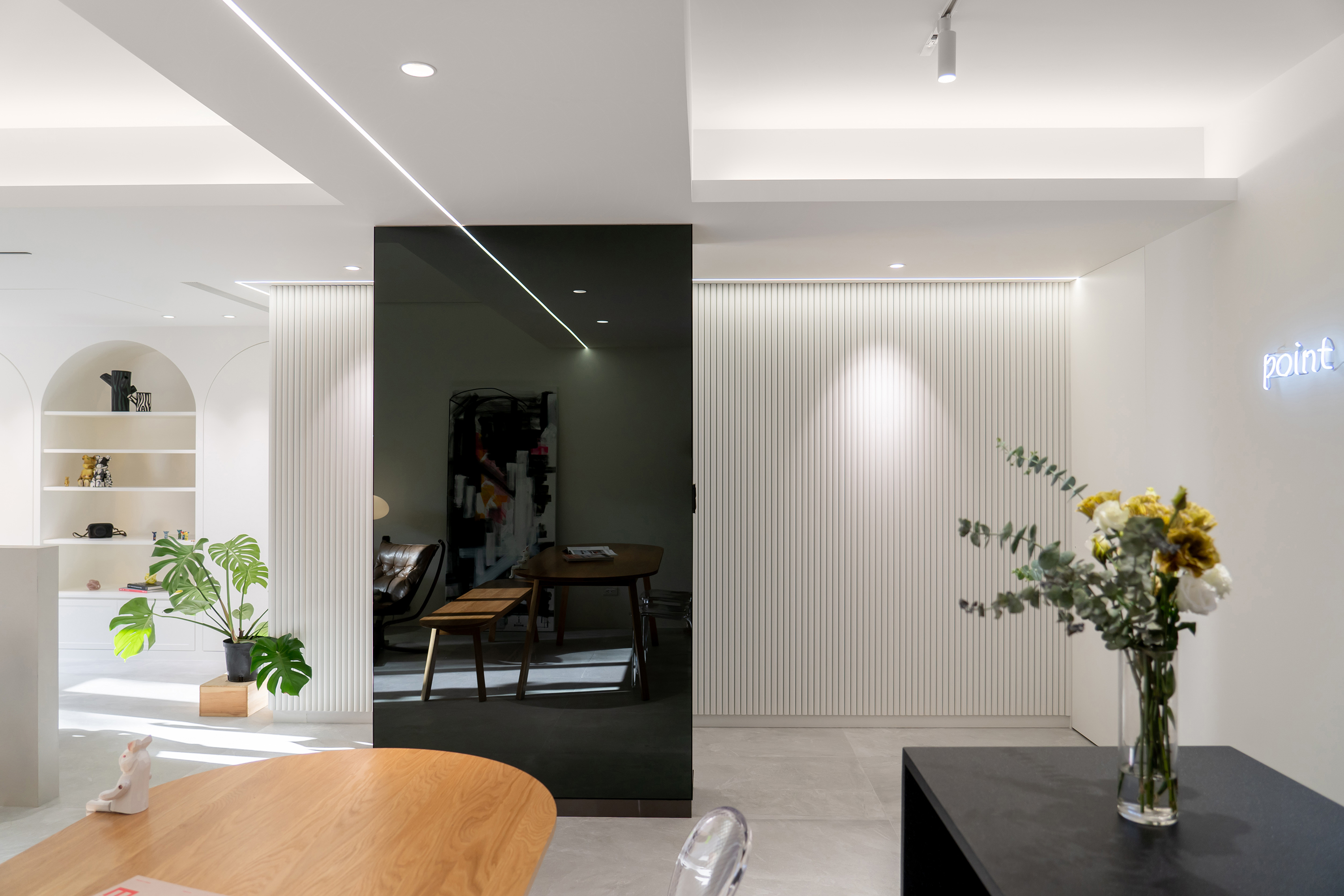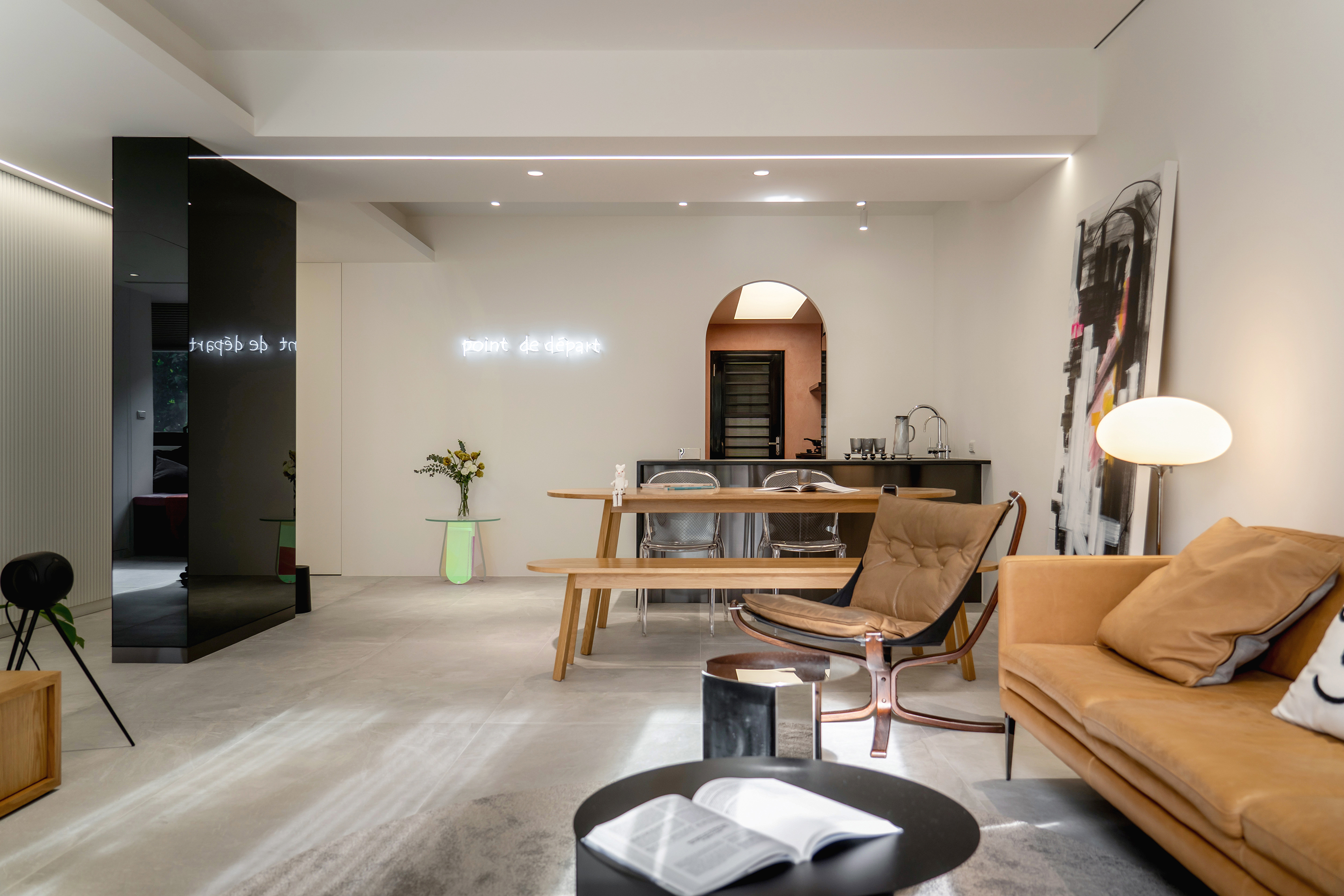 Natural light gracefully streams into the interior space through thoughtfully designed partial openings, beautifully complemented by elegantly light gray floor tiles. The choice of simple colors and materials works harmoniously to cultivate a serene and pure atmosphere. As one gazes upon the walls—largely left blank—the striking white neon lettering stands out, embodying a contemporary artistic style that not only enhances the aesthetics but also provides versatile display options. In the public area, the central structural column serves as a captivating focal point, ingeniously combining storage cabinets with a sleek black mirror design. This innovative approach allows light to flow freely, effectively extending the visual layers and adding depth to the space. Transitioning into the kitchen, the entrance showcases a classic arch element, a tribute to the father’s design, which presents a fresh interpretation of proportions and lines in a modern context.
