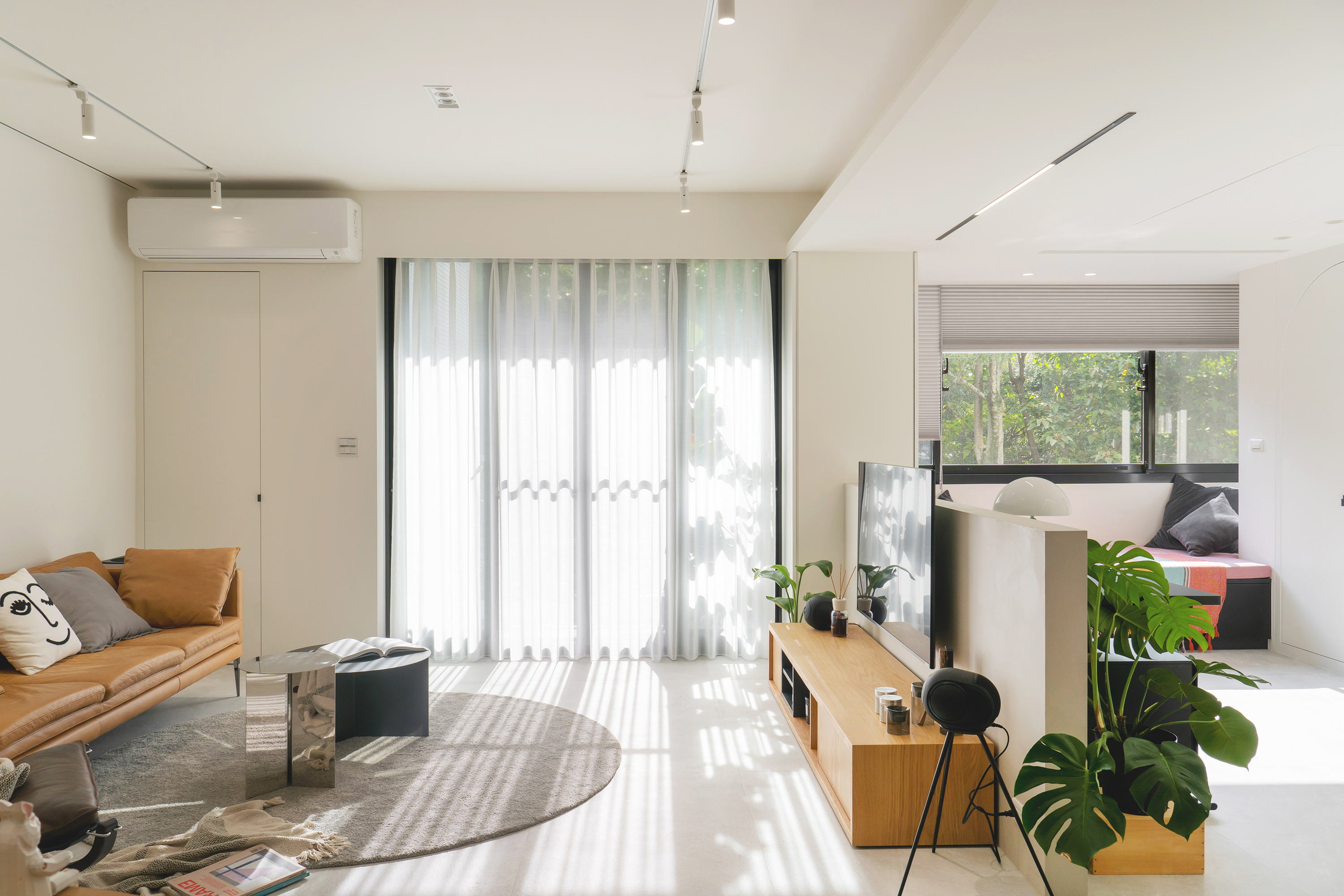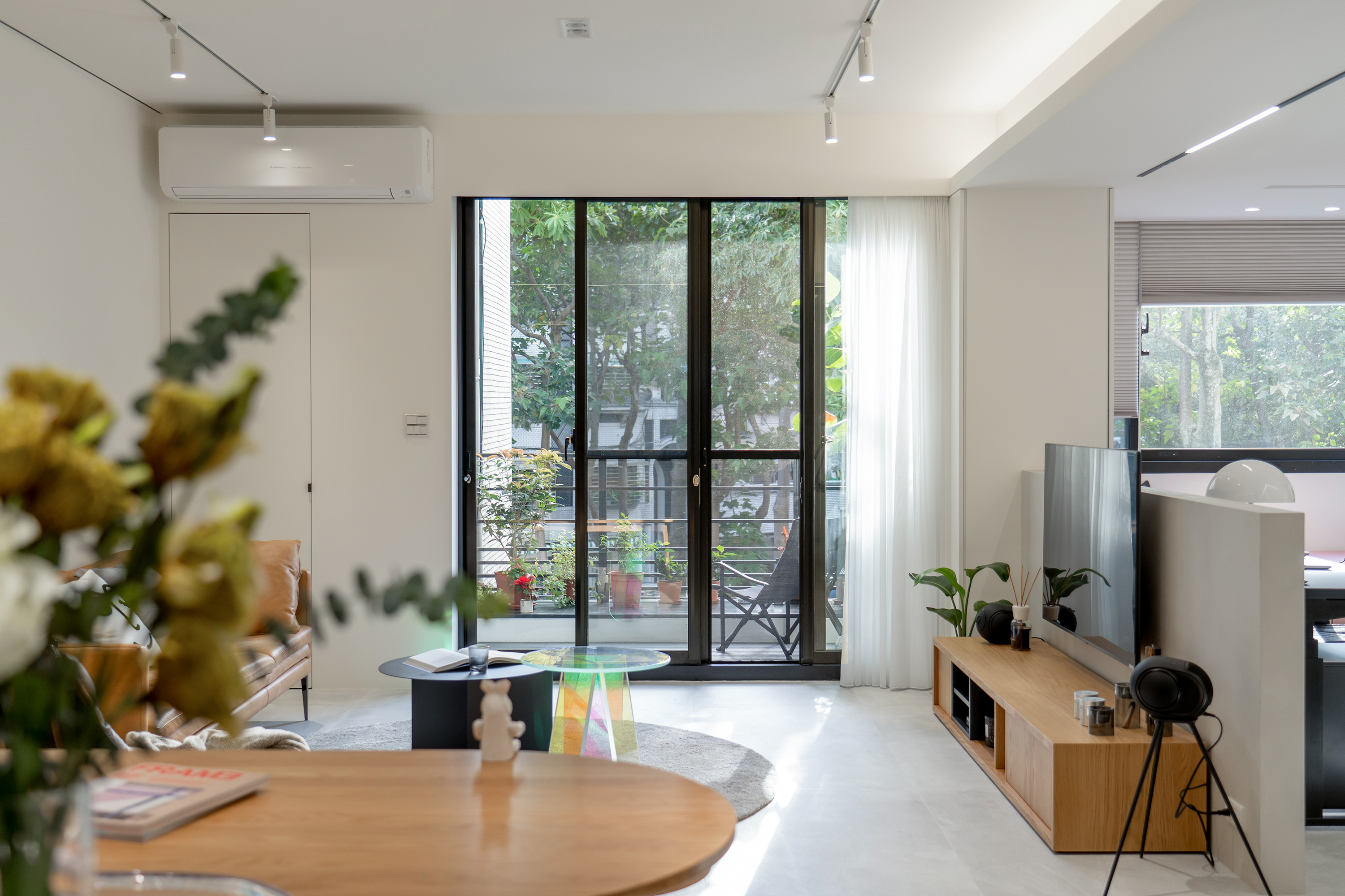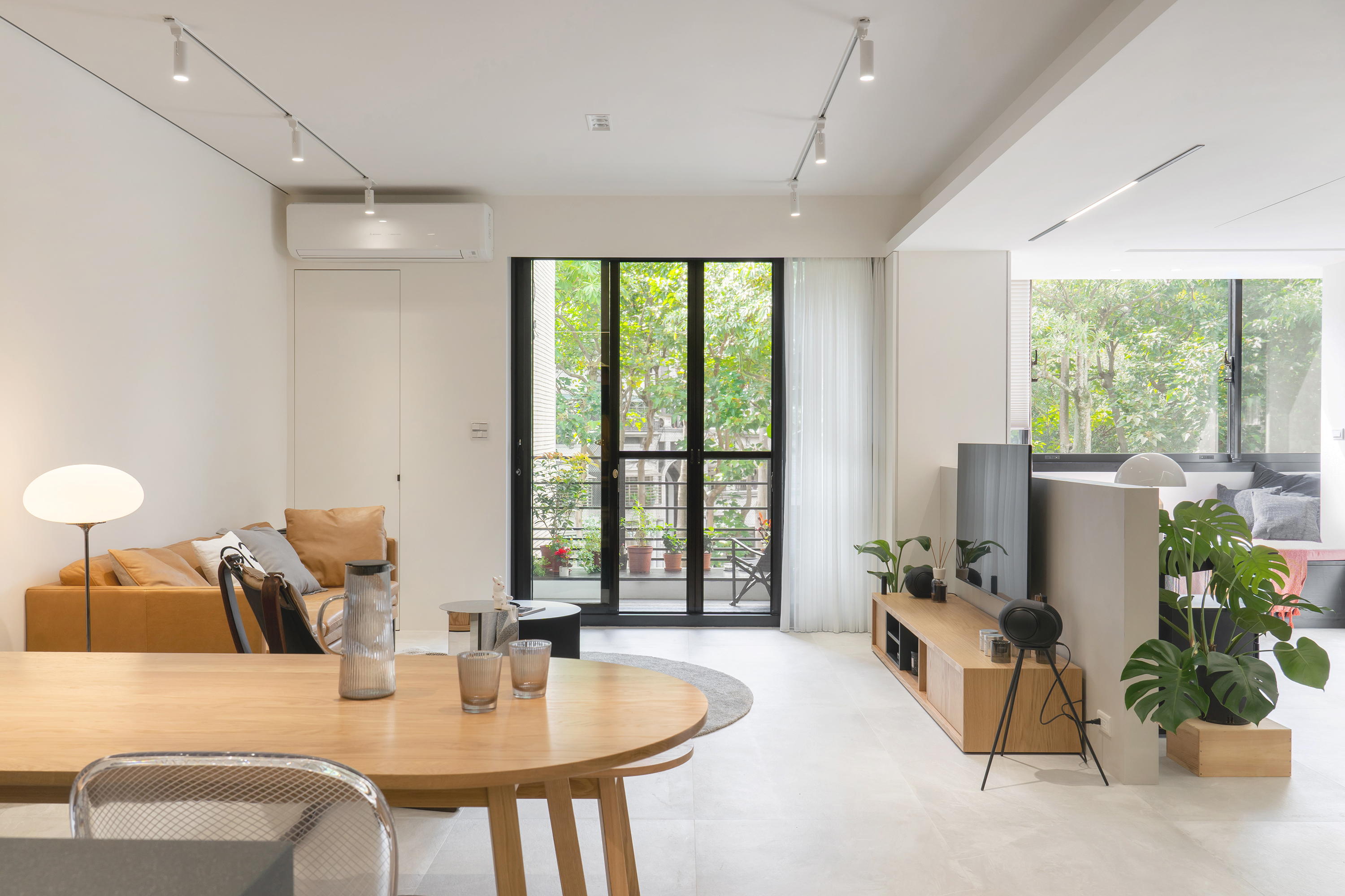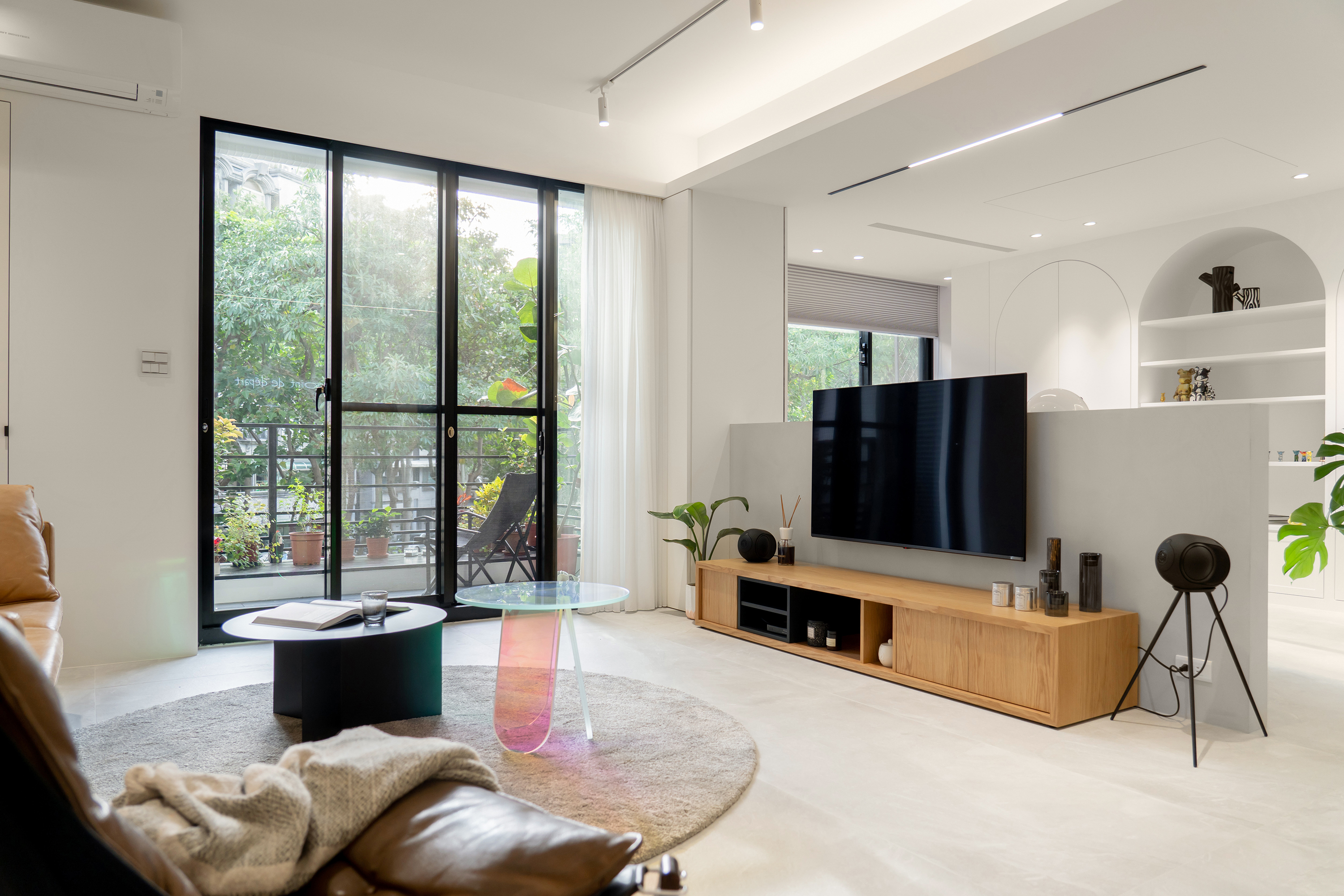 Natural light gracefully streams into the interior space through thoughtfully designed partial openings, beautifully complemented by elegantly light gray floor tiles. The choice of simple colors and materials works harmoniously to cultivate a serene and pure atmosphere. As one gazes upon the walls—largely left blank—the striking white neon lettering stands out, embodying a contemporary artistic style that not only enhances the aesthetics but also provides versatile display options. In the public area, the central structural column serves as a captivating focal point, ingeniously combining storage cabinets with a sleek black mirror design. This innovative approach allows light to flow freely, effectively extending the visual layers and adding depth to the space. Transitioning into the kitchen, the entrance showcases a classic arch element, a tribute to the father’s design, which presents a fresh interpretation of proportions and lines in a modern context.