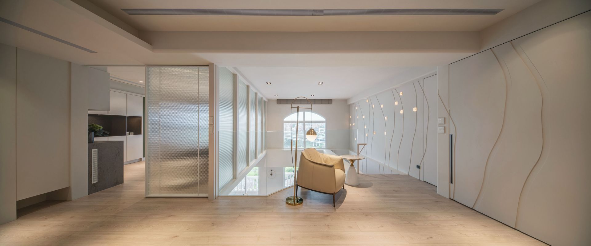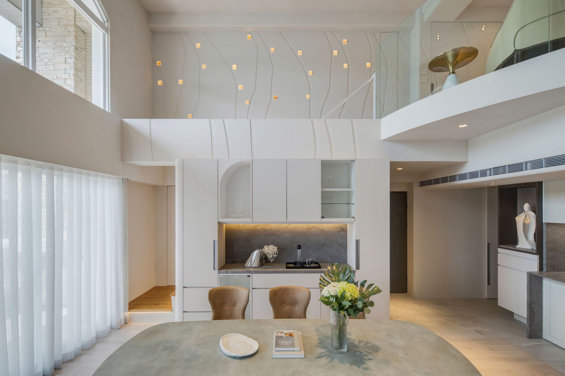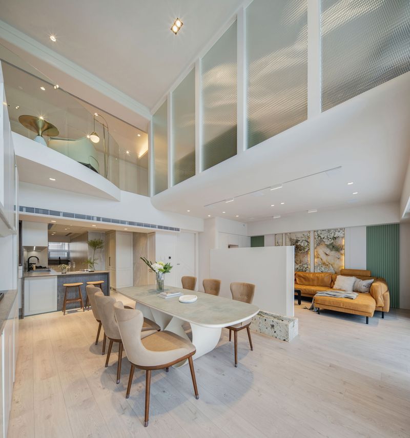 Located on a high floor, this residence incorporates several passive and active strategies to enhance thermal comfort and energy efficiency. A thermal insulation blanket was added beneath the rooftop to significantly reduce indoor heat gain. The use of Low-E glass further prevents external heat from penetrating the interior, contributing to improved energy performance. Given the home’s exposure to intense eastern and western sunlight, ventilation design plays a critical role—push-out windows were installed to harness prevailing winds and promote natural air circulation, effectively cooling the space and improving airflow efficiency. Existing window openings were retained and paired with double-height spatial planning to enhance natural daylighting throughout the home.