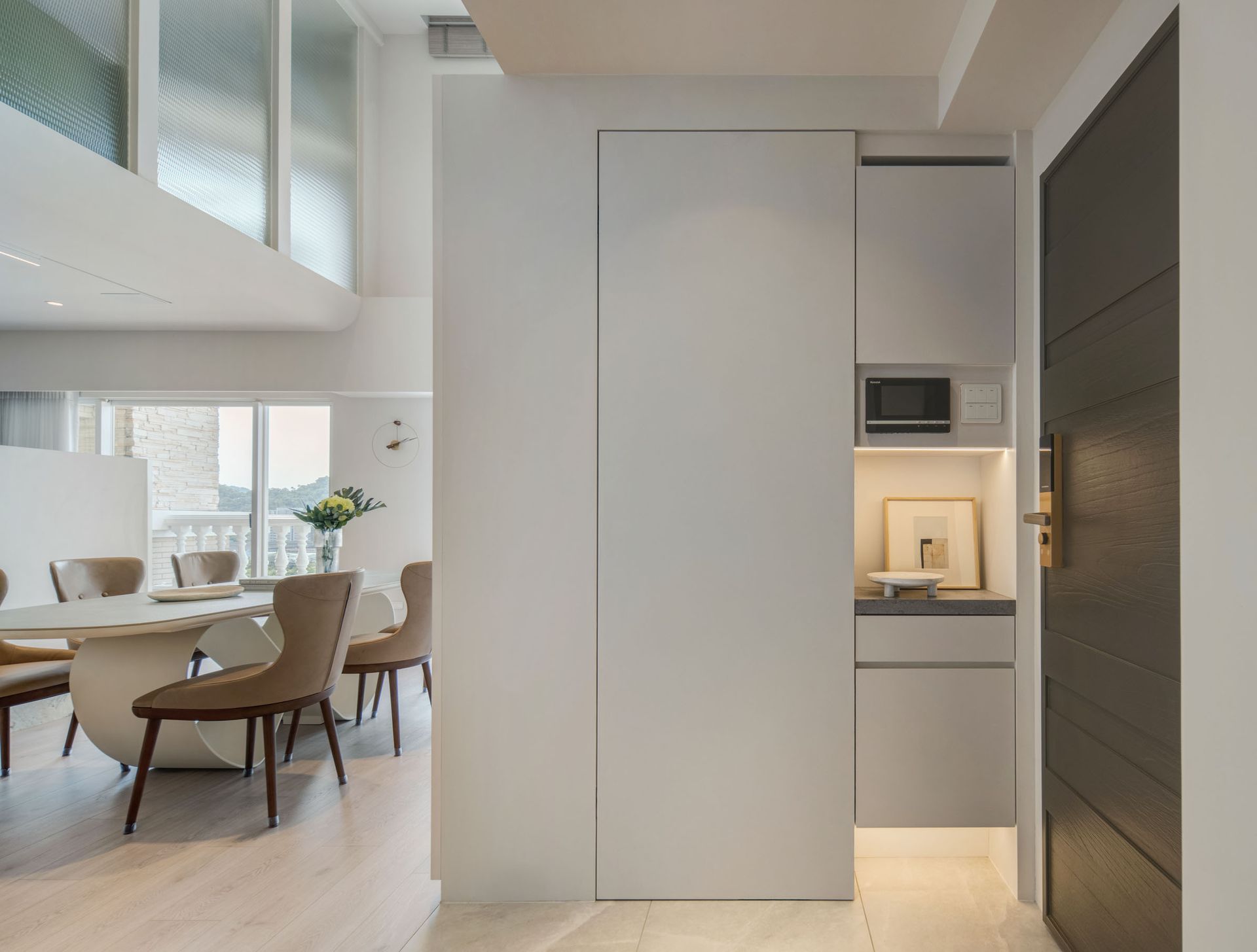 The homeowner’s handcrafted art tiles are creatively transformed into glowing “fruits” on the Tree of Life—delicate inserts of acrylic, dried flowers, and LED lighting embedded in the stair wall, weaving a poetic atmosphere of renewal and nature. In the living room, the sofa backdrop features semi-translucent jade stone combined with acrylic and backlighting, revealing crystalline textures that subtly shift with light. The walls throughout the home are painted in soft white with a hint of desaturated grey spray, imparting a minimalist, cool-toned luxury.