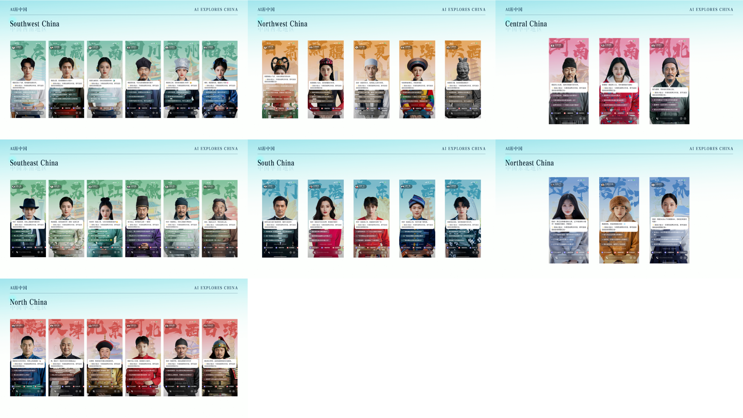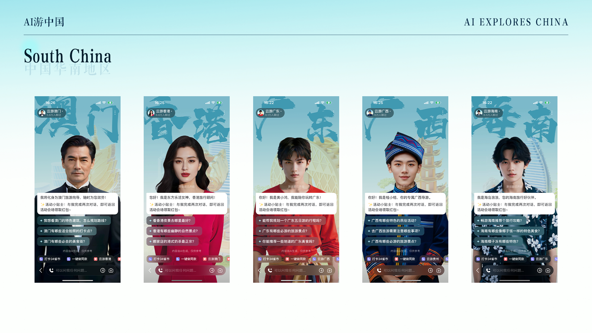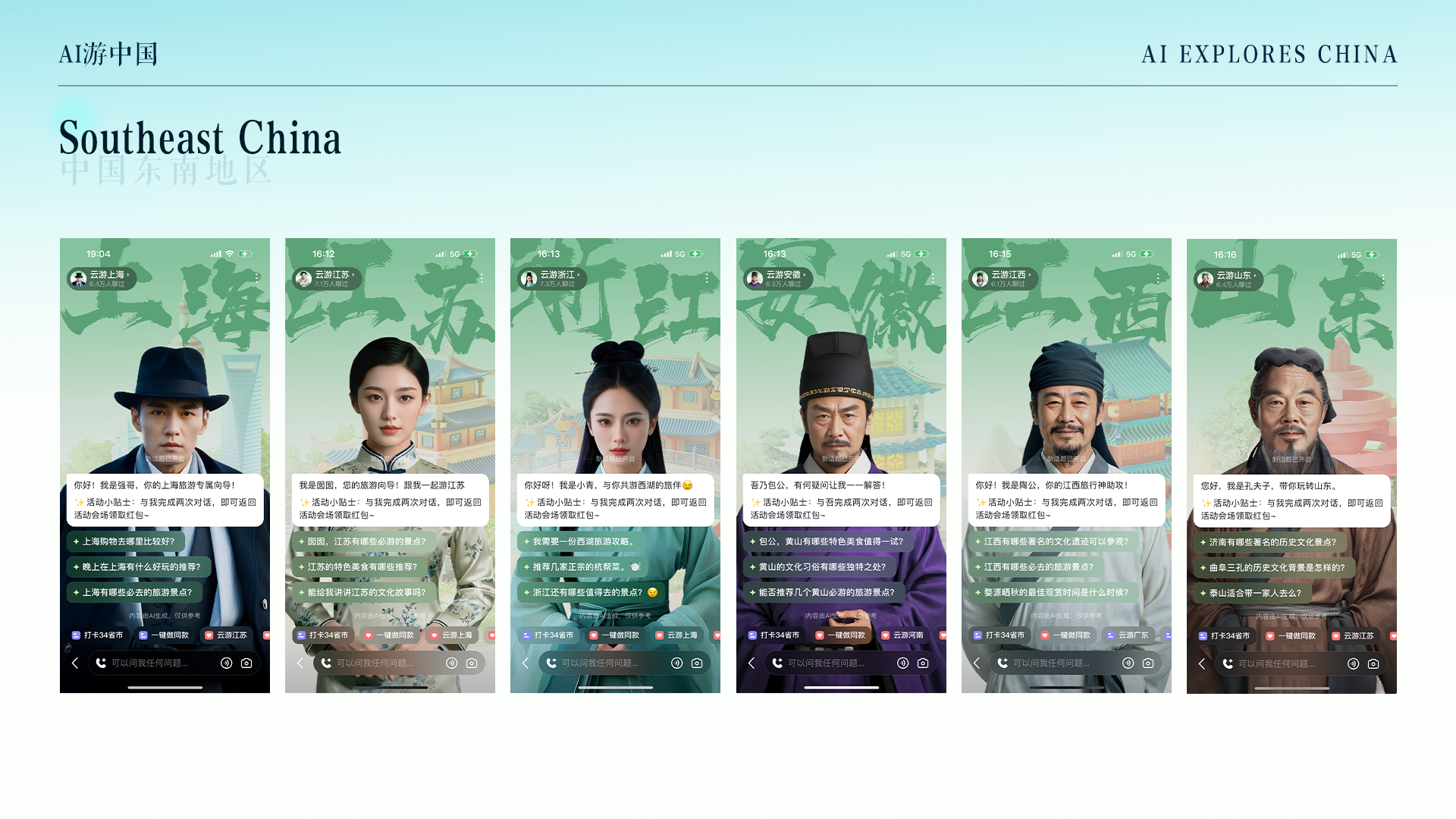 The design marries modern aesthetics with traditional art. Inspired by historical costumes and ethnic patterns, each AI agent features region-specific attire, from silver headdresses to imperial court accessories. Color palettes reflect the visual language of ethnic minorities, water towns, and historic dynasties, bringing personality and cultural depth to every digital figure.
