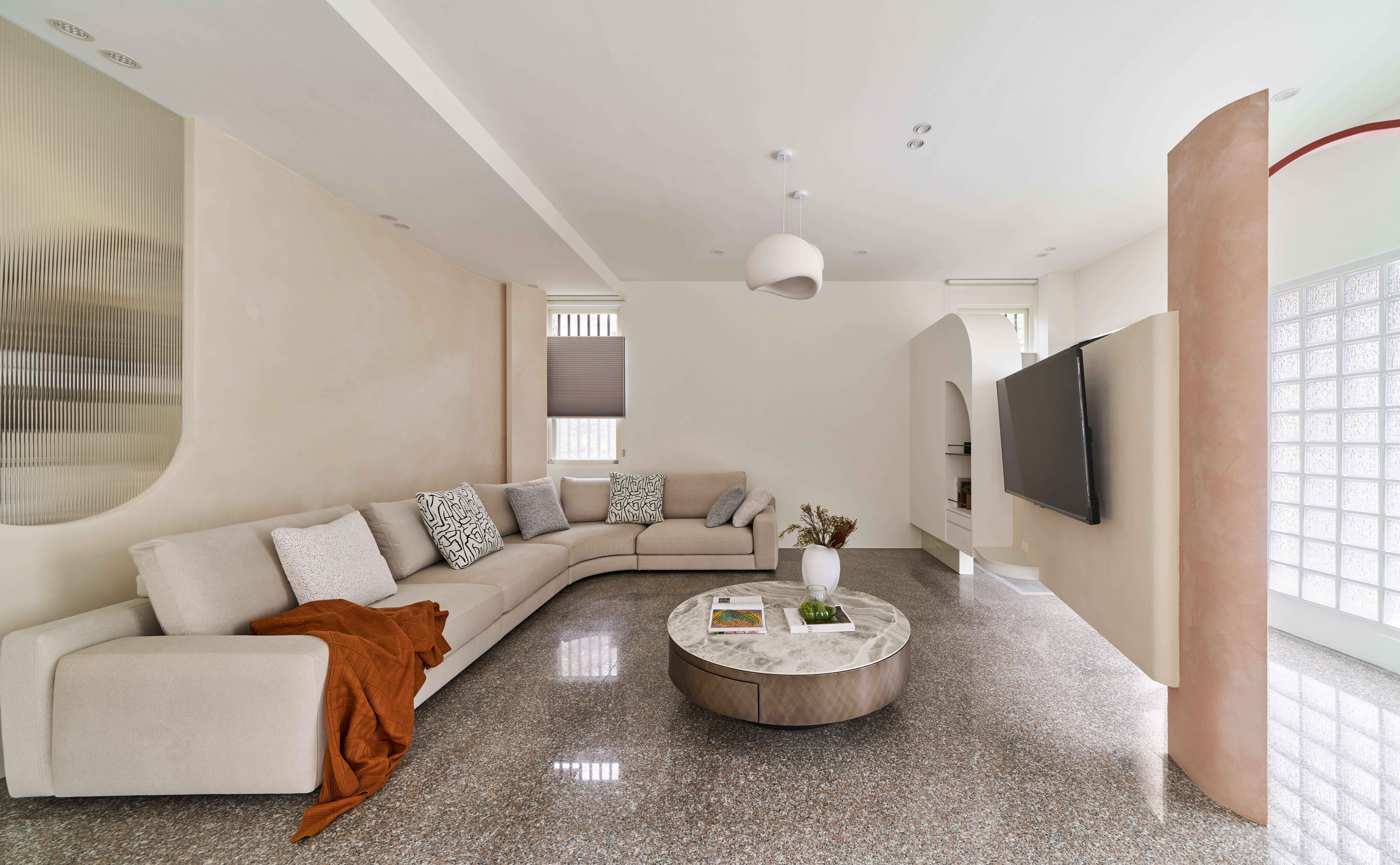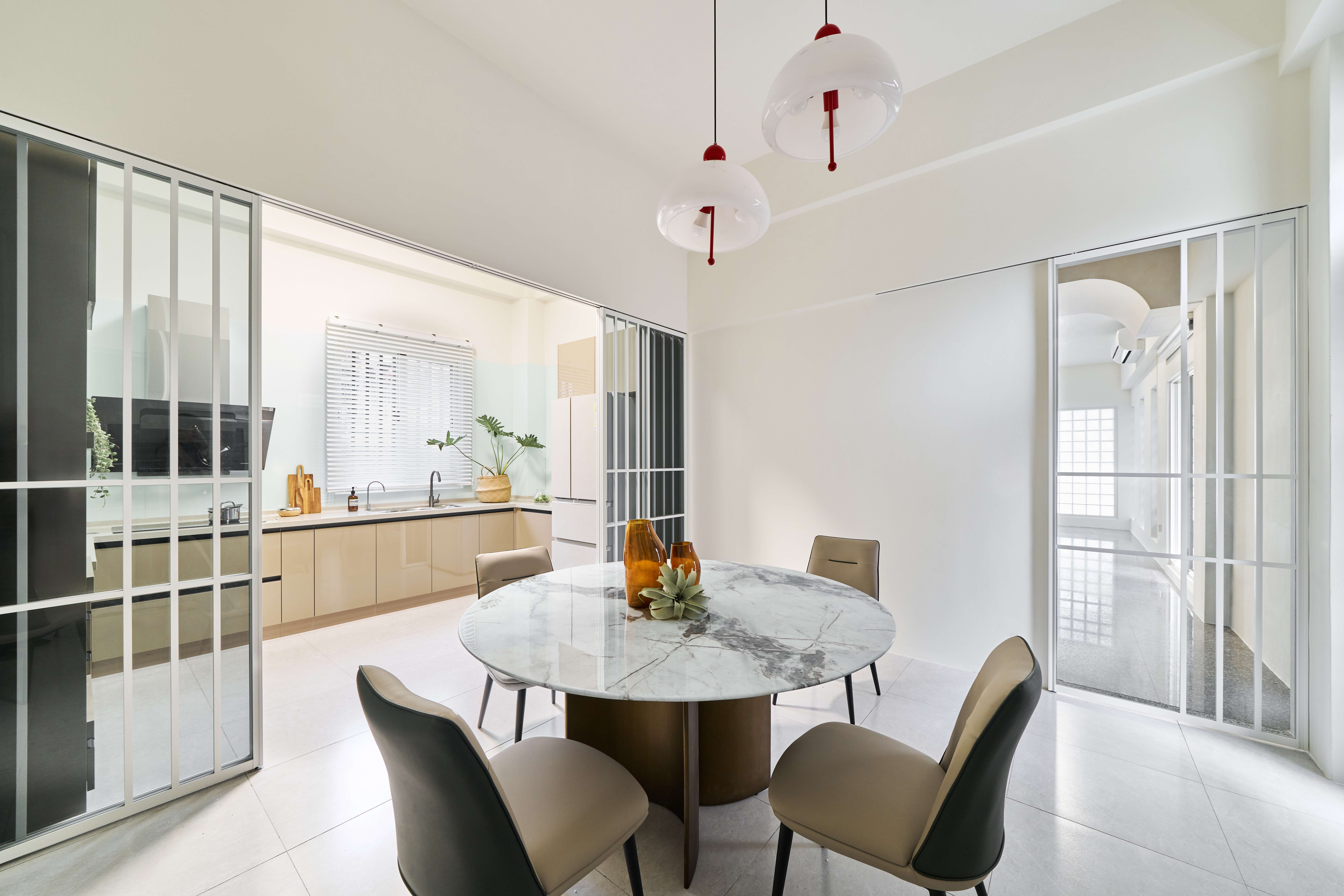 The design explores light, stillness, and spatial clarity. Original layouts were dismantled and softened through the use of glass bricks, curved transitions, and natural ventilation. A red-brick arced beam at the entrance gently defines the threshold between outer and inner realms, symbolizing the dual nature of the space: a house that welcomes, reflects, and exhibits.