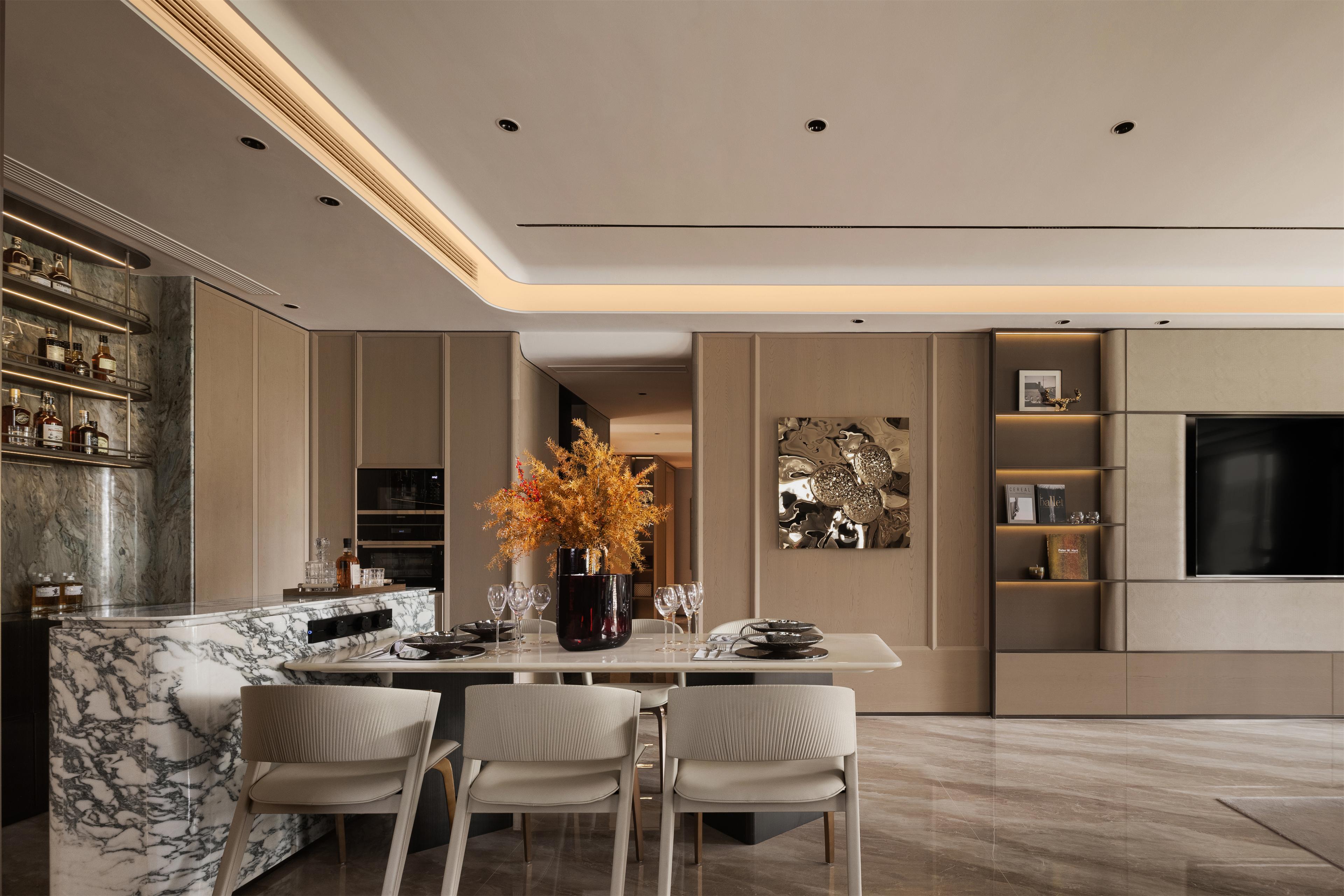 The space unfolds with an artistic sense of order and ritual. The marble wall evokes the natural rhythm of an ink painting, while concealed lighting and metallic lines create a balanced dialogue between rational precision and emotional warmth. The foyer follows the concept of coexistence of display and concealment, blending metal, wood, and stone textures to form a rhythm of openness and enclosure. Through subtle lighting transitions and meticulous detailing, the act of returning home becomes an immersive artistic experience.