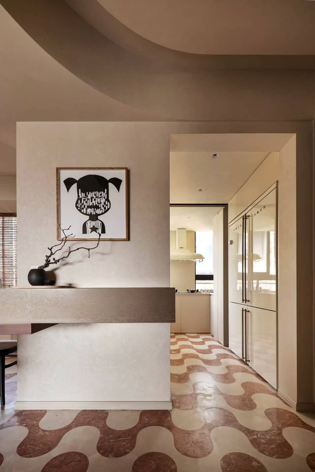 The central design concept is the contemporary deconstruction of vintage elements, avoiding stylistic clichés. Designers discarded classical ornate carvings, distilling French motifs through essential refinement and reduction. The key innovation lies in adopting Hector Guimard’s Art Nouveau "curvilinear language" to restructure space. Soft, continuous arcs (semi-circular stone floor inlays, curved ceilings) flow throughout. Walls and ceilings feature extensively hand-troweled French plasterwith deliberate ripple textures, juxtaposed against polished marble to simulate "nature-eroded" traces—translating Guimard’s organic forms into three-dimensional space.