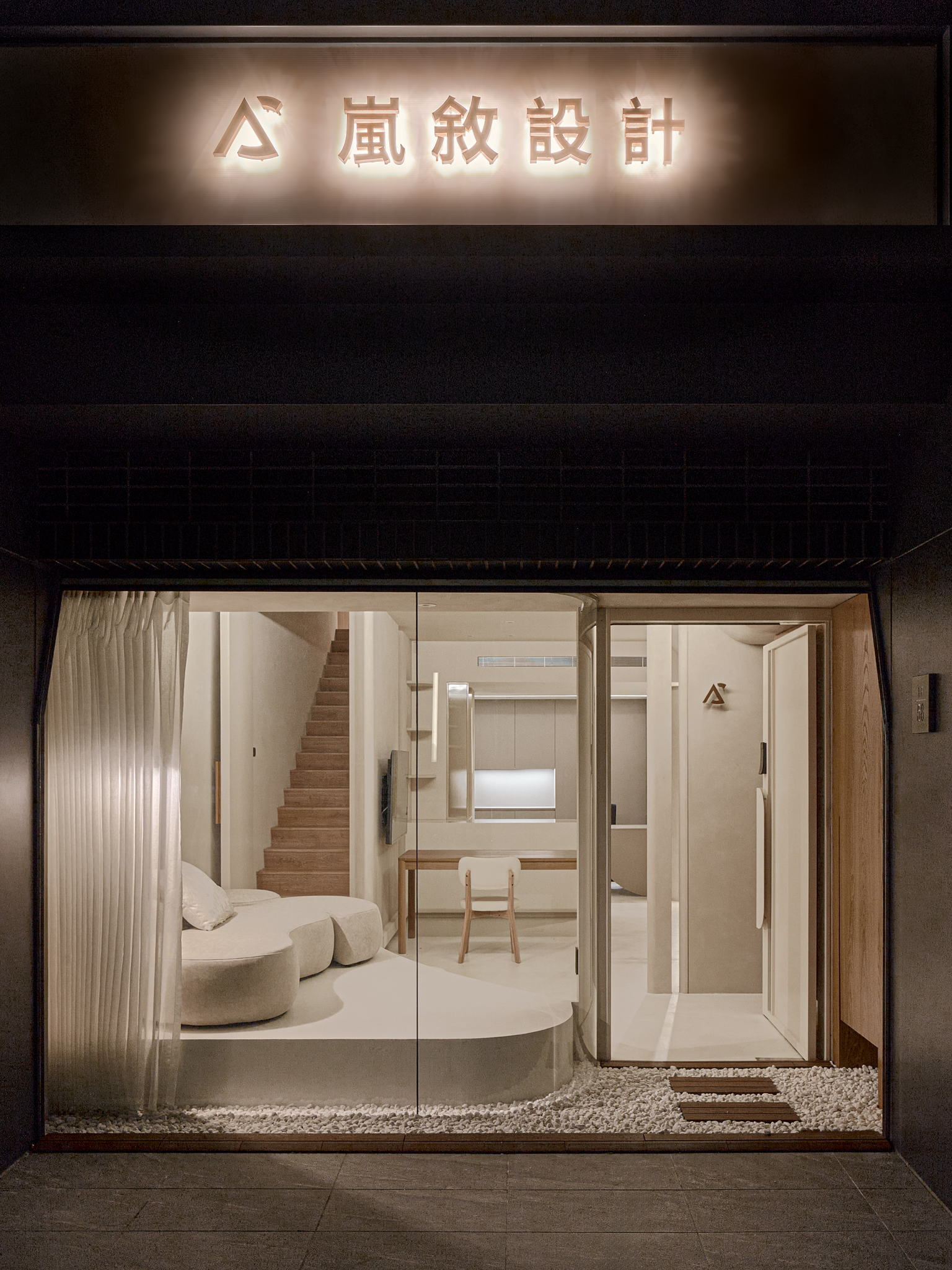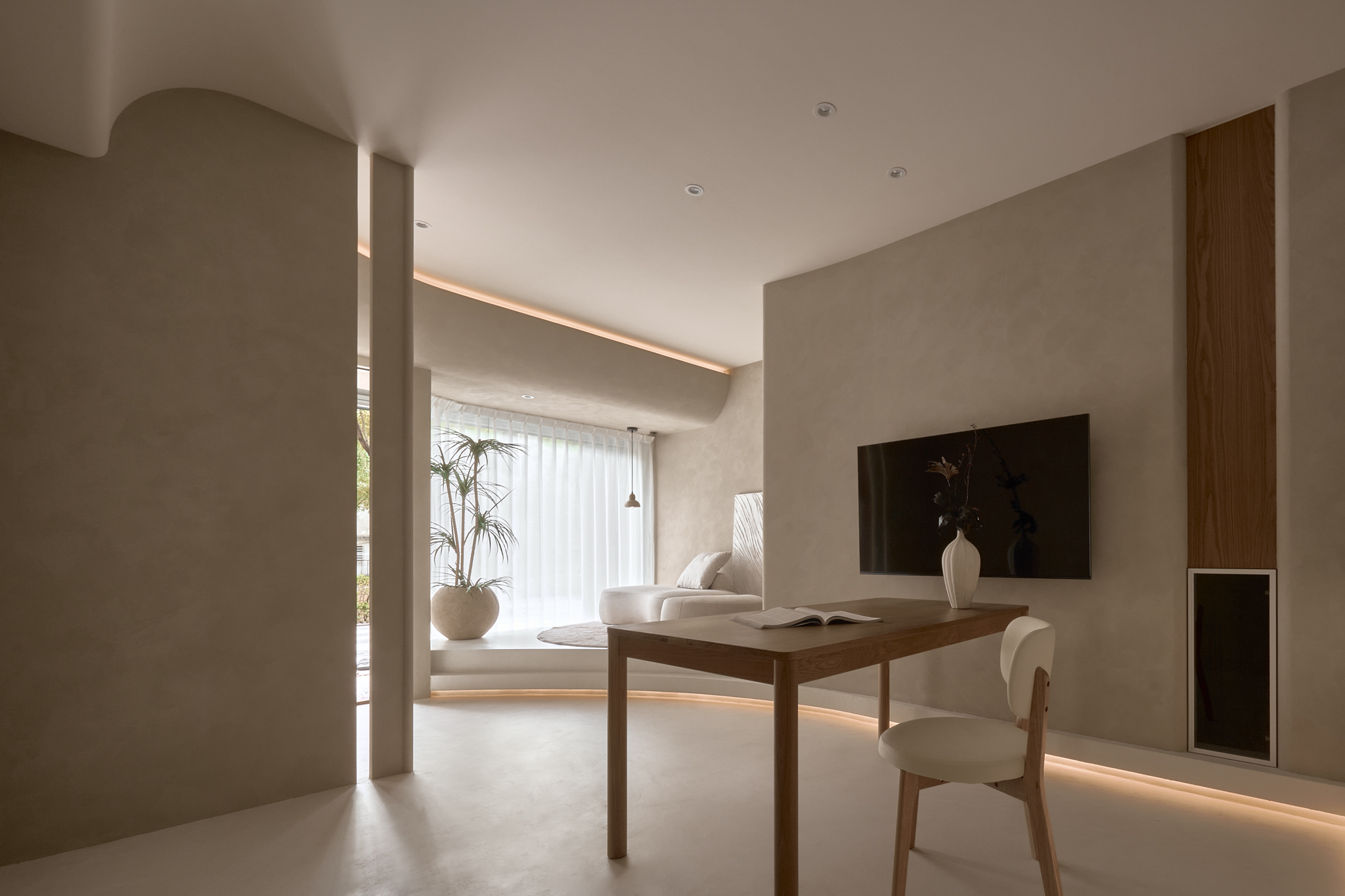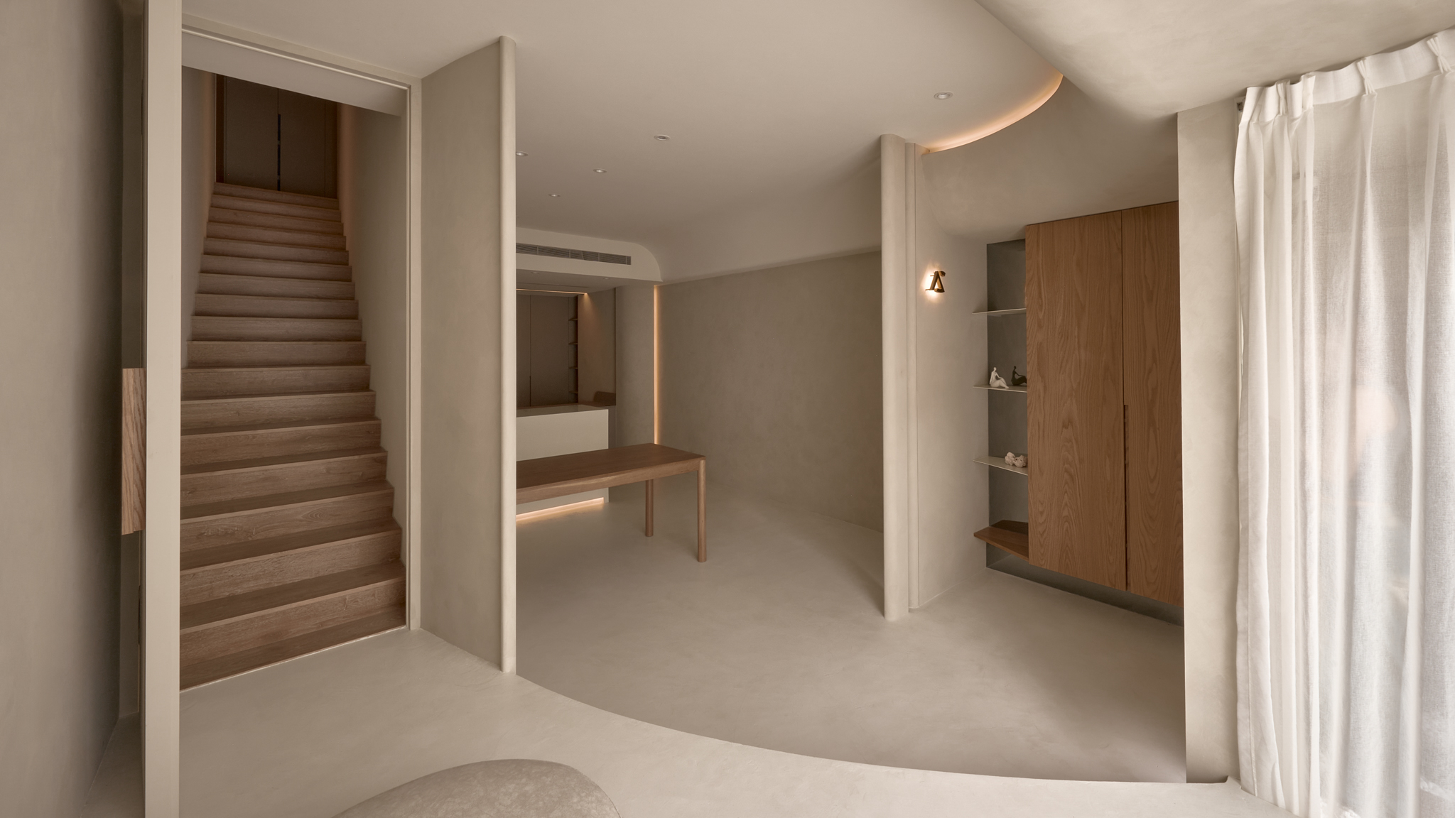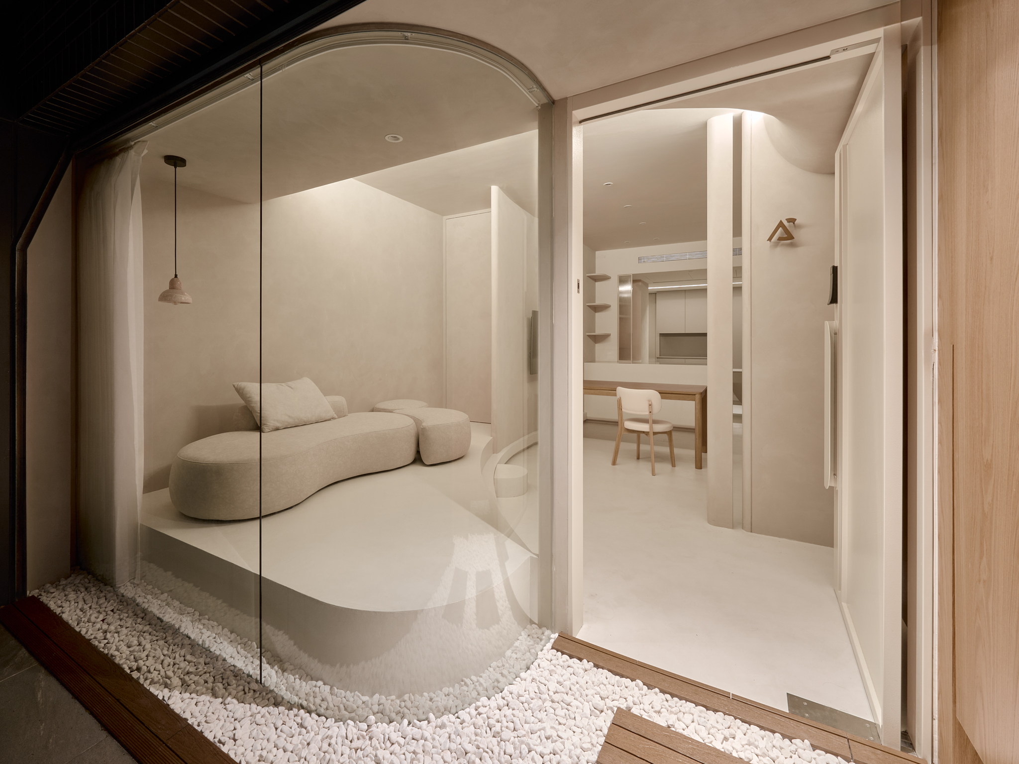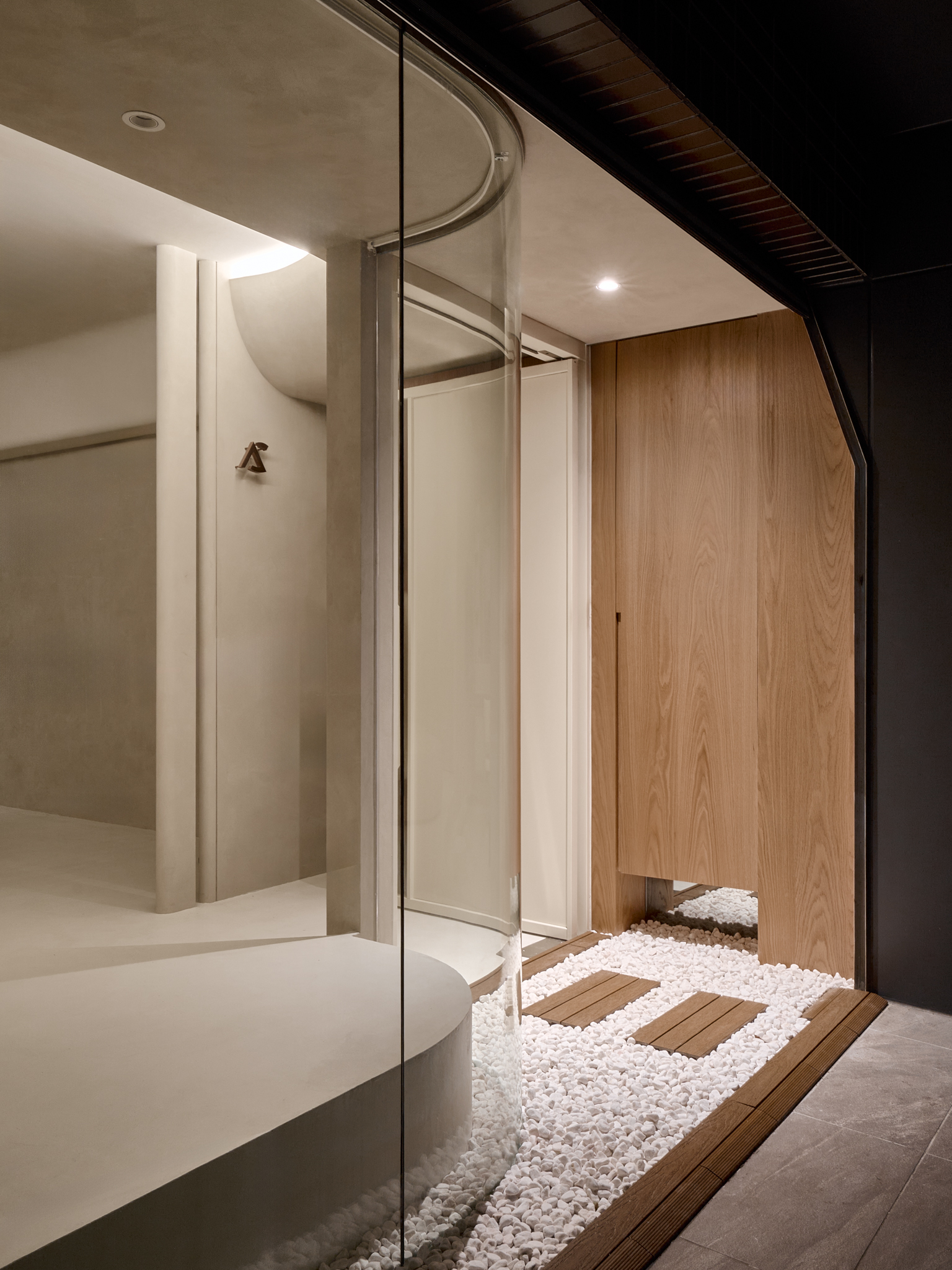 The entrance pathway, elegantly paved with smooth pebbles, creates a tranquil corridor that evokes the serene essence of a Japanese garden. As visitors reach the turning point, they are greeted by a captivating expanse of curved glass that seamlessly integrates the indoor space, fostering an inviting sense of fluidity and openness. Transitioning to the interior, one will notice that the floor boasts a rustic micro-cement finish, artfully restoring the area to its original, unblemished texture. Moreover, to navigate the height restrictions posed by the entrance roll-up door, the ceiling gently transforms into a graceful curved screen. This design choice not only mirrors the contours of the floor but also establishes a harmonious spatial language that unifies the entire environment.