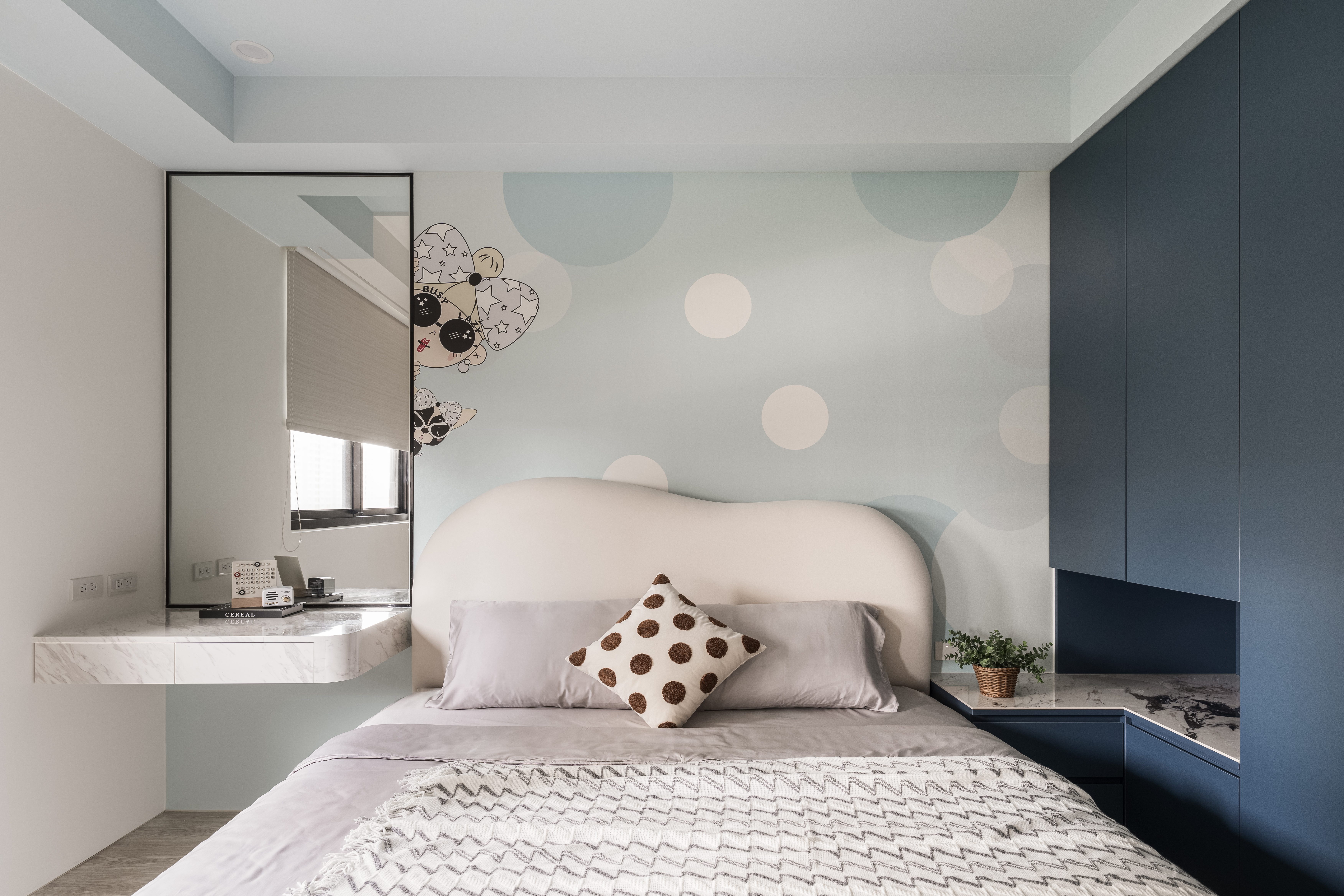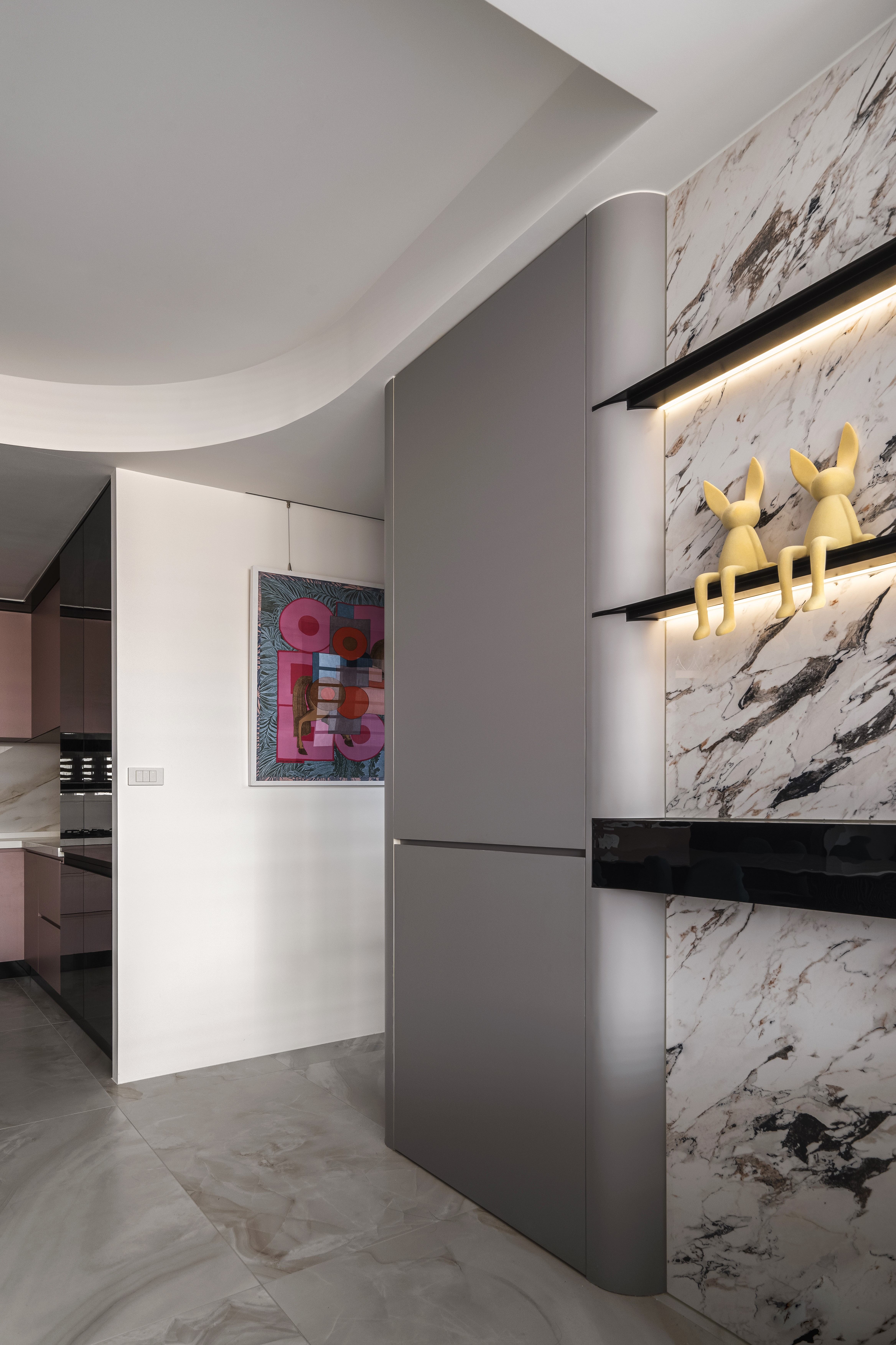 Curved lines soften architectural edges, echoing the tenderness of the color scheme, while curated displays of designer toys and collectibles add a touch of playful artistry—where whimsy meets elegance in perfect harmony.