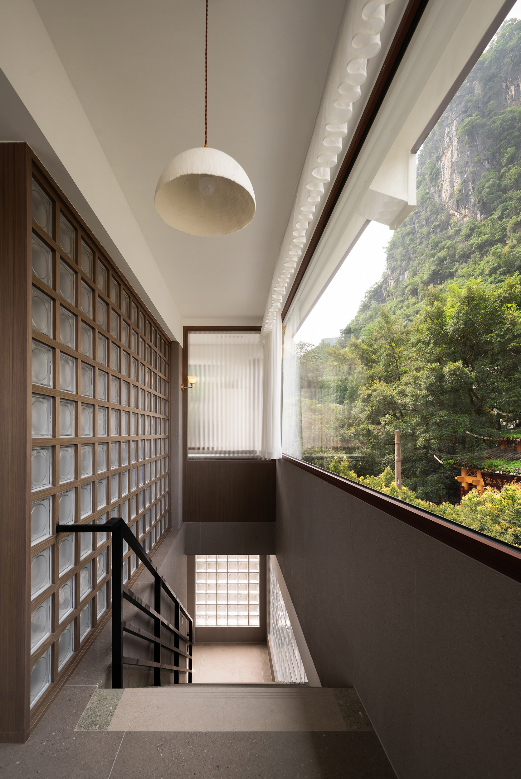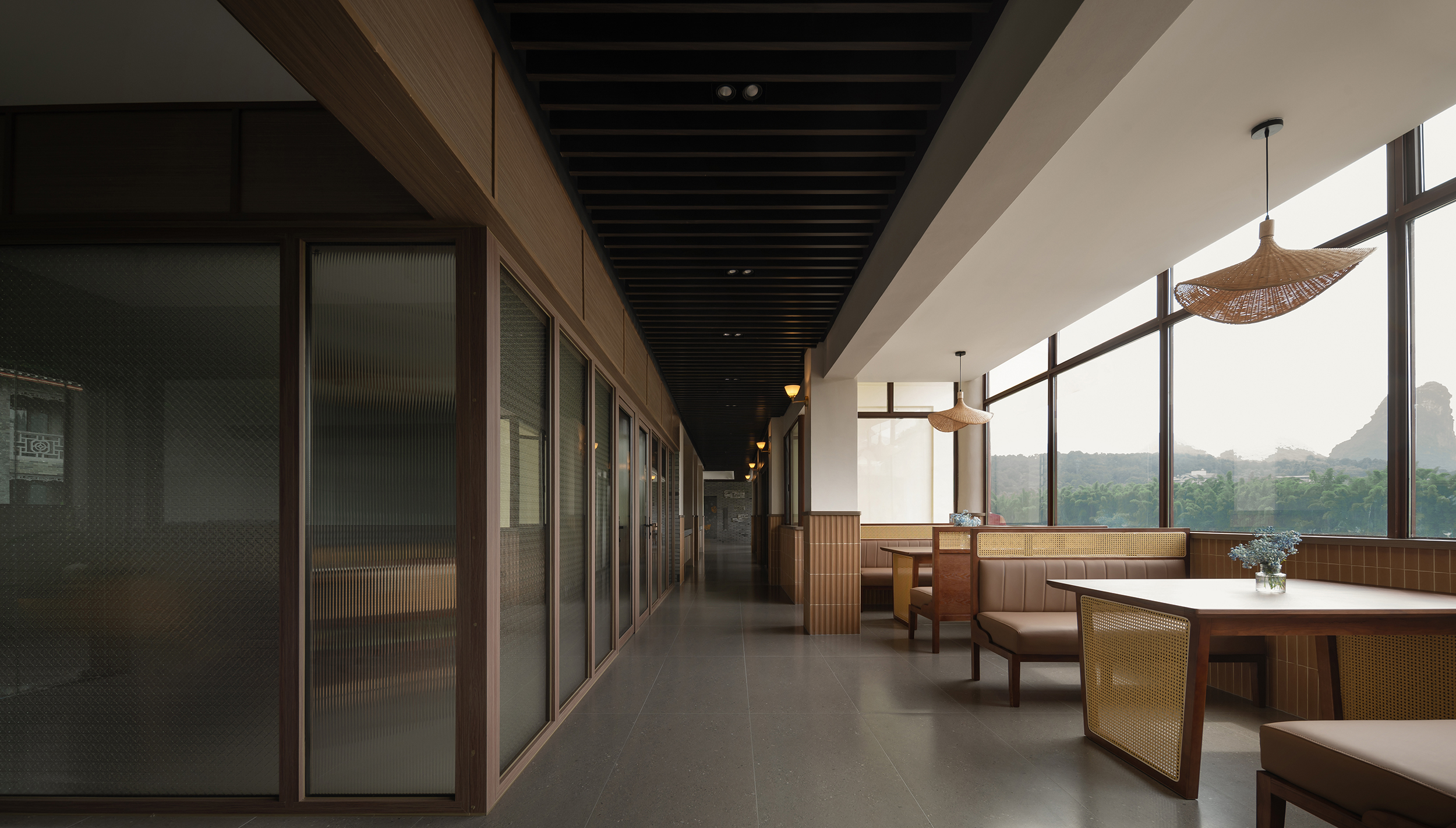 Highlights include the experience of “shifting scenery with each step”: on the B1 level, continuous structural columns were unified by a sequence of arches that transform fragmentation into rhythmic circulation; the Cultural & Creative Venue employs red patterned bricks and indigo motifs to reflect ethnic culture; and dining areas use gray brick, red brick, and indigo to establish a warm, inviting atmosphere. The preserved ancient wall frames vistas with the distant mountains, creating a new cultural landmark. The project elevates both functional and cultural dimensions, enabling visitors to experience Yangshuo’s depth through the interplay of light, shadow, and history.
