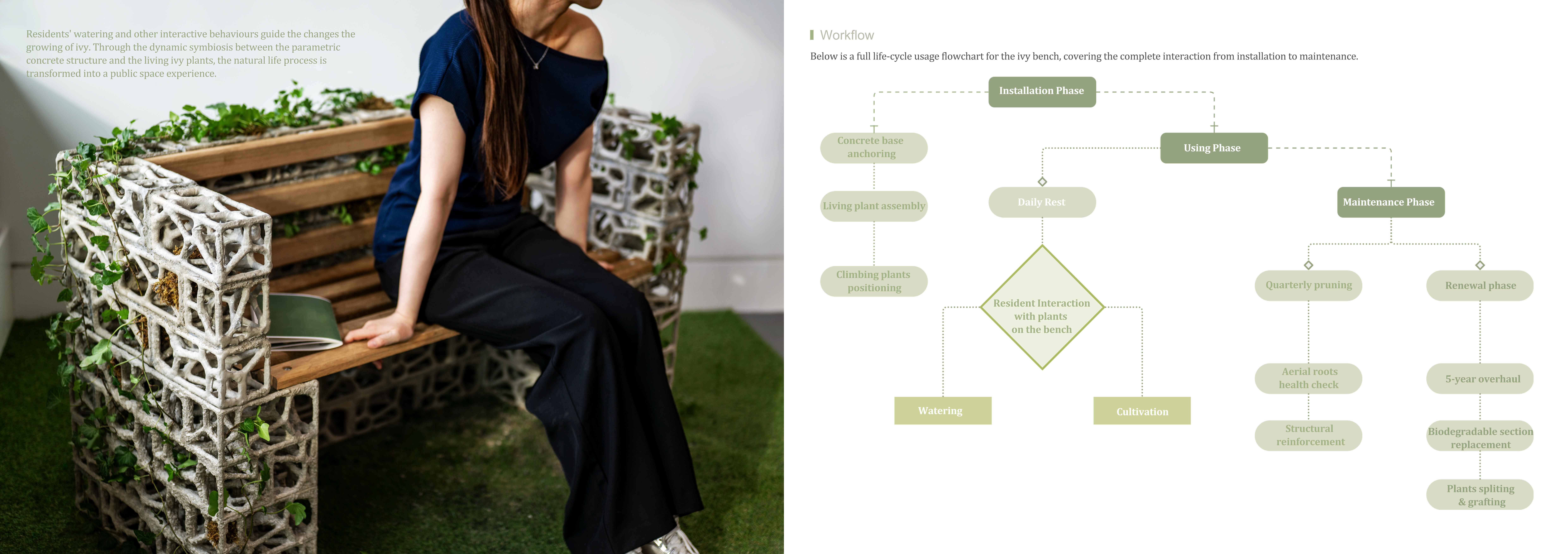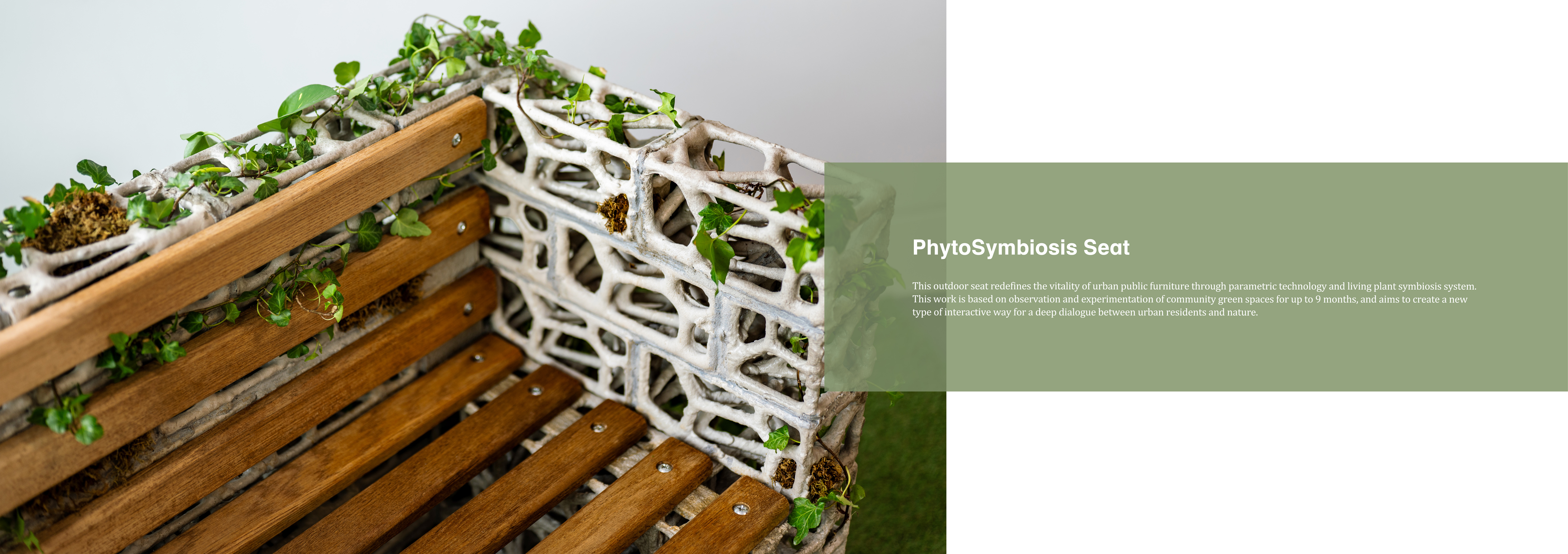 The PhytoSymbiosis Seat redefines the vitality of urban public furniture through parametric technology and living plant symbiosis system. This work is based on observation and experimentation of community green spaces for up to 9 months, and aims to create a new type of interactive way for a deep dialogue between urban residents and nature.