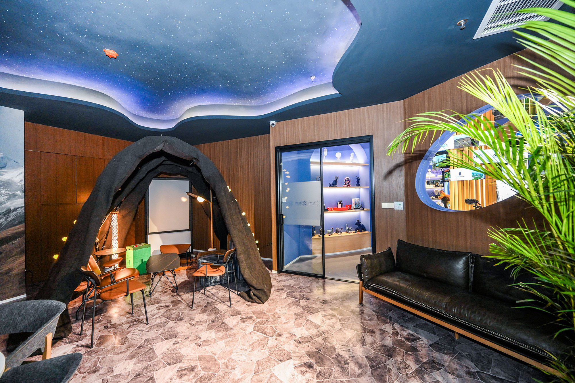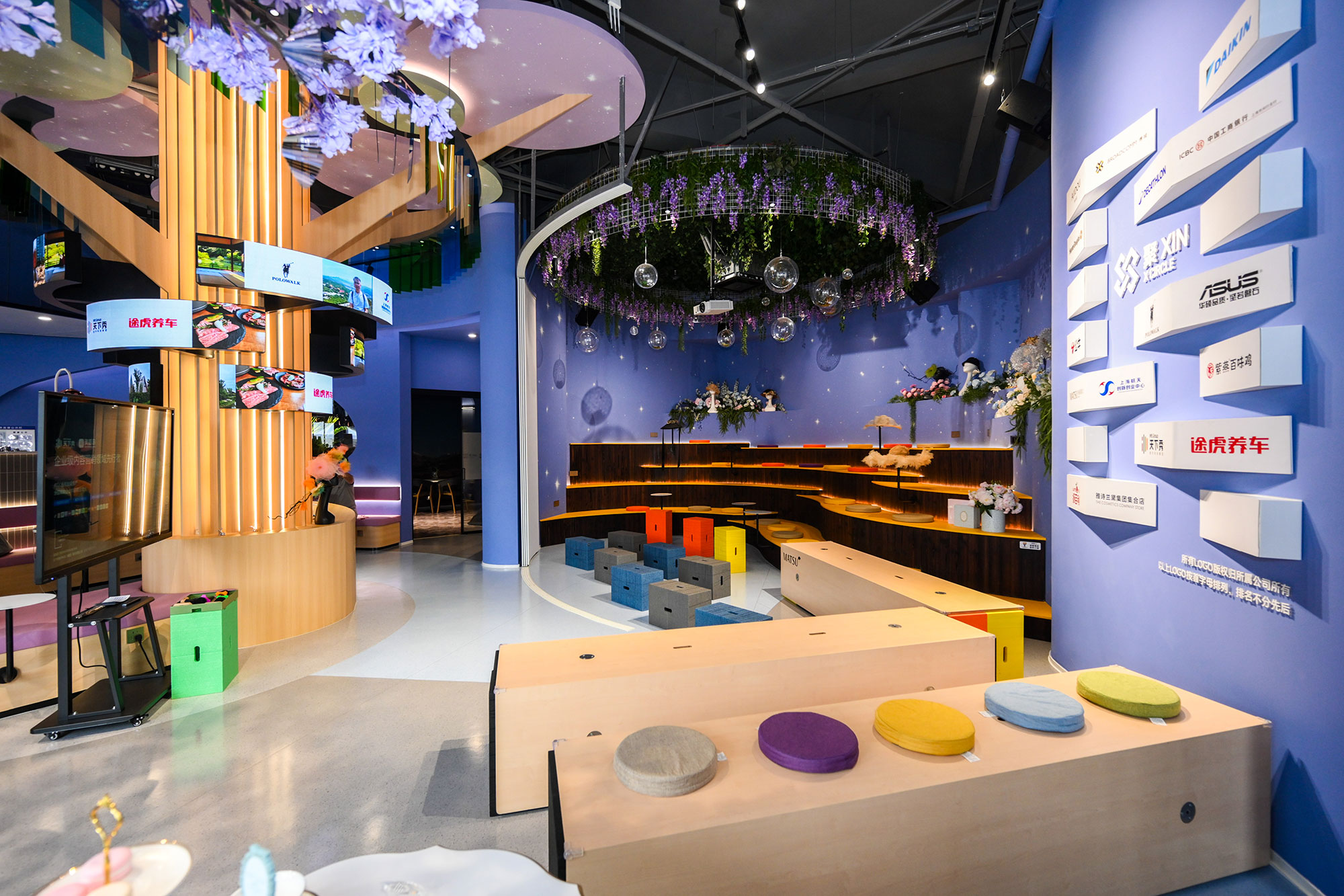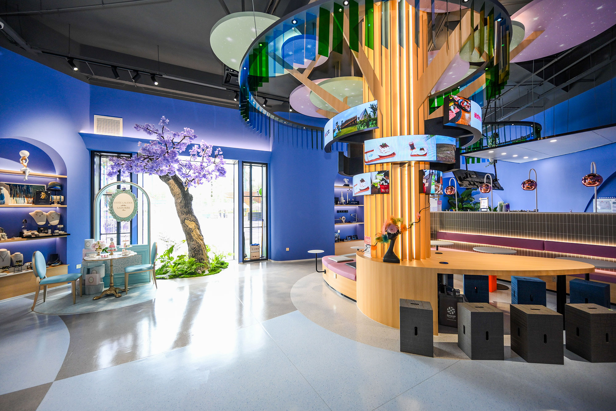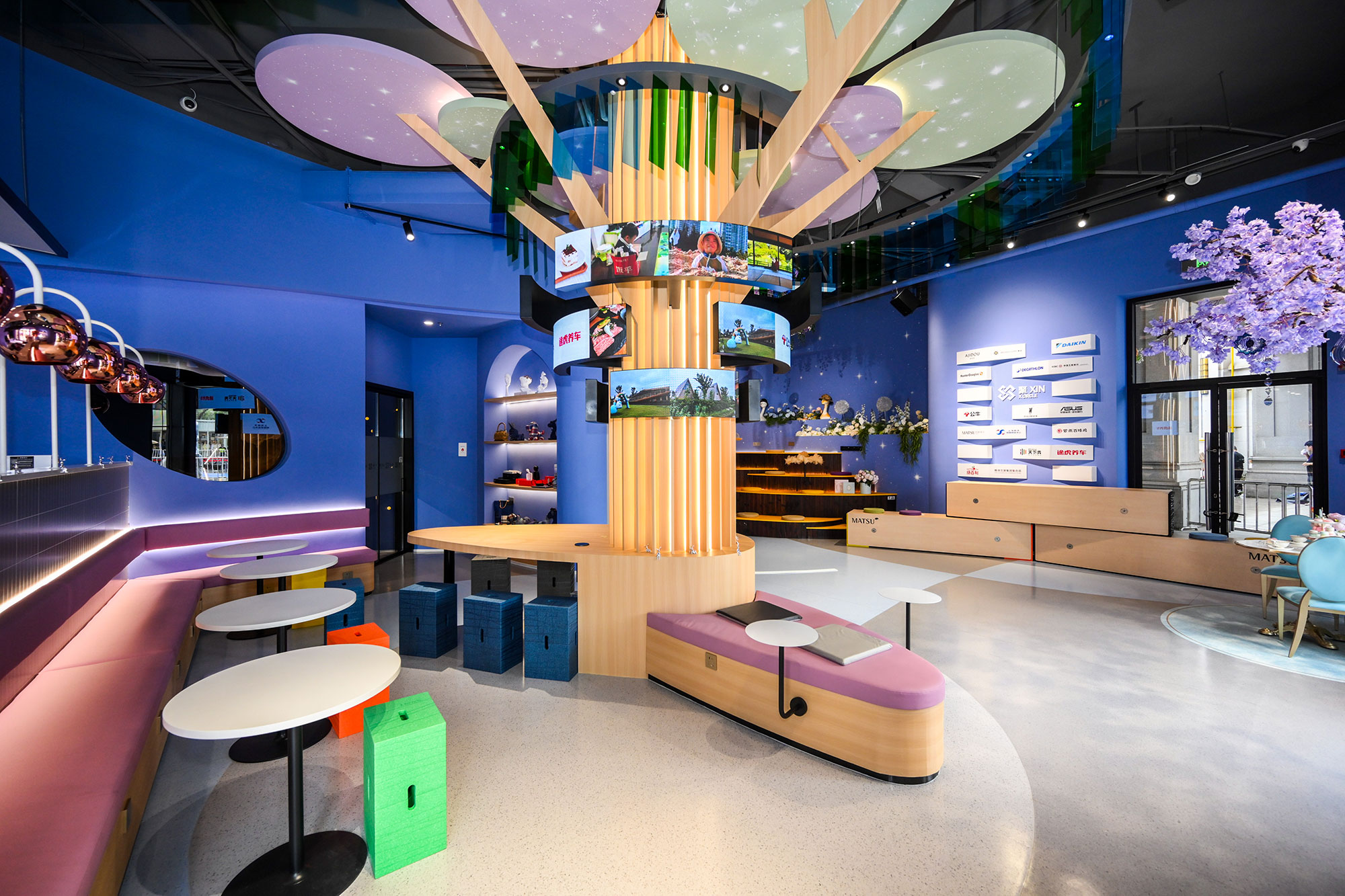 At the heart of the space stands a “Future Life Tree,” its trunk surrounded by a circular tea and coffee bar. Between its branches hang interactive installations like personal photo displays—visitors scan a QR code, upload a photo, and see it displayed as part of the tree. During the day, this area is a sun-dappled forest-like tea room as sunlight filters through colorful glass panels. At night, it transforms into the “XIN Universe” with deep purple lighting and immersive sound from the tree’s built-in speakers.
