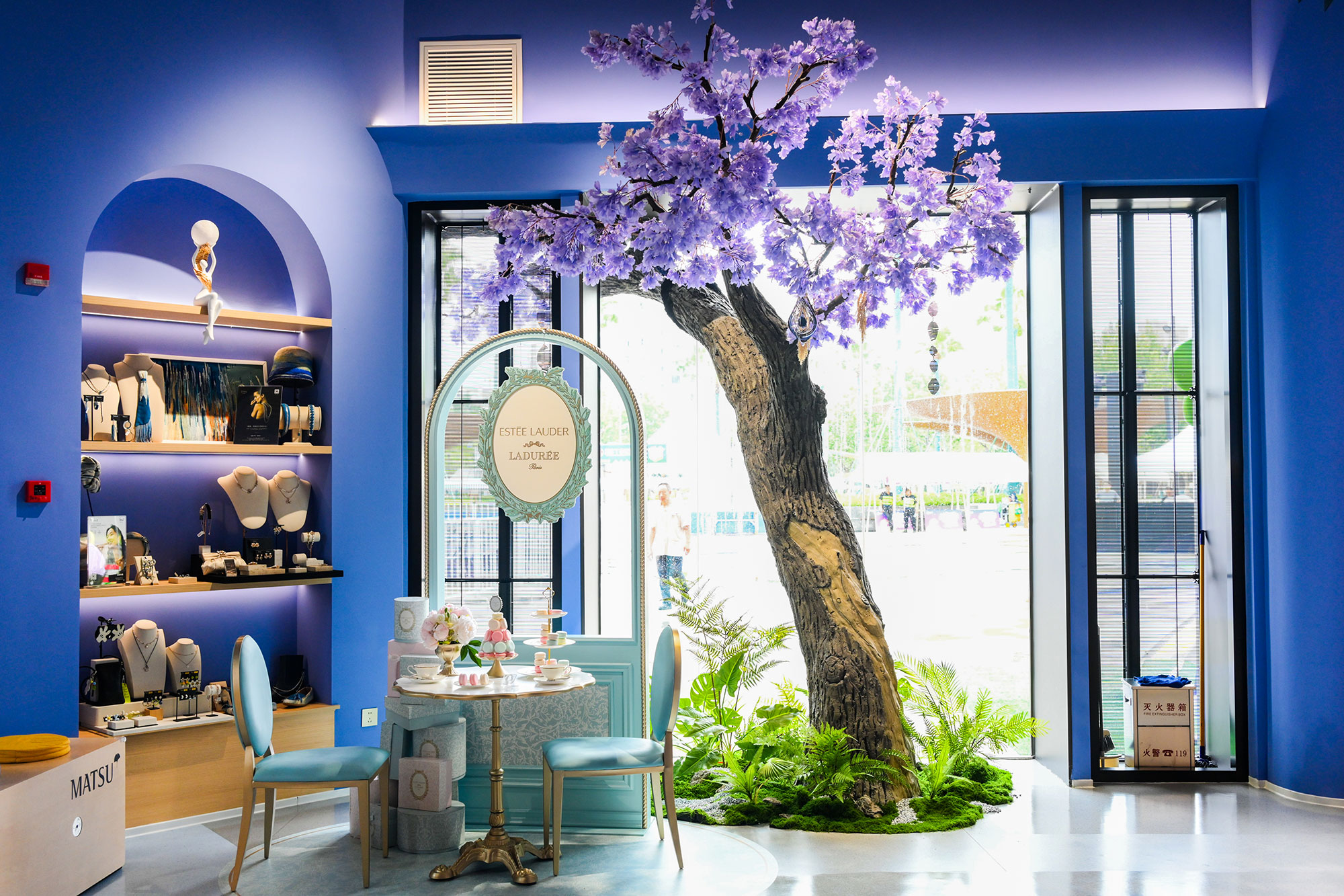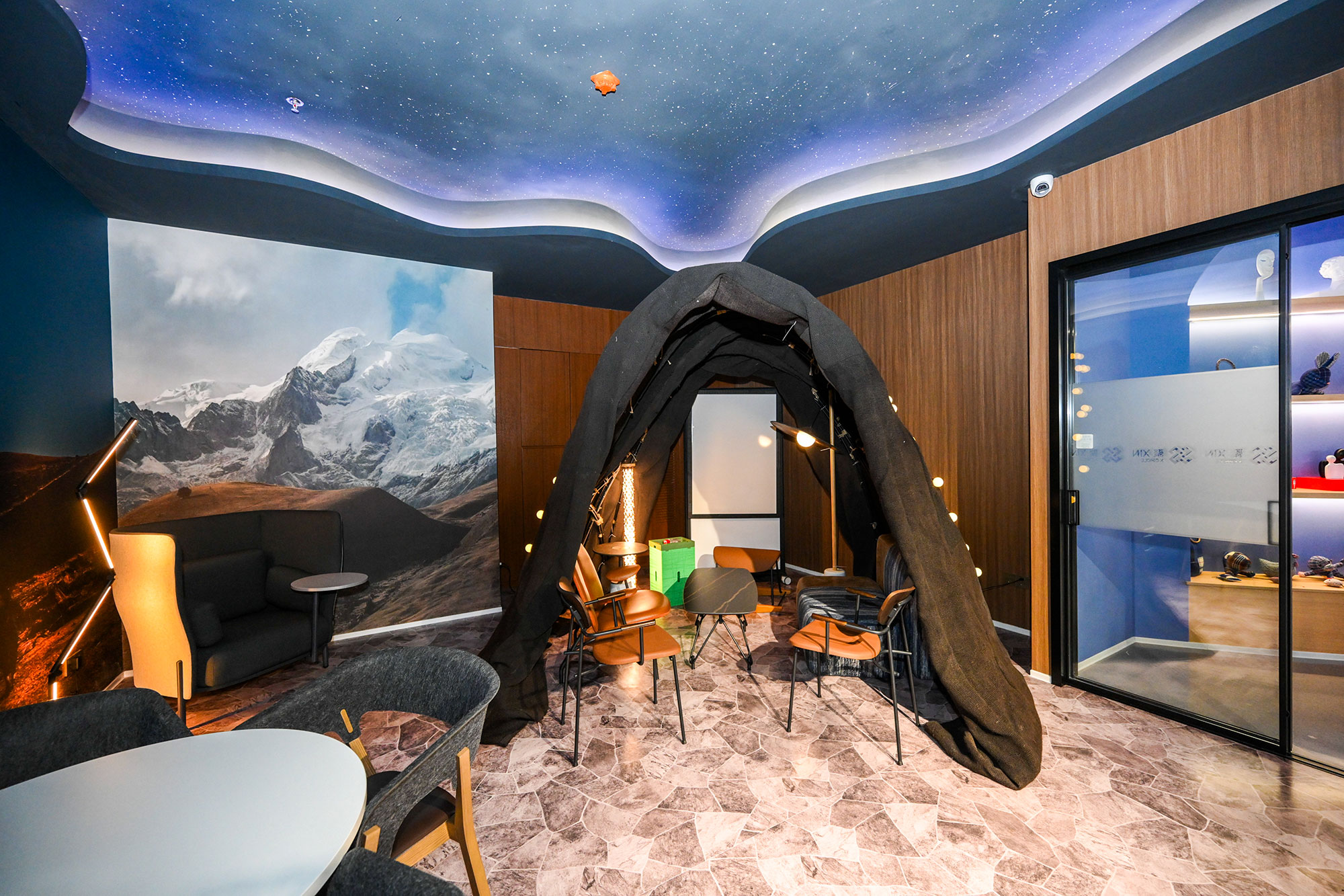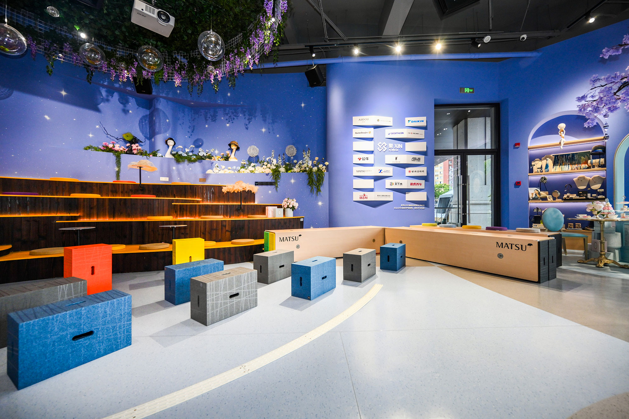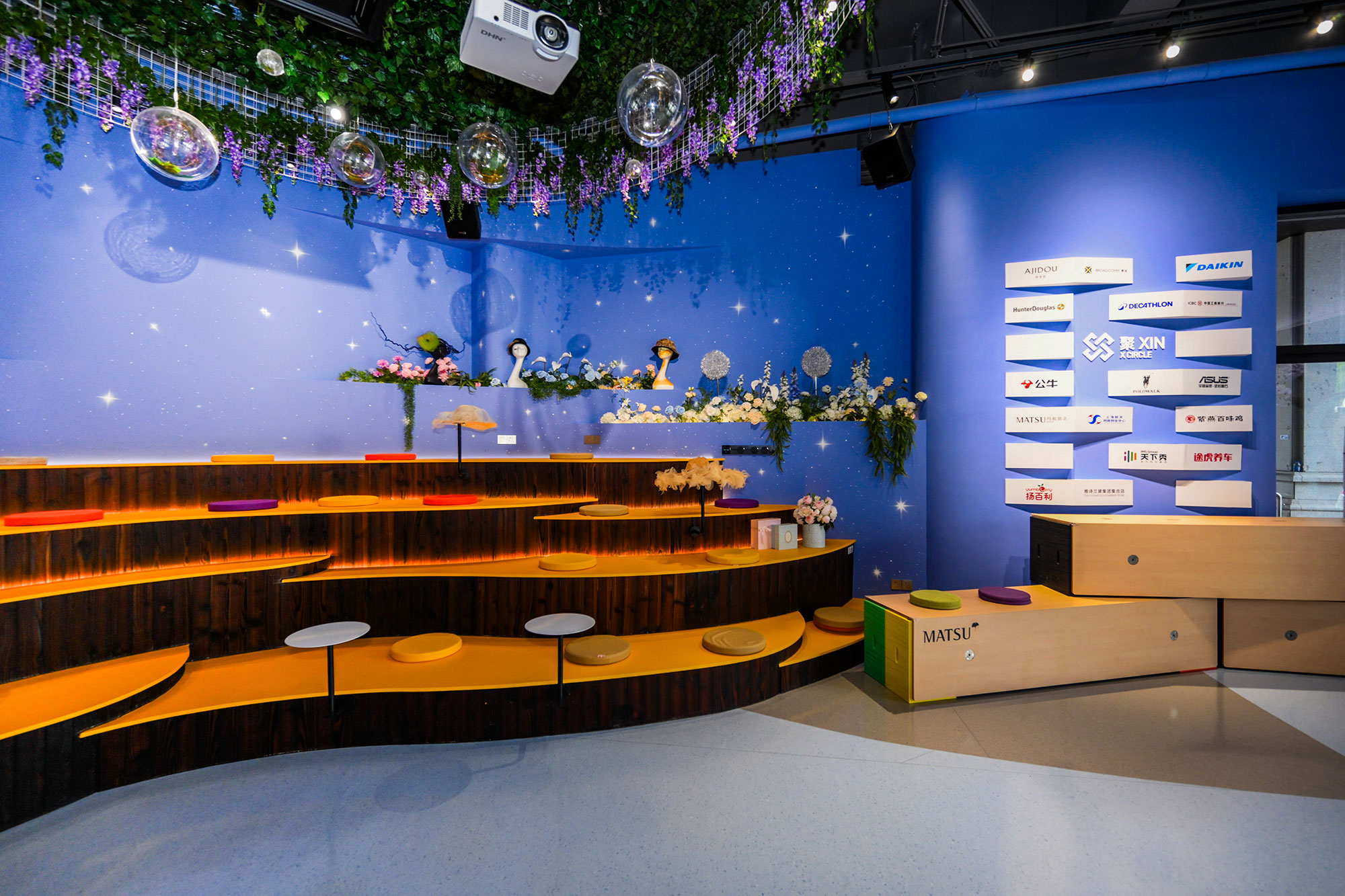At the heart of the space stands a “Future Life Tree,” its trunk surrounded by a circular tea and coffee bar. Between its branches hang interactive installations like personal photo displays—visitors scan a QR code, upload a photo, and see it displayed as part of the tree. During the day, this area is a sun-dappled forest-like tea room as sunlight filters through colorful glass panels. At night, it transforms into the “XIN Universe” with deep purple lighting and immersive sound from the tree’s built-in speakers.