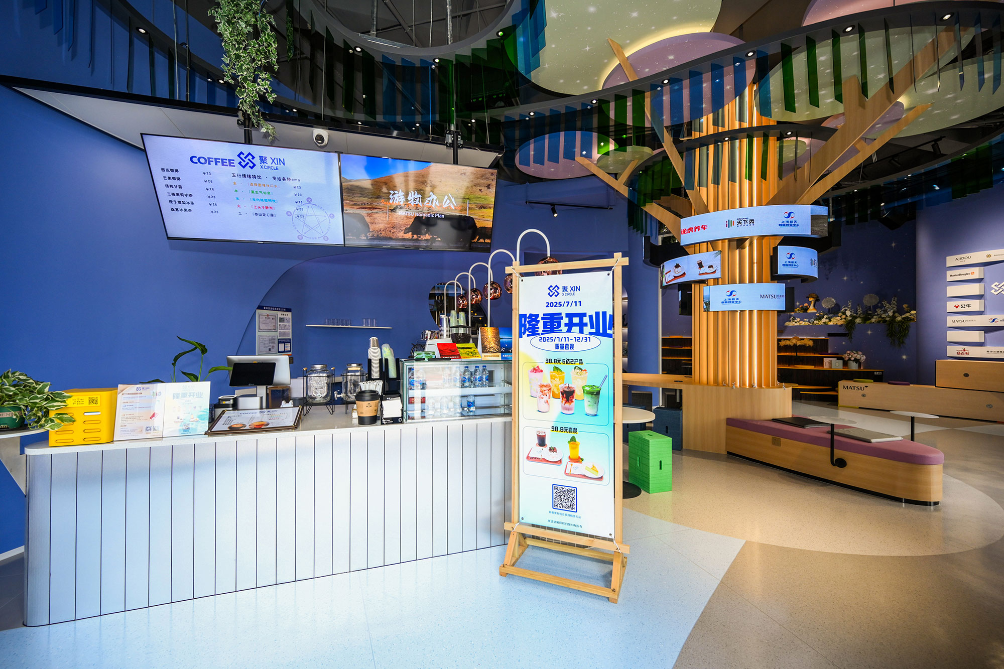 The first thing visitors see upon entering JuXIN is a flowing display of purple lighting. This café area, called the XIN Species Energy Station, offers drinks that deliver surprises far beyond flavor. Even more exciting is the “Five Elements Mood Drinks” series, inspired by the traditional Chinese elements—metal, wood, water, fire, and earth—each representing a specific emotional state often felt in modern life.