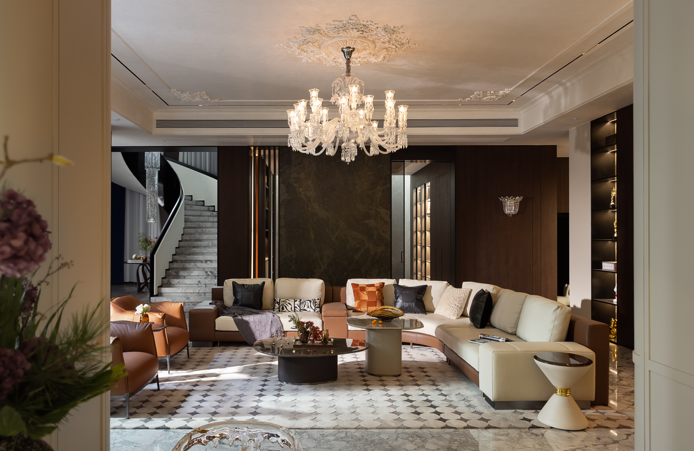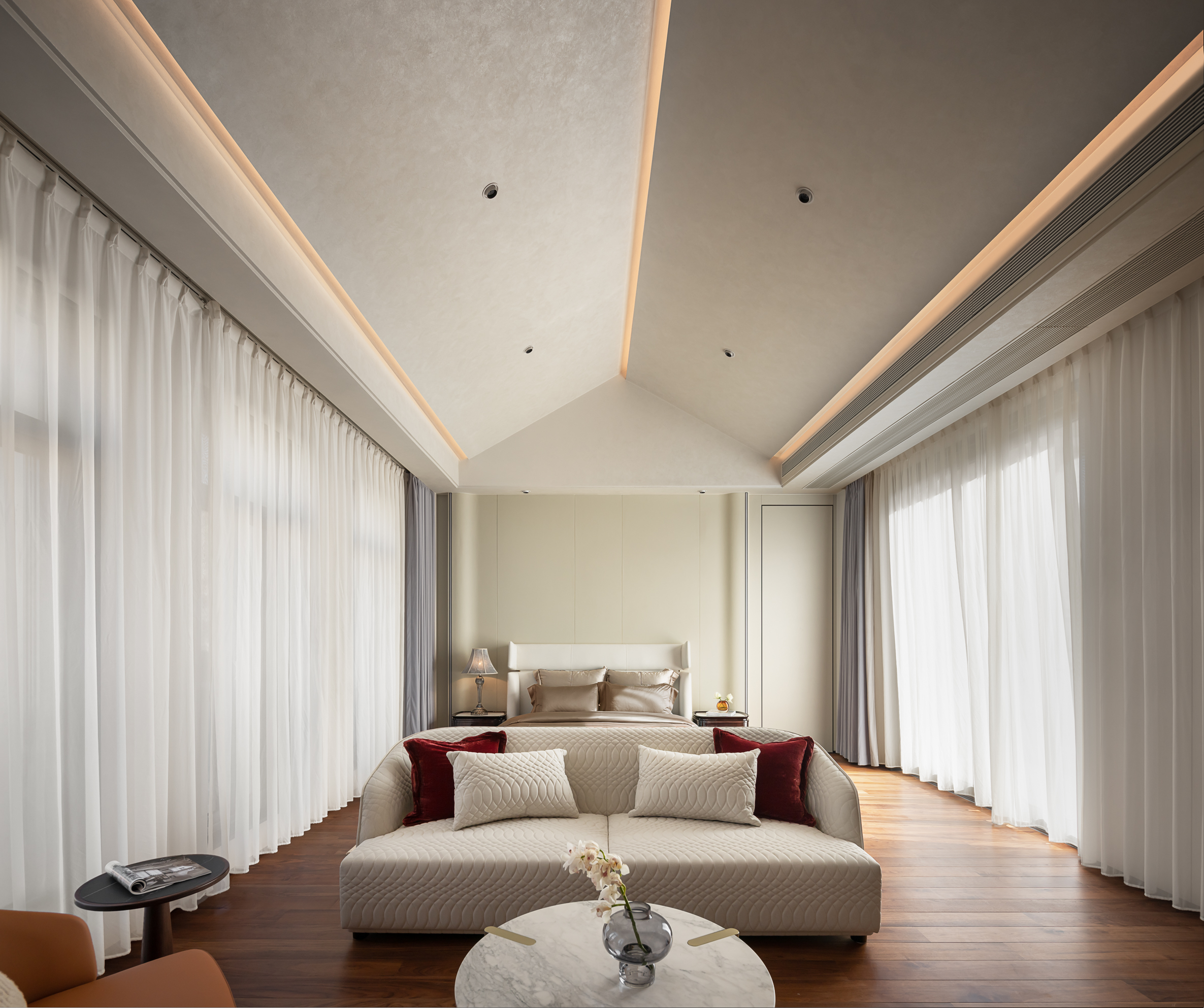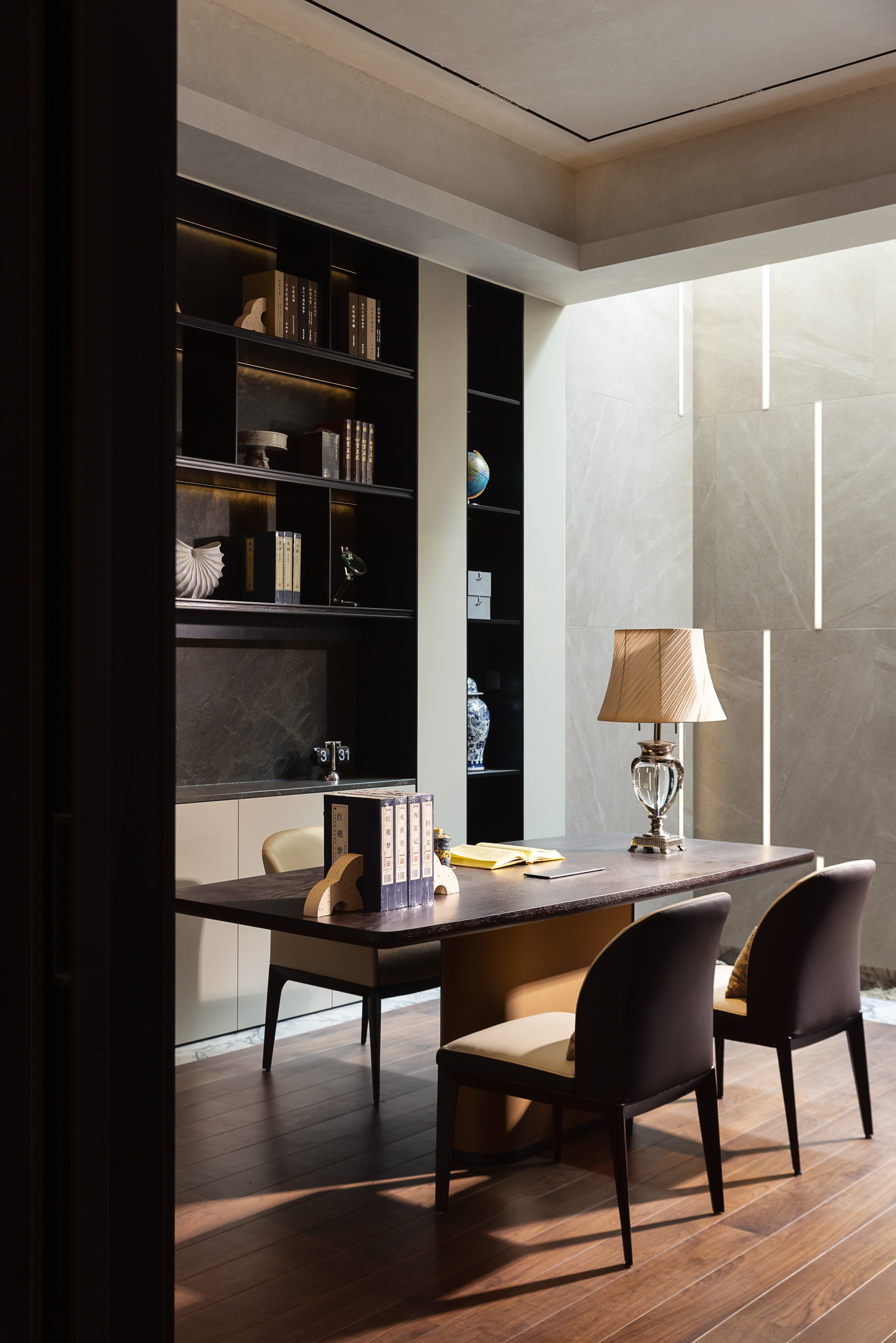 Located in the North Zhenxing Road area of Linping, this project occupies a rare 640-acre low-density residential community, with a plot ratio of just 1.15 and 40% greenery coverage. Surrounded by a well-connected transportation network, it achieves a refined equilibrium between urban accessibility and tranquil seclusion—creating a true “mountain retreat within the city.” The overall design is grounded in the philosophy of “quiet luxury,” embracing natural textures, elegant restraint, and spatial poetry to craft a modern sanctuary for the soul. This thousand-square-meter residence takes light as its narrative guide—morning rays penetrate linen sheers, drawing ethereal shadows across micro-cement walls, while dusk brings the awakening of recessed lights like celestial constellations. The interplay of bespoke brass details and Italian stone veins reflects a subtle dialogue between artistry and atmosphere. This residence becomes a spiritual cartography of contemporary refined living—evoking the quiet confidence and introspective charm of a modern gentleman. The architectural language blurs boundaries between function and emotion: chandeliers descend like crystalline meteor showers, staircases ripple like rivers of light, and curved marble handrails cradle flowing illumination. The open-plan living, dining, and wine-tasting zones are unified through a palette of leather, timber, and stone, where strategic color accents enhance visual rhythm. Bedrooms are enveloped in warm neutrals, with high-back leather beds embodying comfort and quiet grandeur. Beyond, a private lounge and whimsical children’s rooms reflect exclusivity, imagination, and familial warmth. The project pioneers an innovative synergy between “quiet luxury aesthetics” and “ecological intelligence,” redefining elite living through spatial storytelling and material sensitivity. It transcends material excess, favoring thoughtful detailing, sustainable openness, and lasting durability. The open layout maximizes natural ventilation and daylight, reducing energy reliance while reinforcing environmental consciousness. More than a luxurious dwelling, this project is a vessel of emotional resonance—where light, silence, and space converge to awaken inner calm and elevate the daily ritual of living. It realizes Louis Kahn’s vision of architecture as “the thoughtful making of space,” where the physical becomes spiritual, and the ordinary becomes poetic.