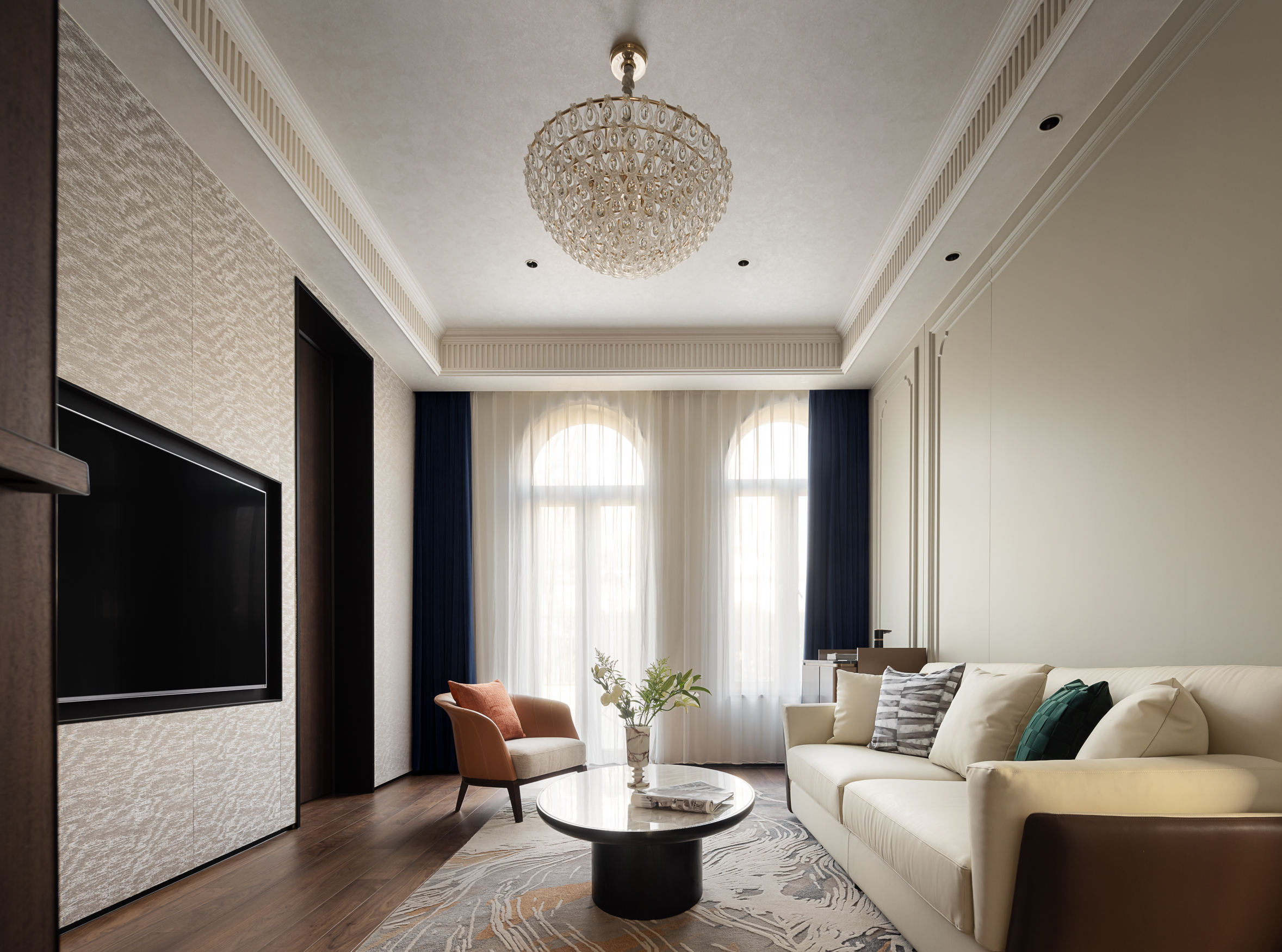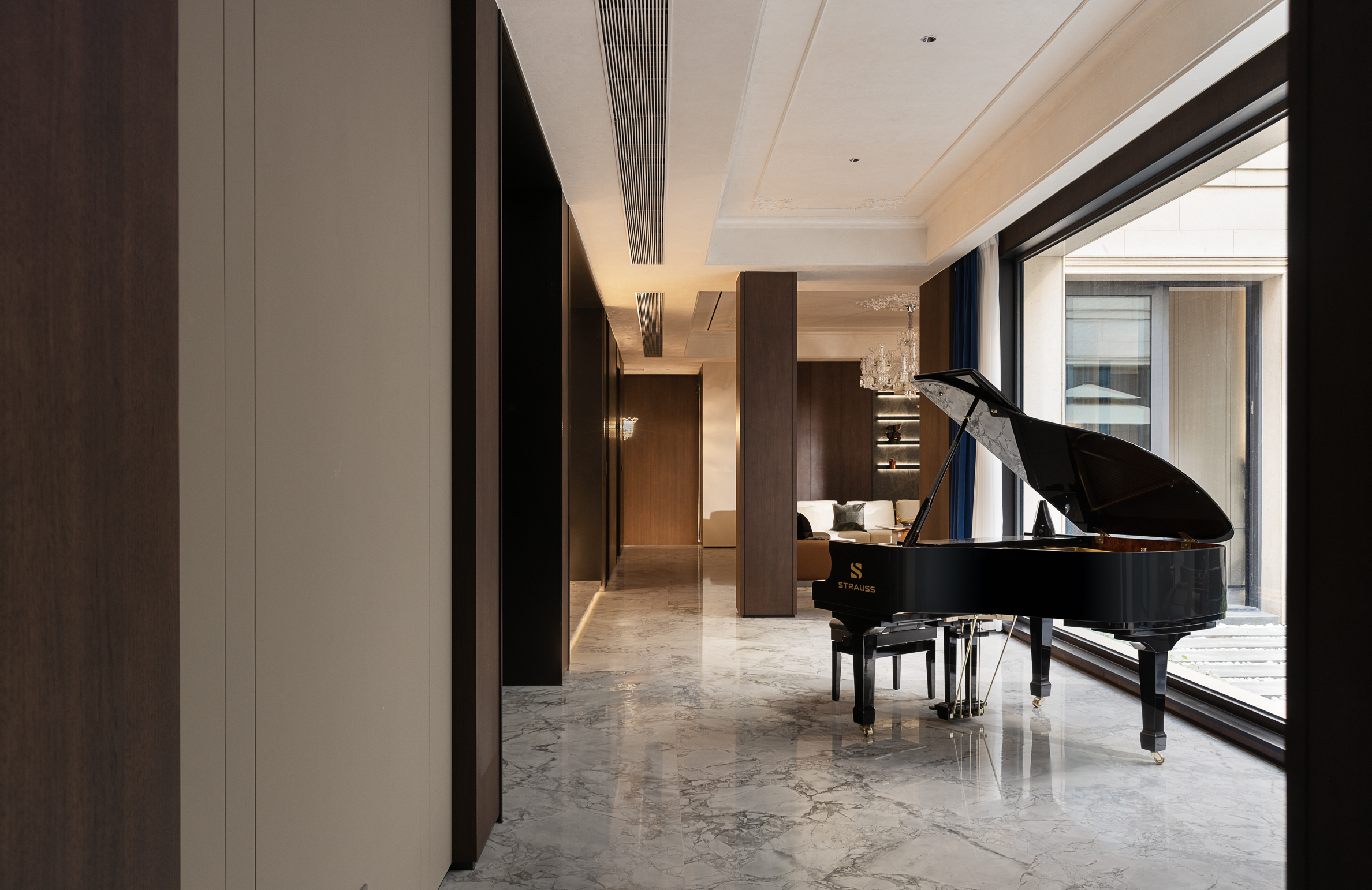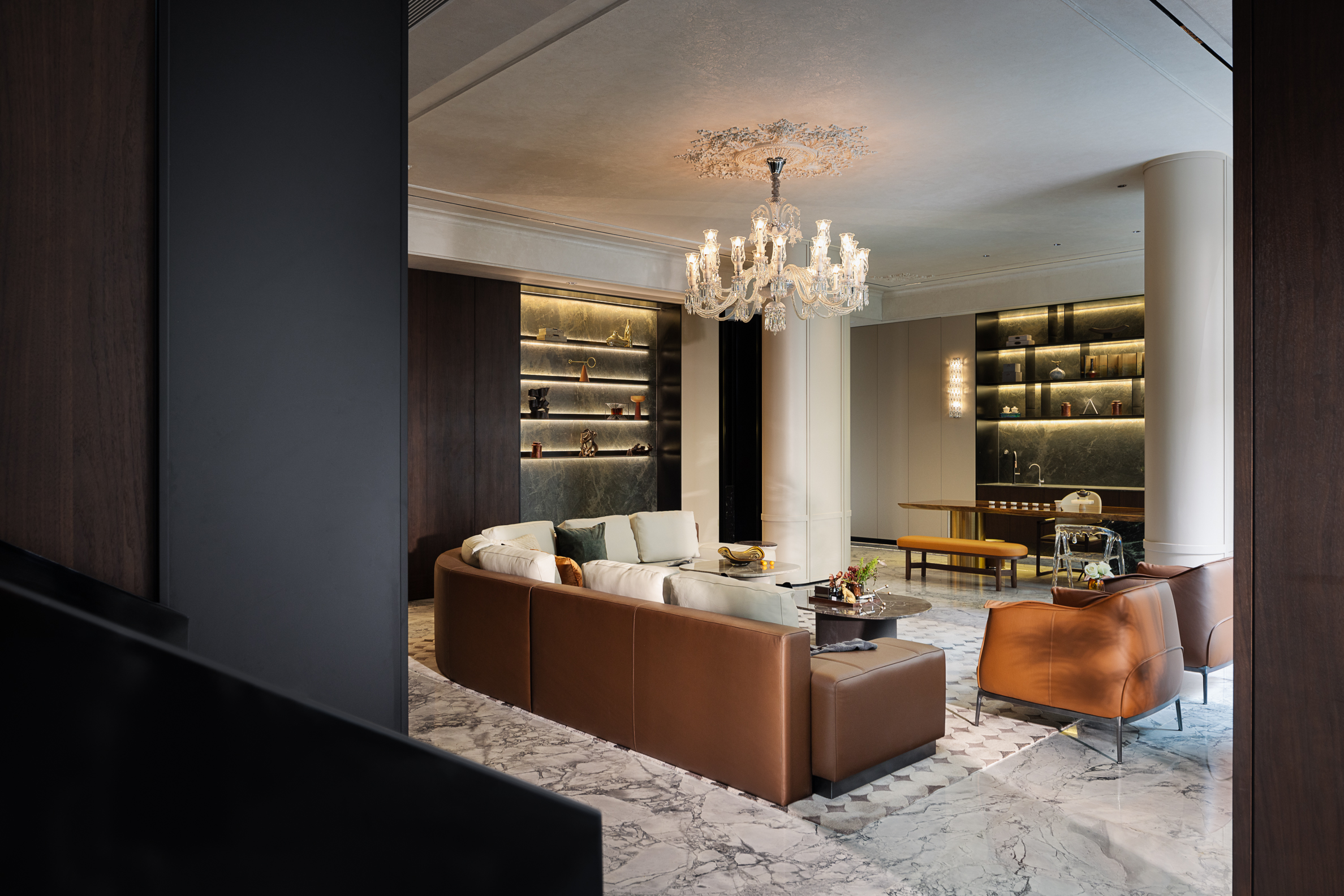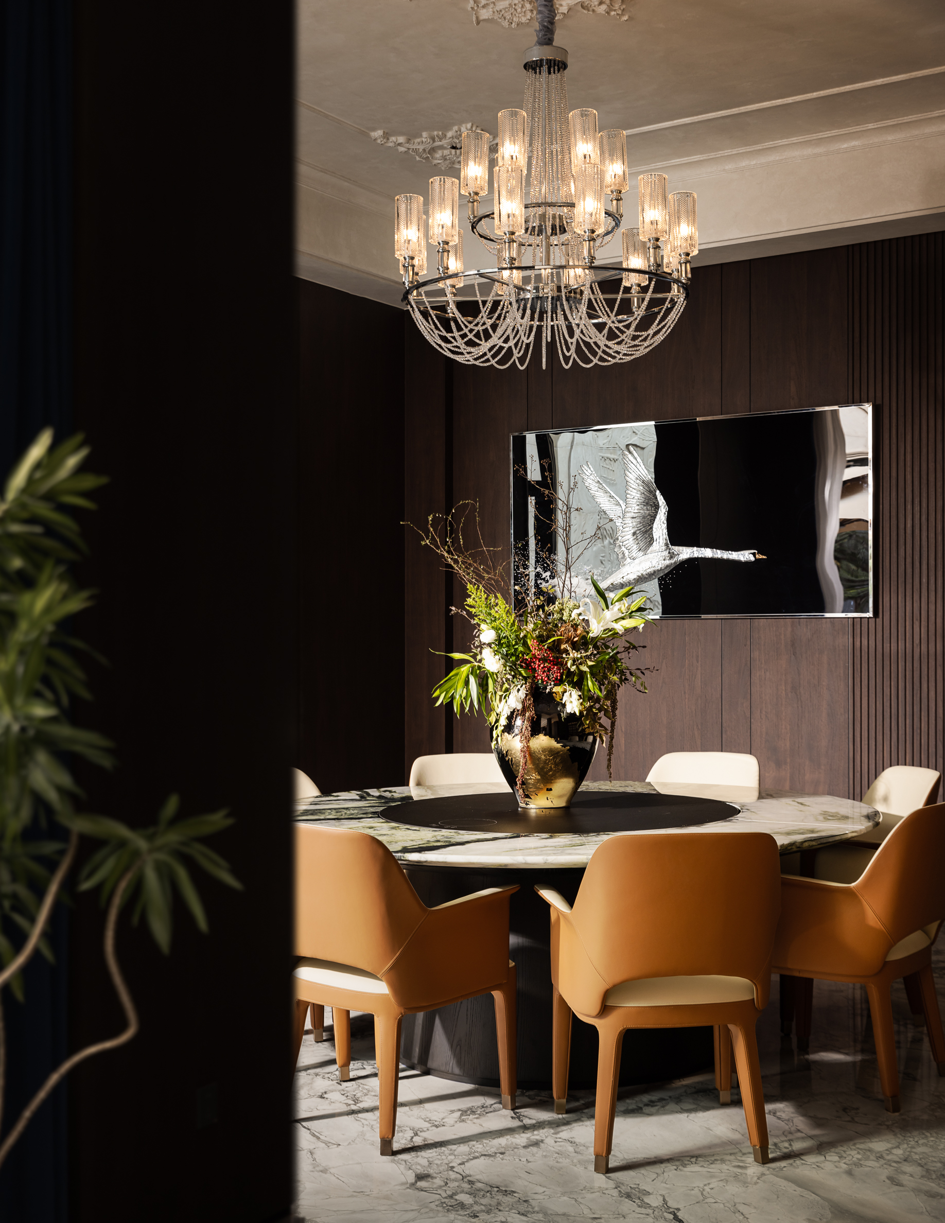 Located in the North Zhenxing Road area of Linping, this project occupies a rare 640-acre low-density residential community, with a plot ratio of just 1.15 and 40% greenery coverage. Surrounded by a well-connected transportation network, it achieves a refined equilibrium between urban accessibility and tranquil seclusion—creating a true “mountain retreat within the city.” The overall design is grounded in the philosophy of “quiet luxury,” embracing natural textures, elegant restraint, and spatial poetry to craft a modern sanctuary for the soul. This thousand-square-meter residence takes light as its narrative guide—morning rays penetrate linen sheers, drawing ethereal shadows across micro-cement walls, while dusk brings the awakening of recessed lights like celestial constellations. The interplay of bespoke brass details and Italian stone veins reflects a subtle dialogue between artistry and atmosphere. This residence becomes a spiritual cartography of contemporary refined living—evoking the quiet confidence and introspective charm of a modern gentleman. The architectural language blurs boundaries between function and emotion: chandeliers descend like crystalline meteor showers, staircases ripple like rivers of light, and curved marble handrails cradle flowing illumination. The open-plan living, dining, and wine-tasting zones are unified through a palette of leather, timber, and stone, where strategic color accents enhance visual rhythm. Bedrooms are enveloped in warm neutrals, with high-back leather beds embodying comfort and quiet grandeur. Beyond, a private lounge and whimsical children’s rooms reflect exclusivity, imagination, and familial warmth. The project pioneers an innovative synergy between “quiet luxury aesthetics” and “ecological intelligence,” redefining elite living through spatial storytelling and material sensitivity. It transcends material excess, favoring thoughtful detailing, sustainable openness, and lasting durability. The open layout maximizes natural ventilation and daylight, reducing energy reliance while reinforcing environmental consciousness. More than a luxurious dwelling, this project is a vessel of emotional resonance—where light, silence, and space converge to awaken inner calm and elevate the daily ritual of living. It realizes Louis Kahn’s vision of architecture as “the thoughtful making of space,” where the physical becomes spiritual, and the ordinary becomes poetic.