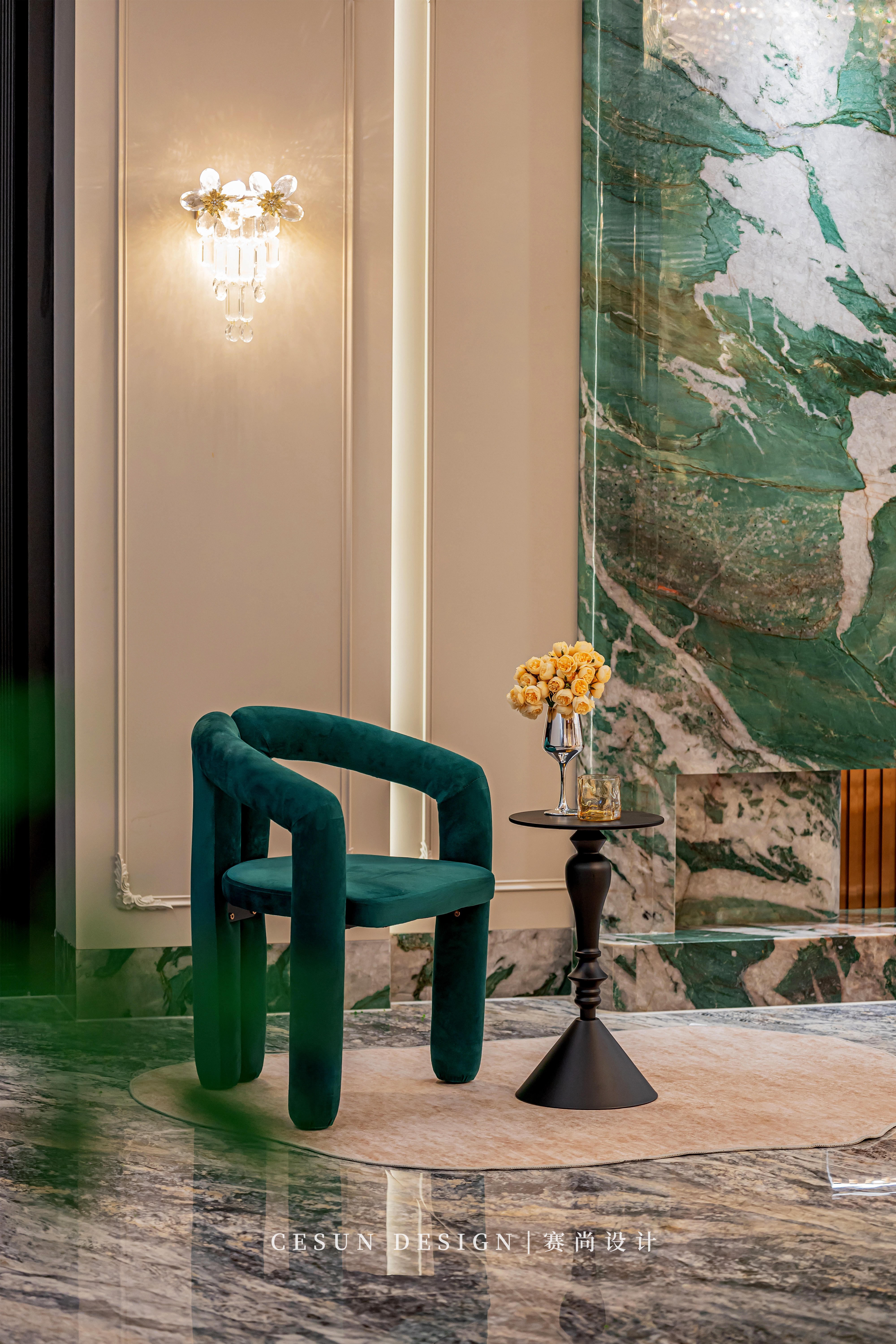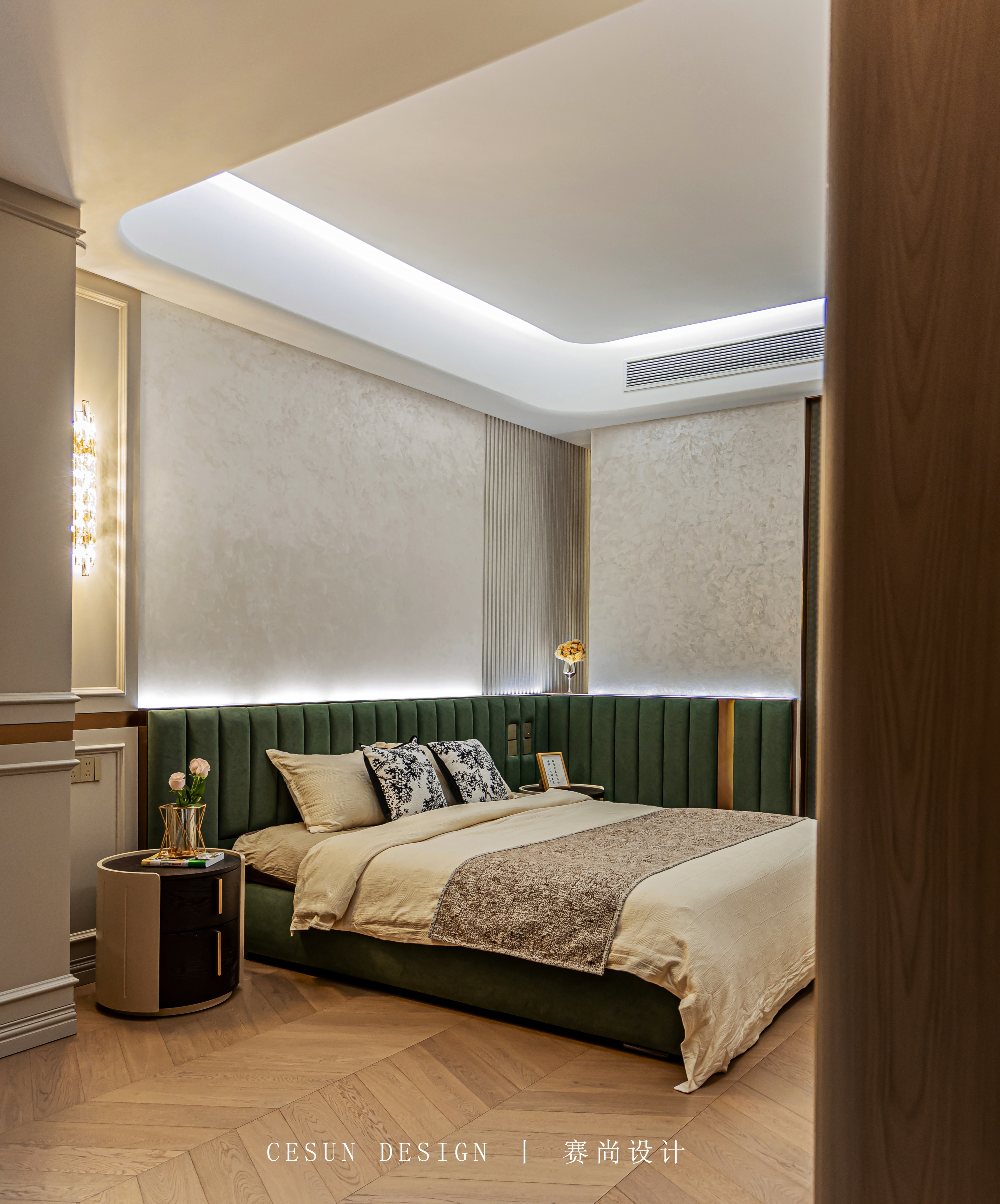 The bedroom, as showcased, exemplifies the project’s core values: an enveloping green upholstered bed integrated with ambient lighting, soft neutral tones, and tactile materials that invite relaxation. The interplay of textures—plush fabrics, warm wood flooring, and subtly reflective wall finishes—creates a serene yet sophisticated atmosphere. Every detail is thoughtfully curated to support both aesthetic pleasure and functional comfort.