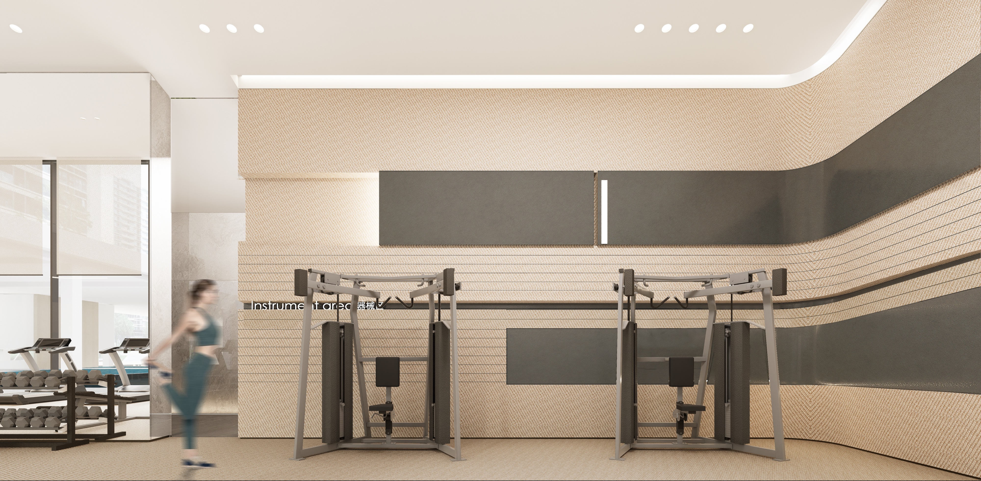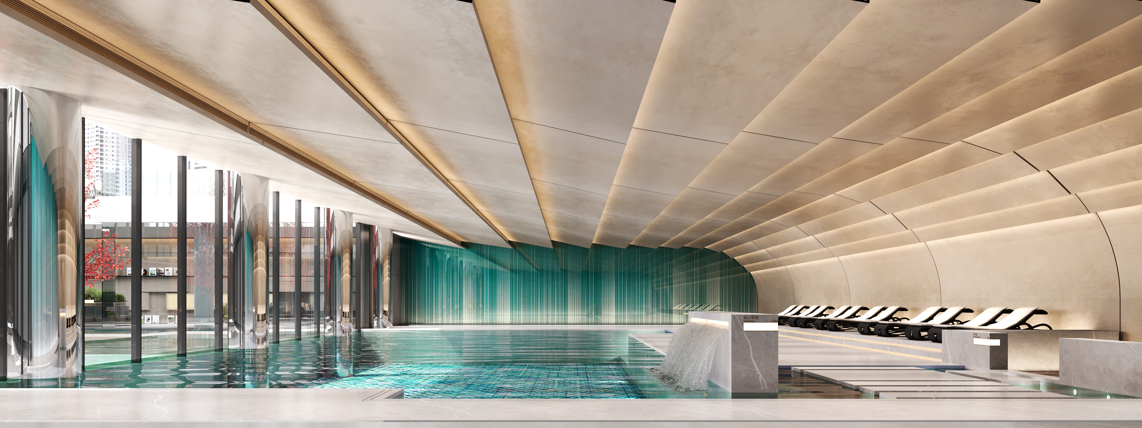 The swimming pool’s curved ceiling, shaped like layered waves, mirrors Lvliang’s mountain outlines. Warm light strips embedded in artistic glass grilles refract onto the water, yielding a “floating mountain shadow” effect through the interplay of structure and reflection.