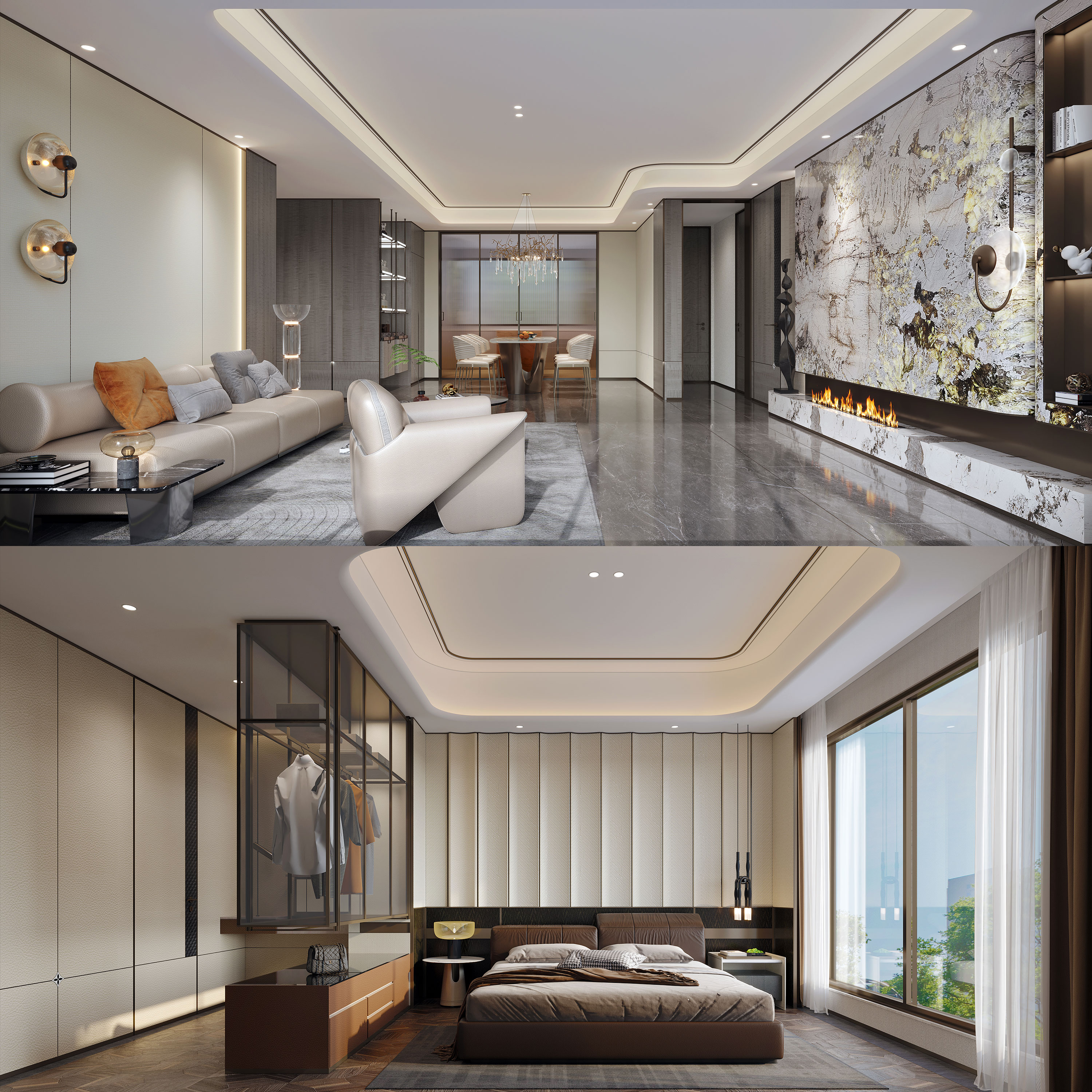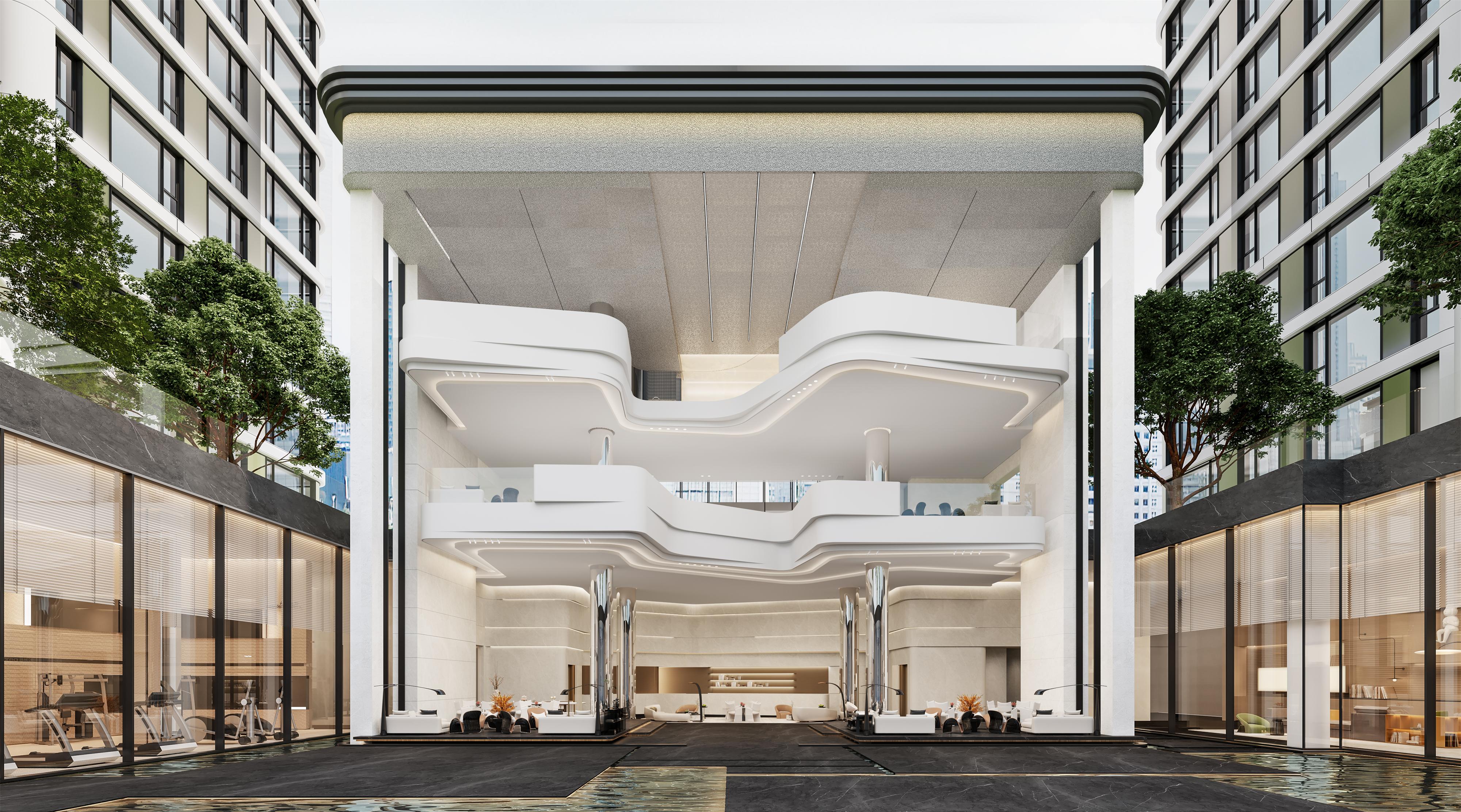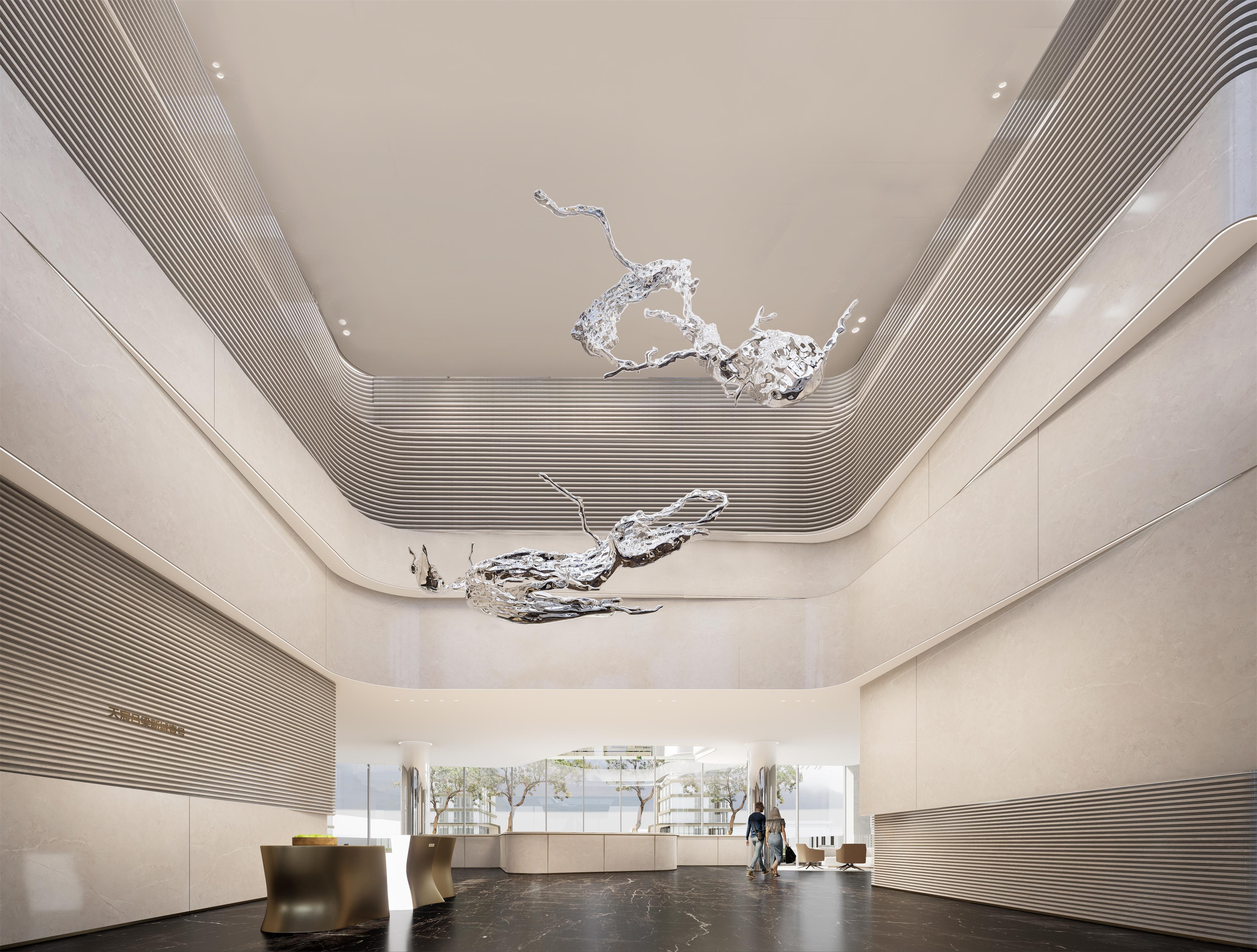At the clubhouse entrance, a dual floating metal art installation, inspired by liquid metal’s fluidity, mimics Lvliang’s winding mountain contours. Spotlights focus on the sculpture’s curved surfaces, casting dynamic light and shadow patterns, enhancing spatial narrative and rhythm.
