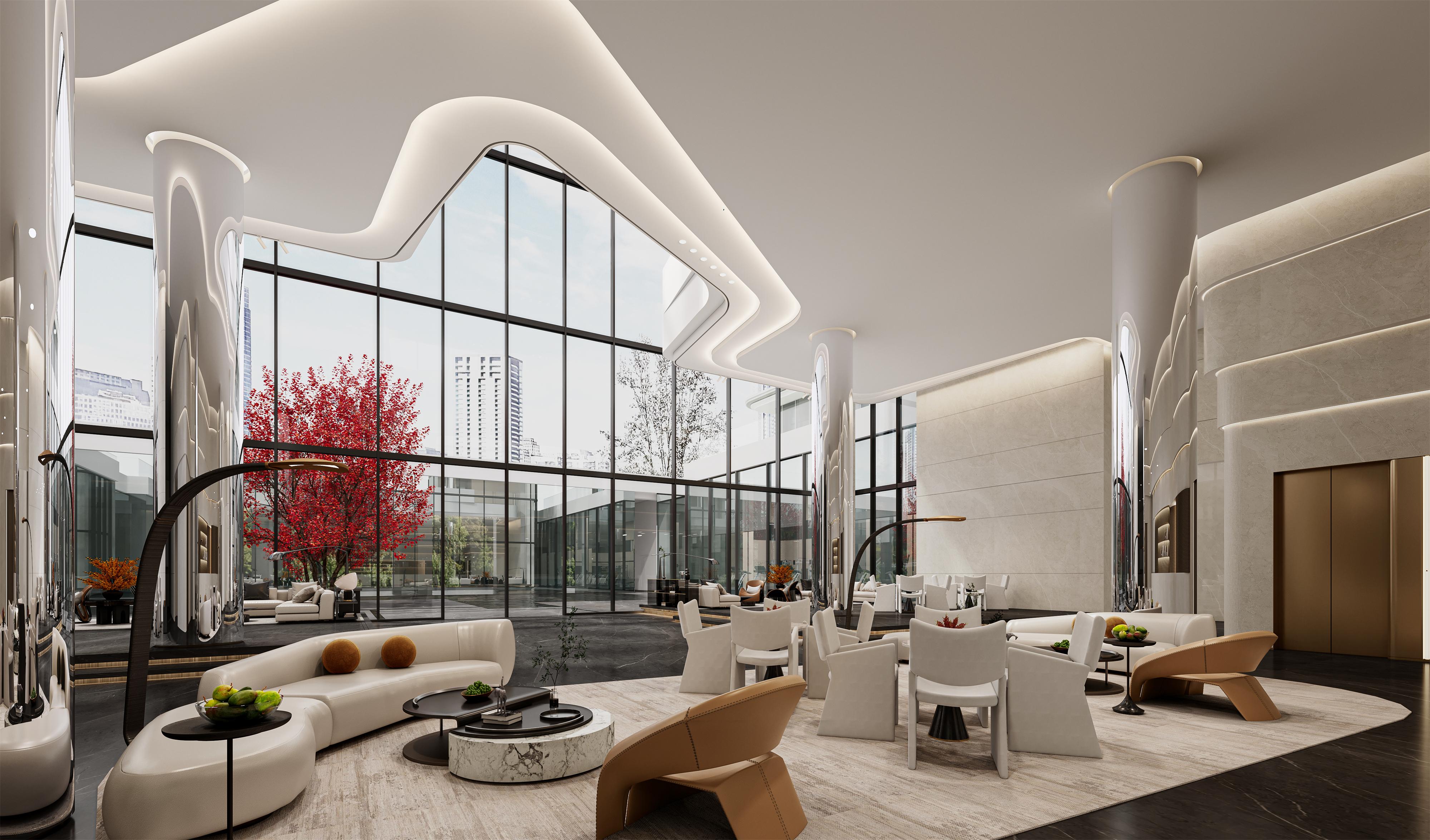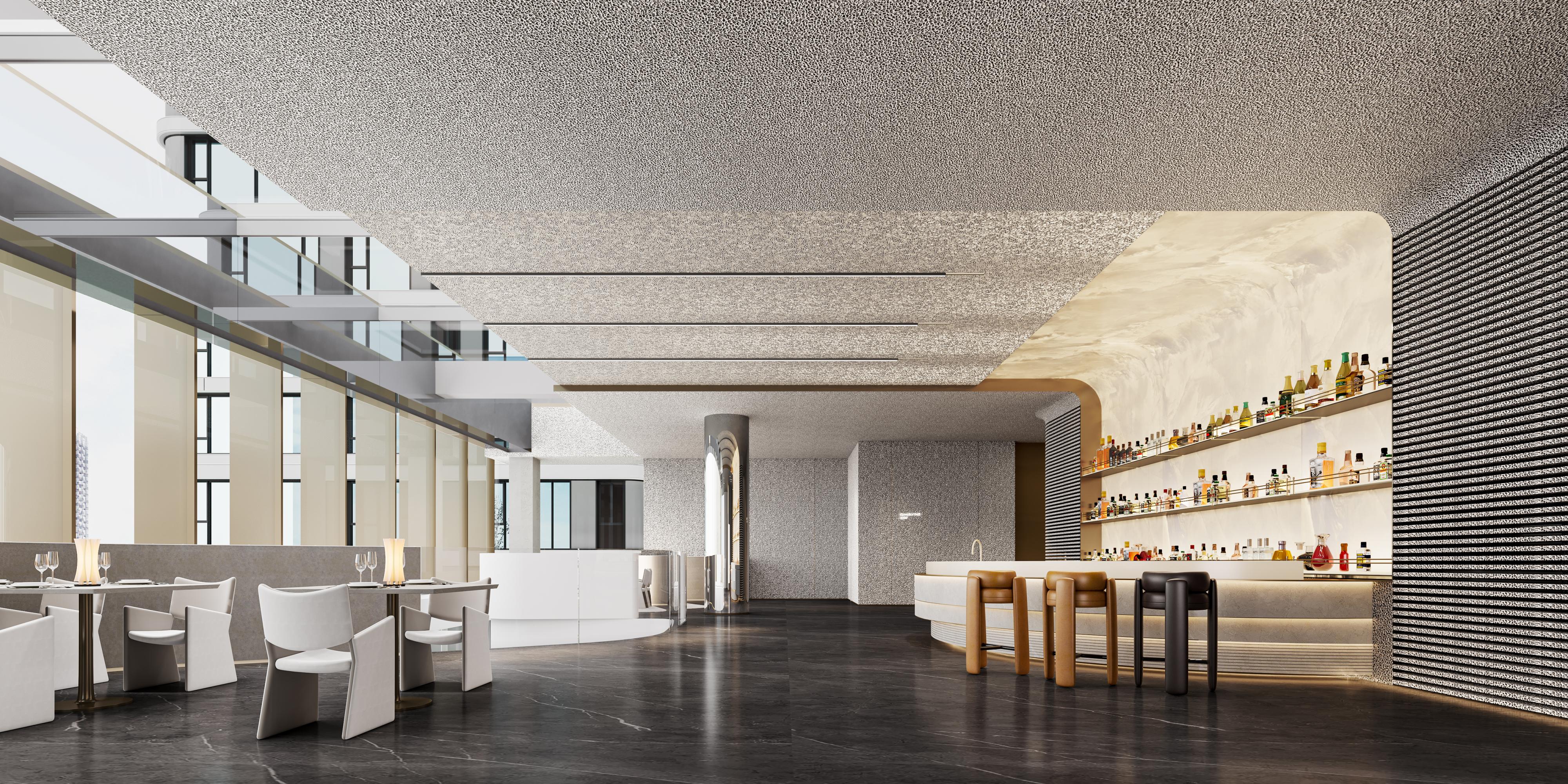 The second-floor lounge, themed as an “urban retreat”, creatively uses aluminum foam ceilings to reflect sunset hues, evoking a “serene, shimmering” twilight ambiance. Paired with modern art-inspired custom furniture and soft furnishings, it fosters a pleasant, comfortable conversational atmosphere.