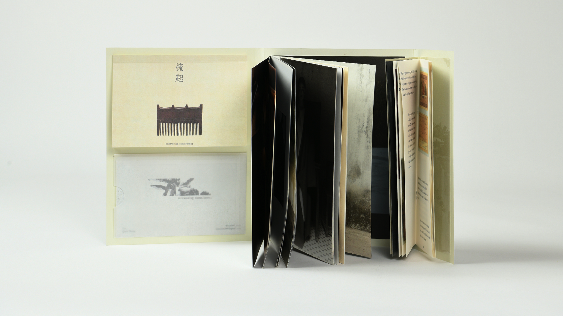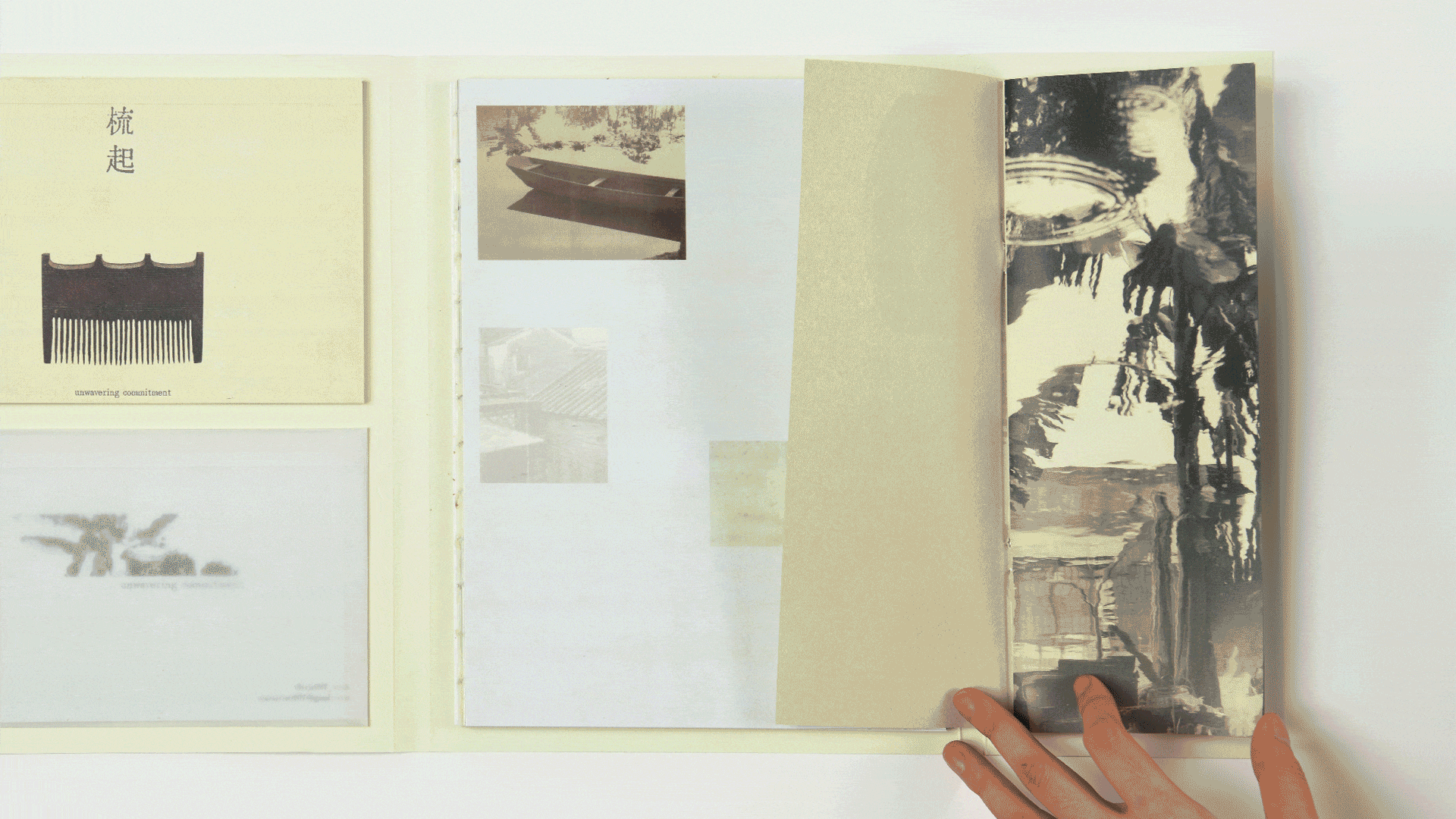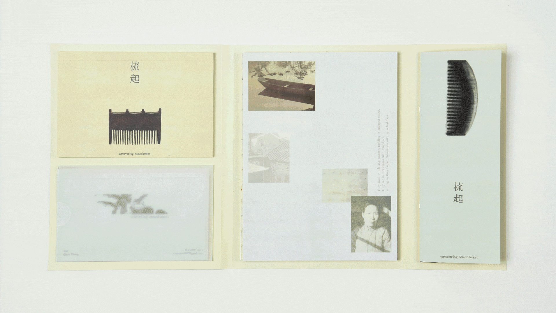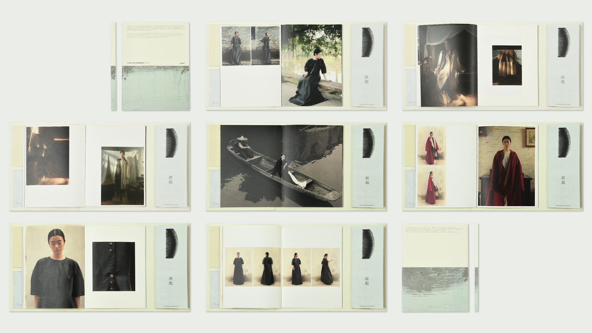To echo the narrative depth of the collection, the design is structured into a triptych book series, displayed on a single board. The first book features editorial and lookbook images, layered with scenic imagery to create an atmospheric visual story that evokes the spirit and setting of the comb sisters. The second book is a curated archive of Qixin’s research—historic photographs, visual references, and cultural documents—that inform the design of the collection. The third book compiles translated poems, songs, and short biographies of individual self-combining women, preserving their voices and lived realities.