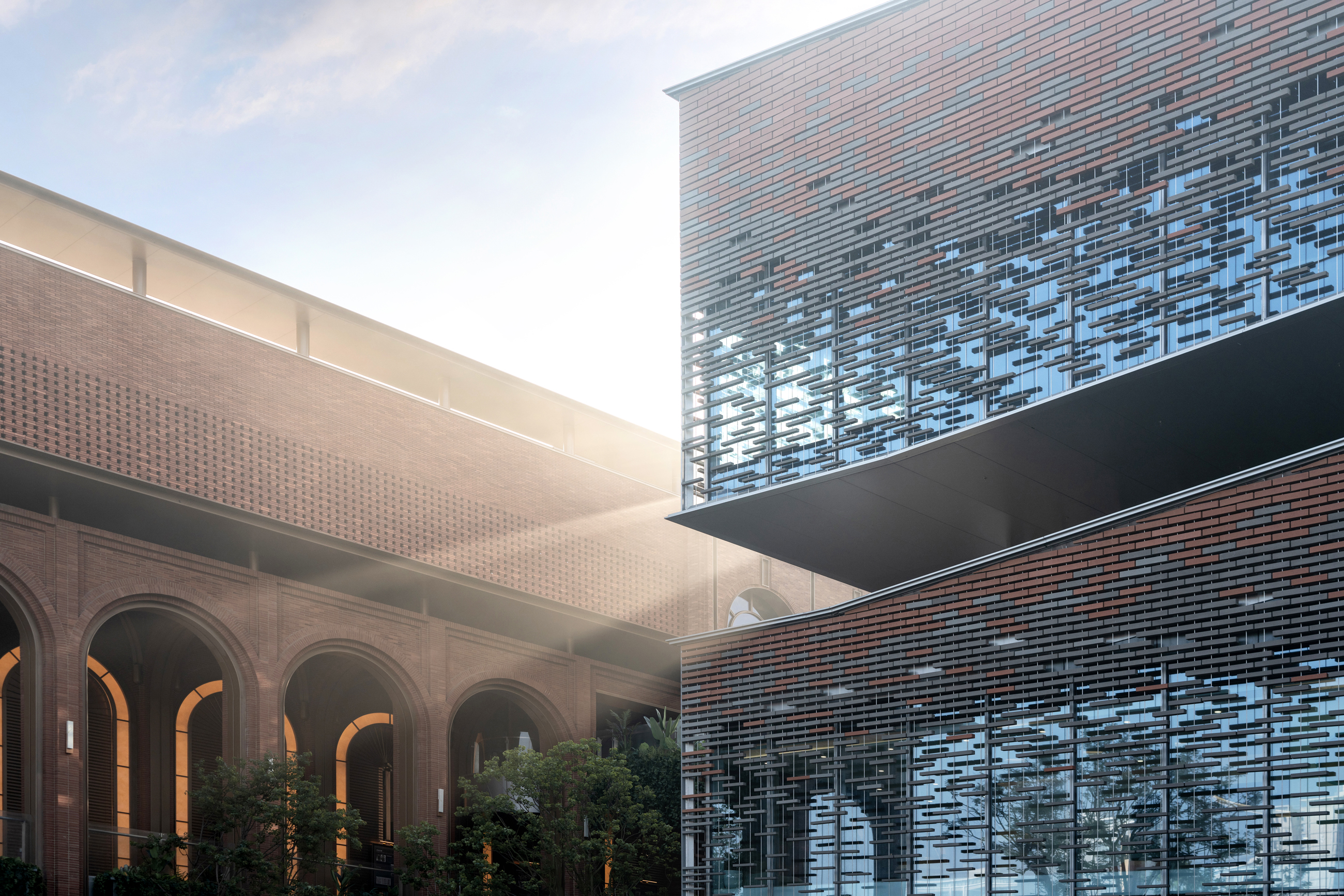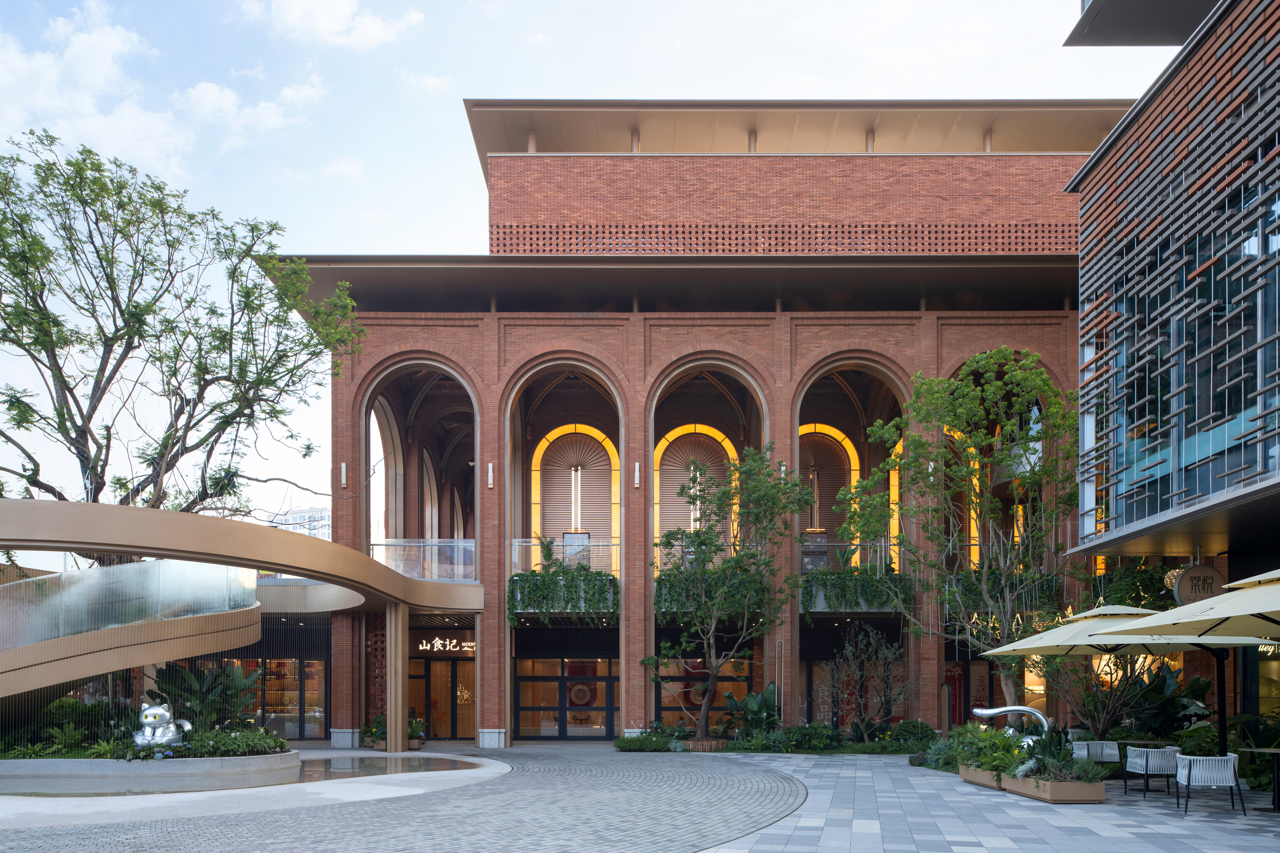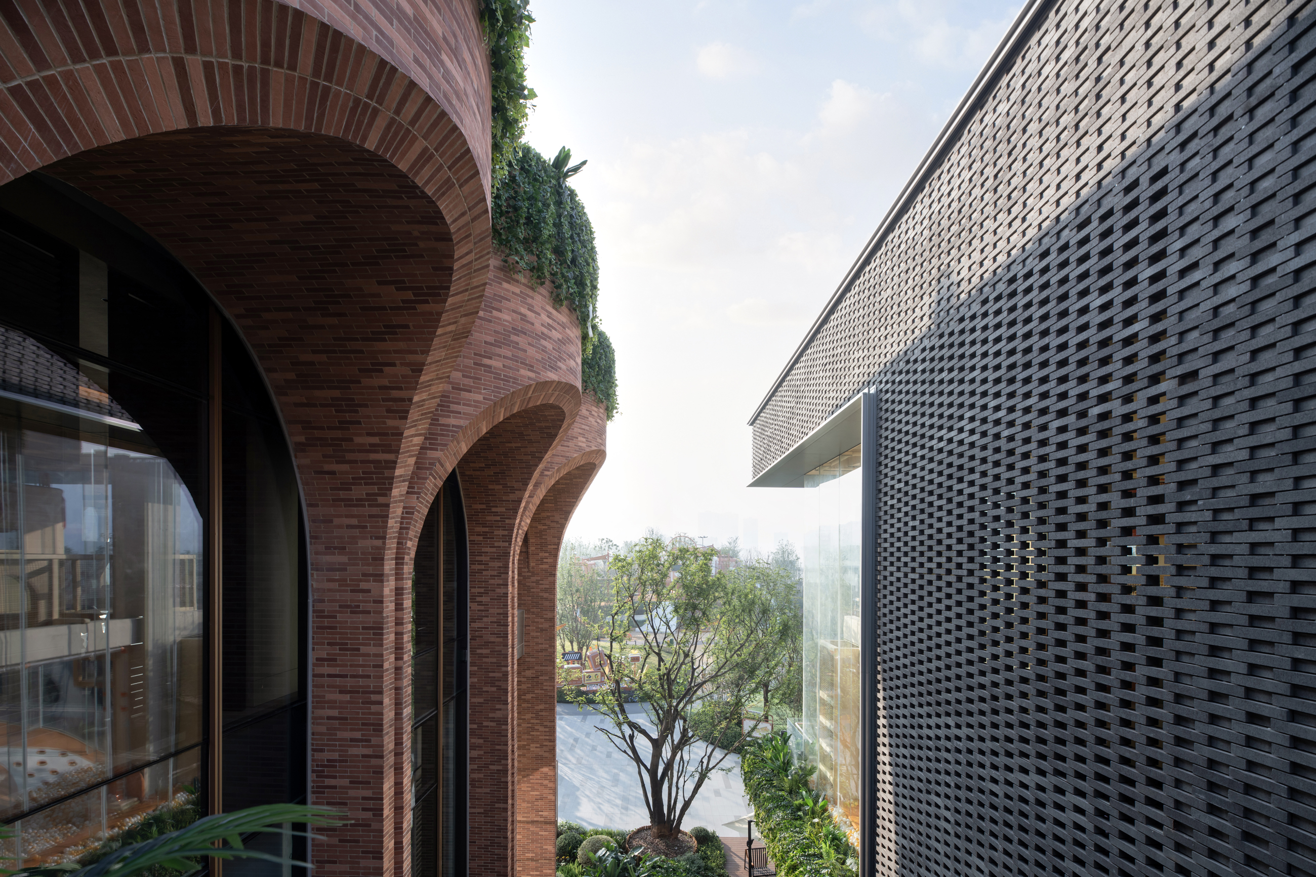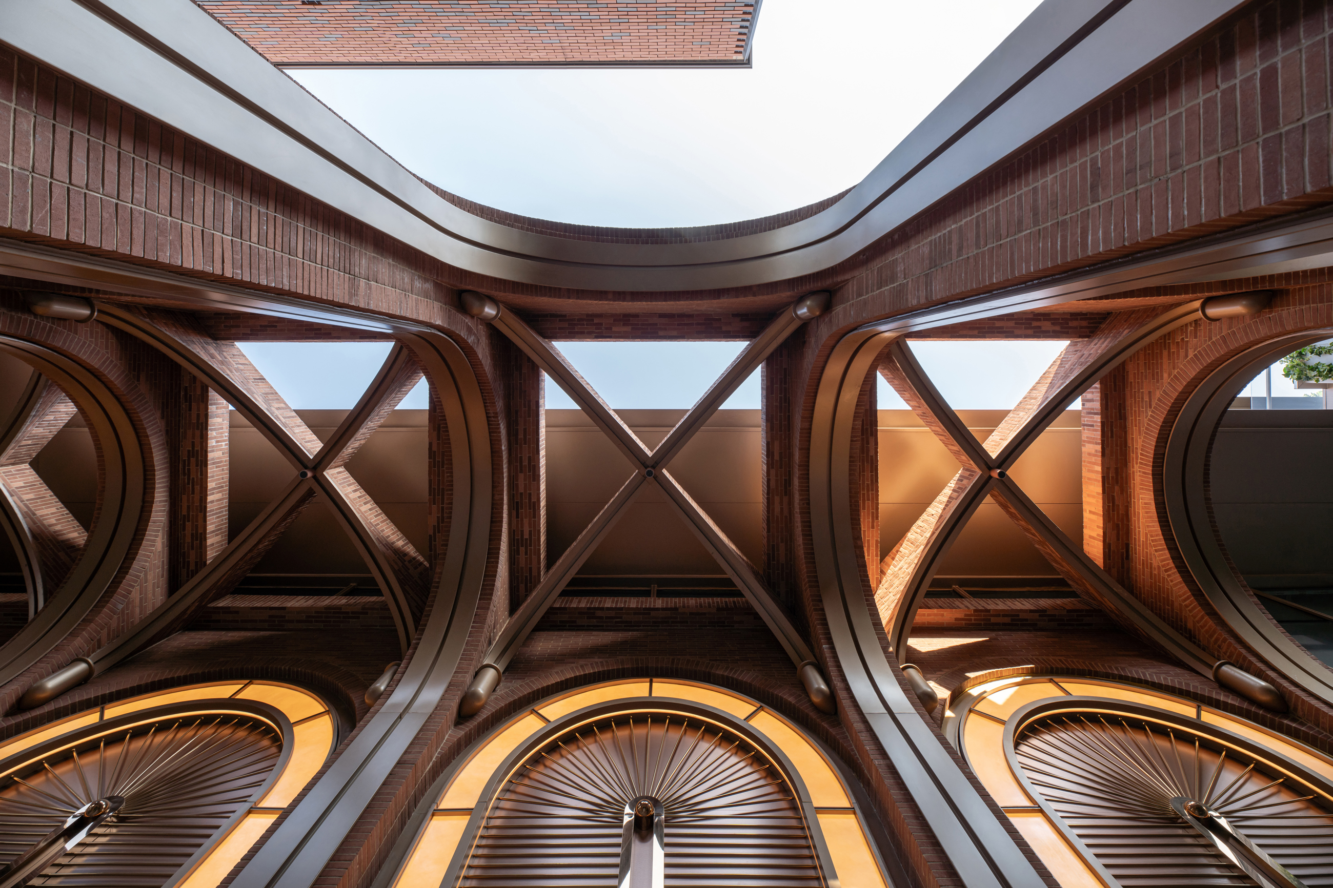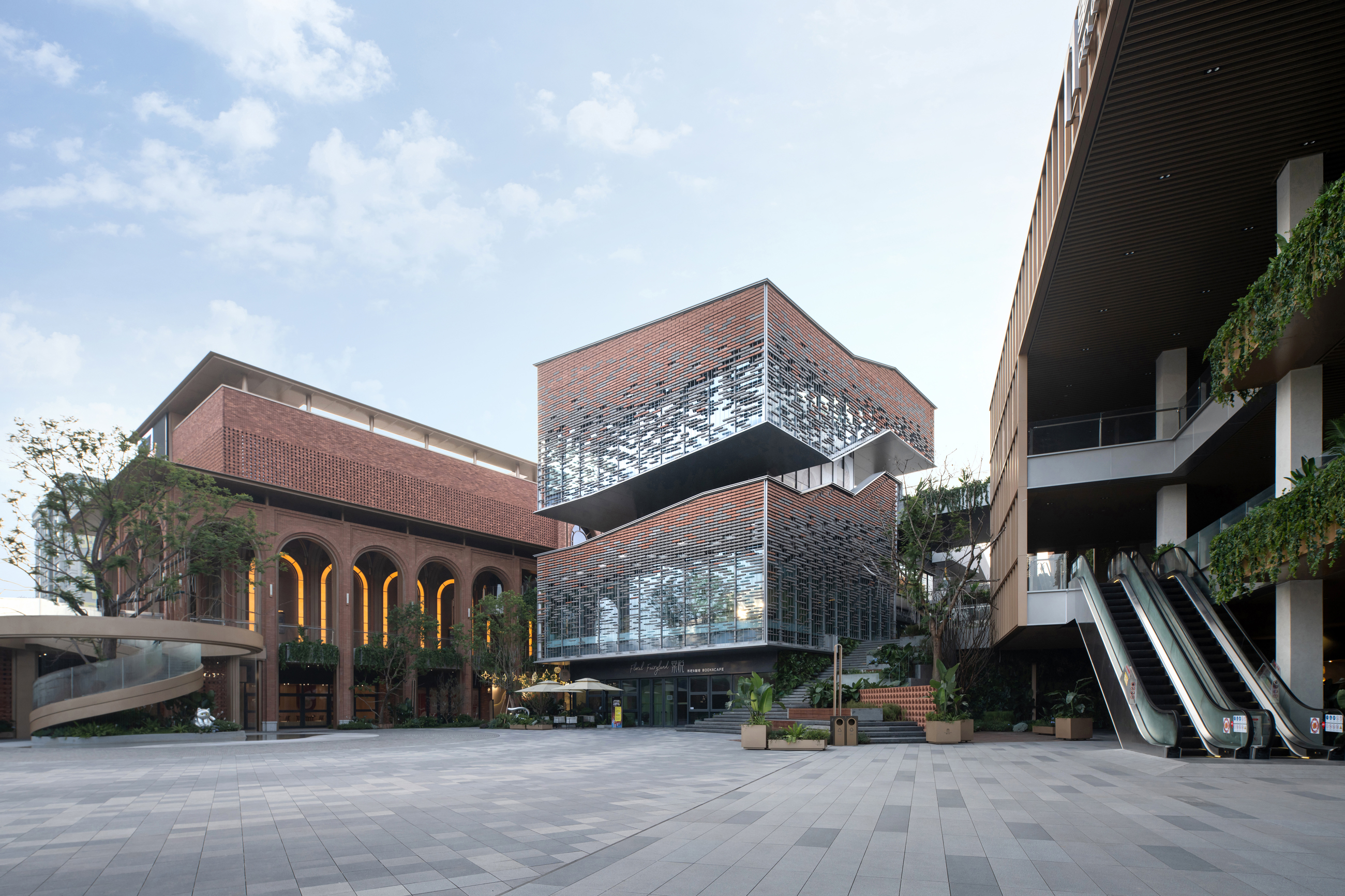 Architectule detail control is the key point. The arcade adopts the mold red brick collage process, supported by steel pipes, and sealed with aluminum plates and embedded with lamp grooves, forming a quaint and elegant spatial interface; The facade of the central bookstore adopts a double-layer skin, with a brick like metal decorative box on the outer skin, which is connected by a zipper. The facade frame is decorated with aluminum alloy extremely narrow profiles, which not only reduces the weight of the structure, but also highlights the construction aesthetics with exquisite detail design.