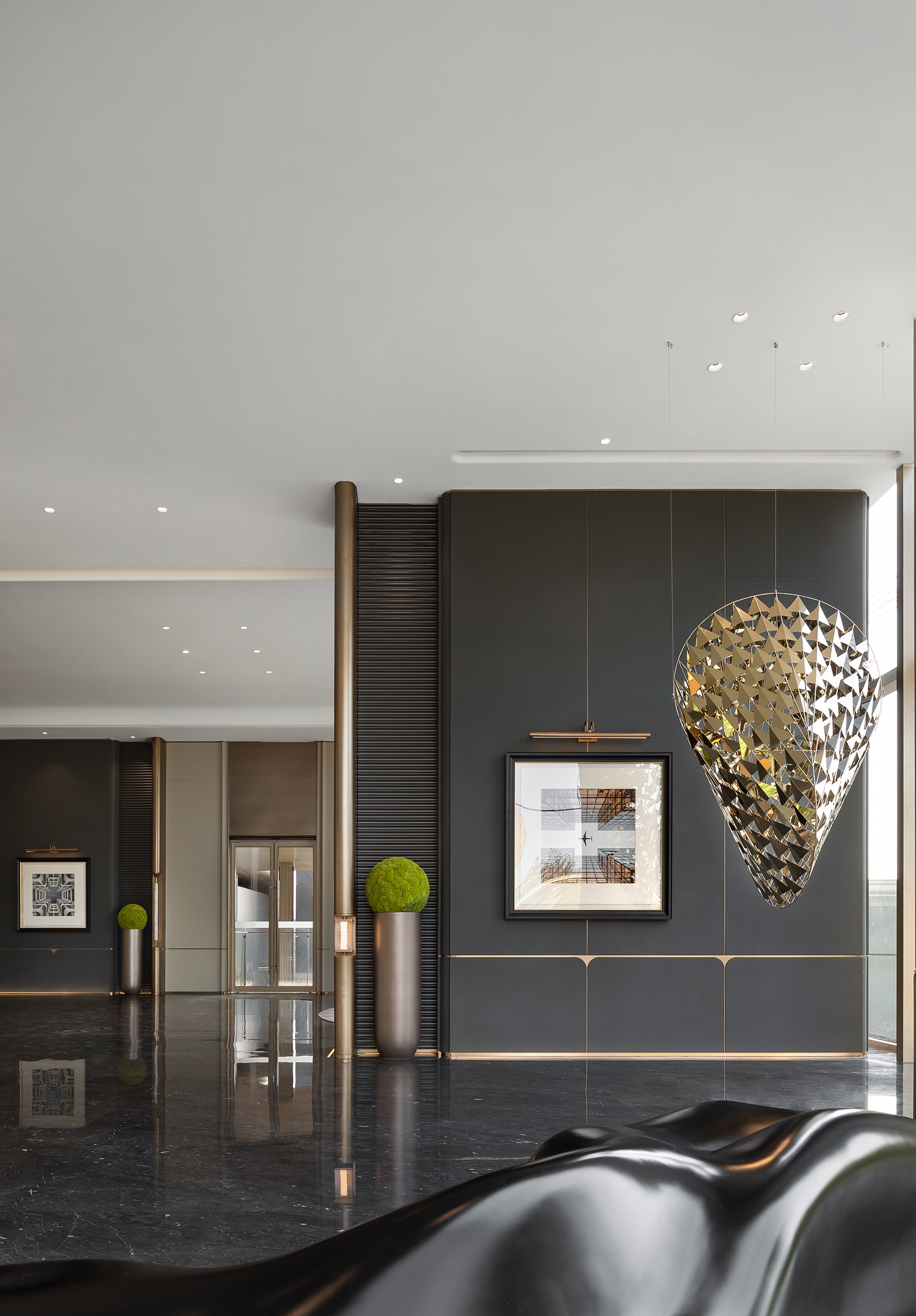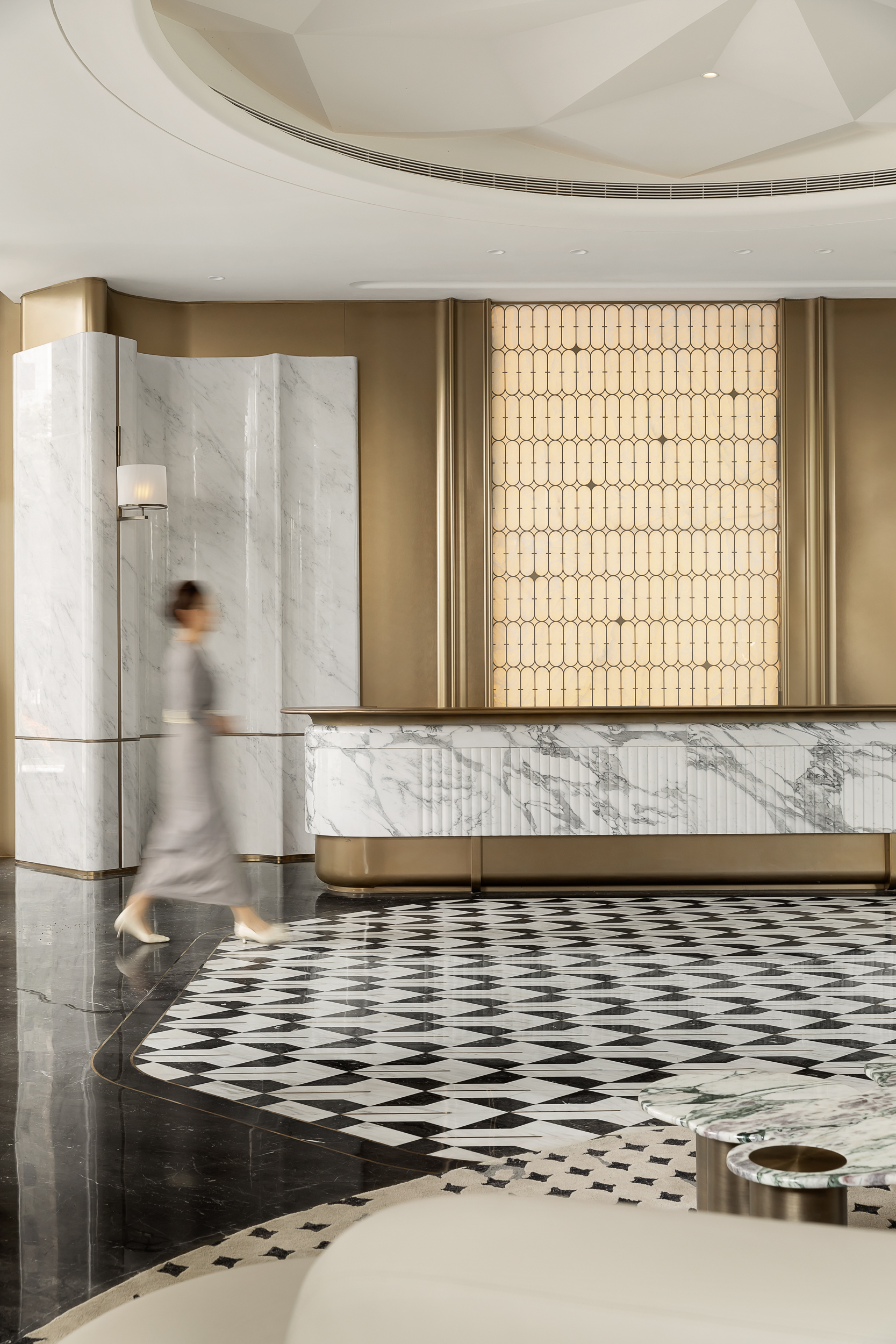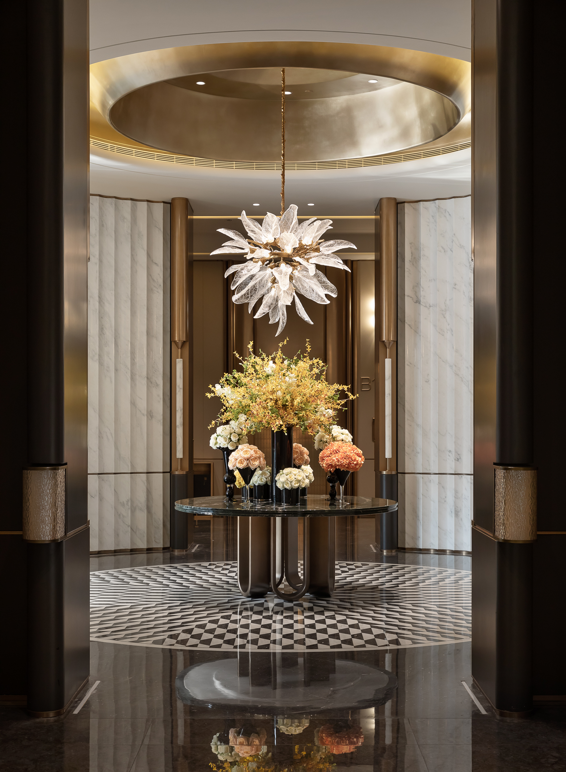 The entrance hall embodies a realm of luxurious expanse. The ceiling is inspired by the multifaceted edges of a diamond, a metaphor for the tempering of time. The space exudes an eternal grace moving with light. The cool sheen of metal complements the warm luster of marble. The flowing poetry wanders through the space, creating a luxurious and elegant atmosphere. Together, they construct an impression of a space that is a kaleidoscope of light and shadow.