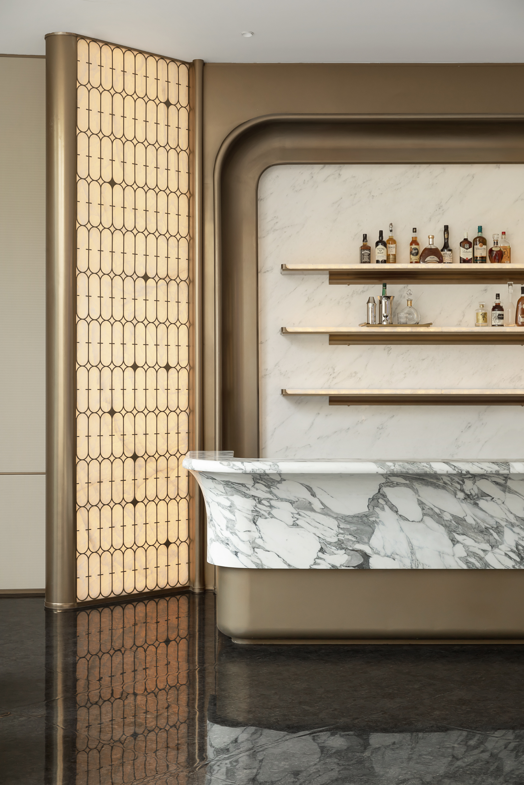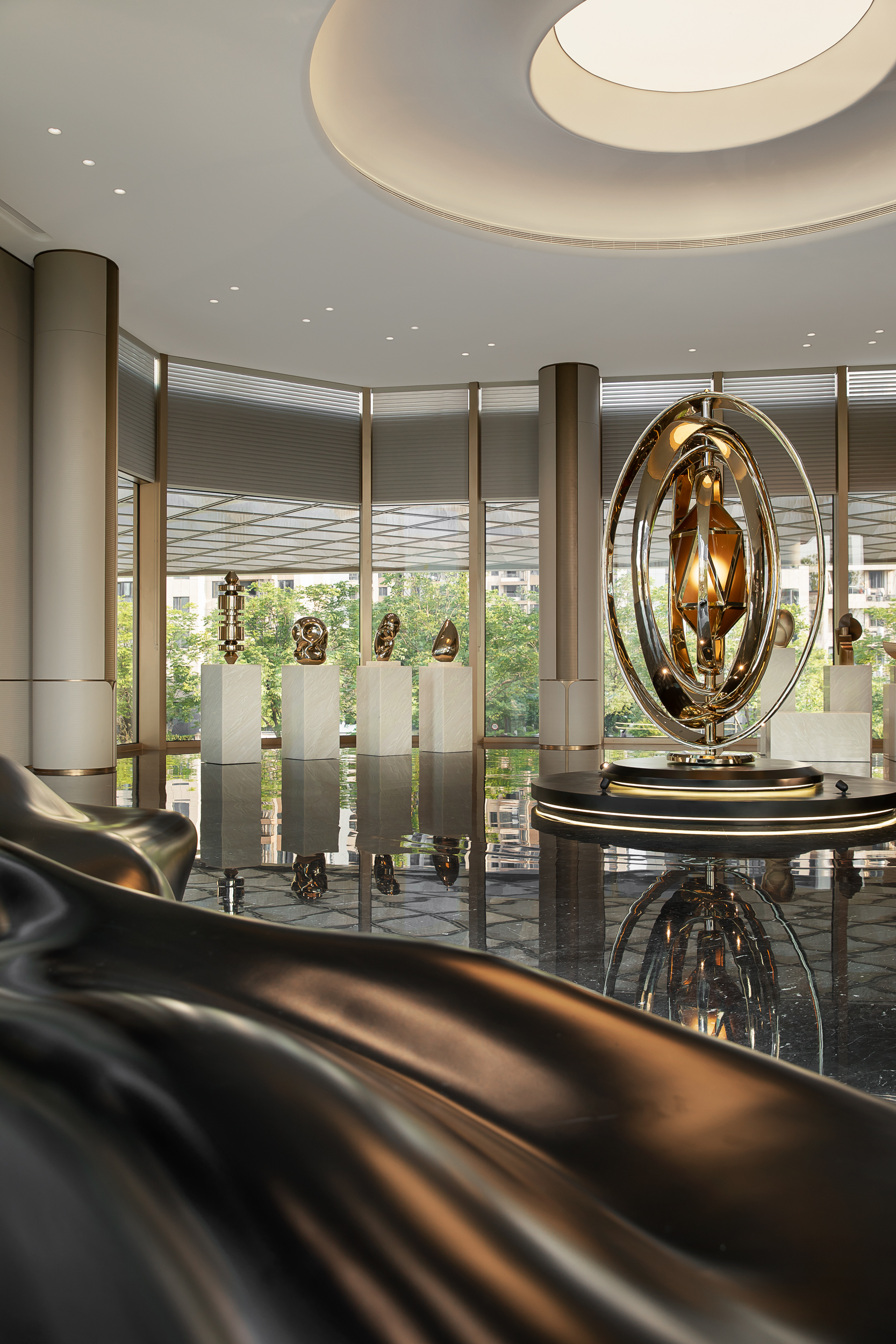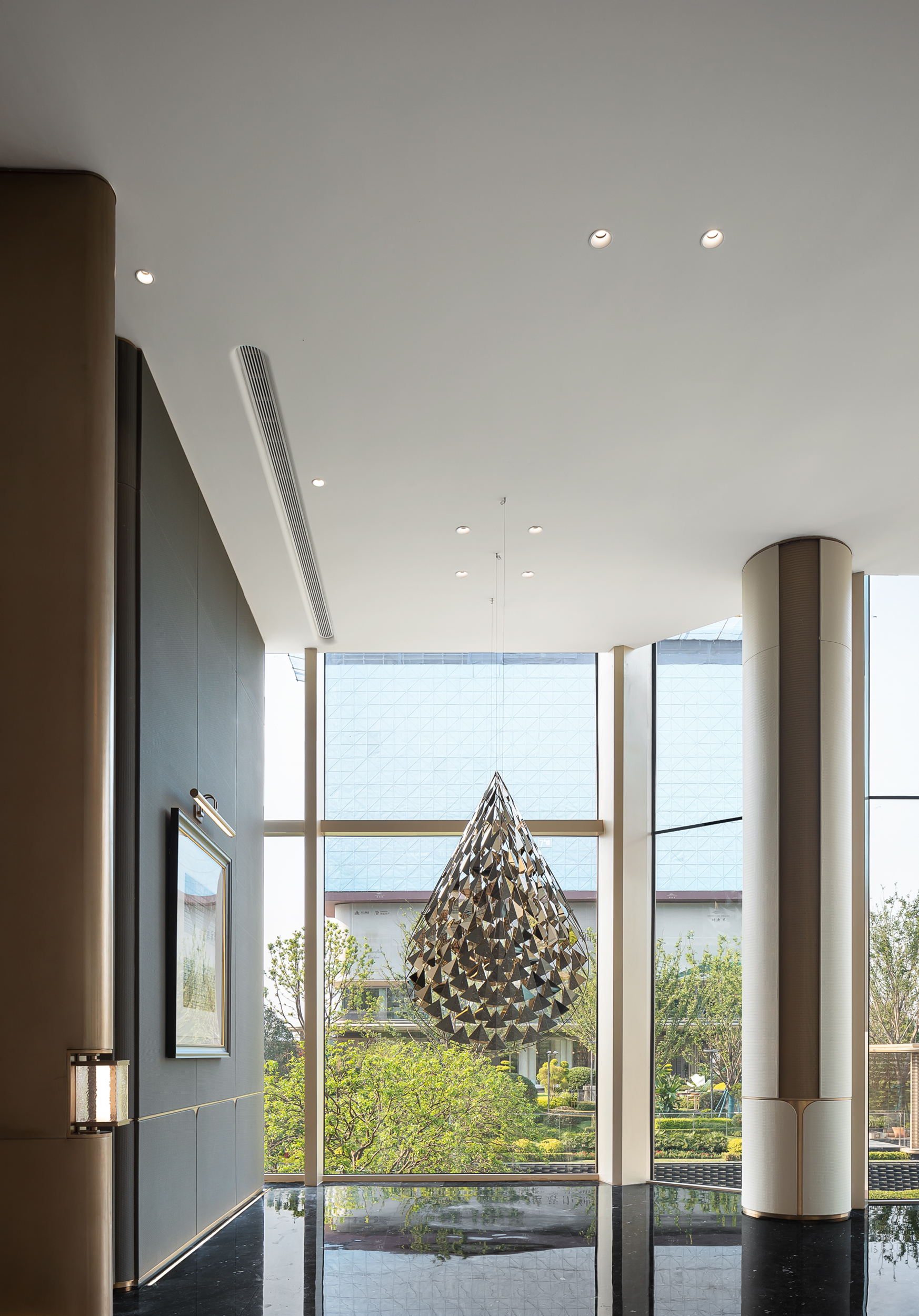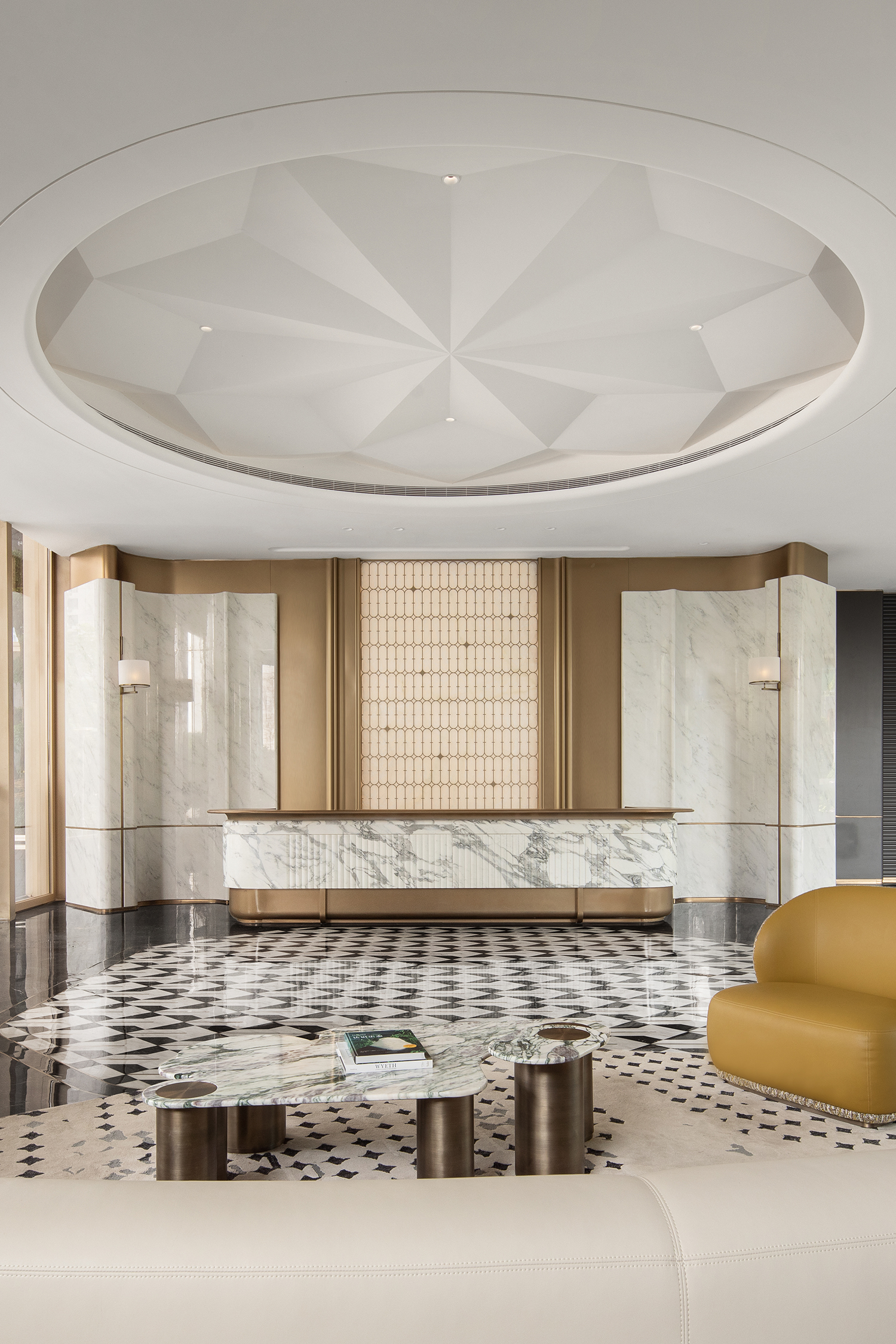 The entrance hall embodies a realm of luxurious expanse. The ceiling is inspired by the multifaceted edges of a diamond, a metaphor for the tempering of time. The space exudes an eternal grace moving with light. The cool sheen of metal complements the warm luster of marble. The flowing poetry wanders through the space, creating a luxurious and elegant atmosphere. Together, they construct an impression of a space that is a kaleidoscope of light and shadow.