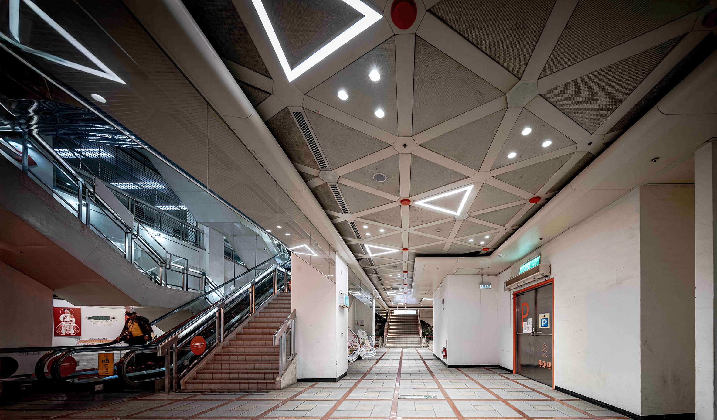 Prior to renovation, C Plaza was characterized by deteriorated and uncoordinated fixtures, excessive glare, and insufficient illumination, which greatly limited its ability to support diverse cultural and creative events. The new lighting design adopts the concept of “re-illuminating a cultural node,” using light as a medium that bridges history and contemporary spatial identity. Inspired by the triangular geometric patterns in the existing ceiling structure, custom-made luminaires were developed to reflect the original architectural language and strengthen spatial recognition.