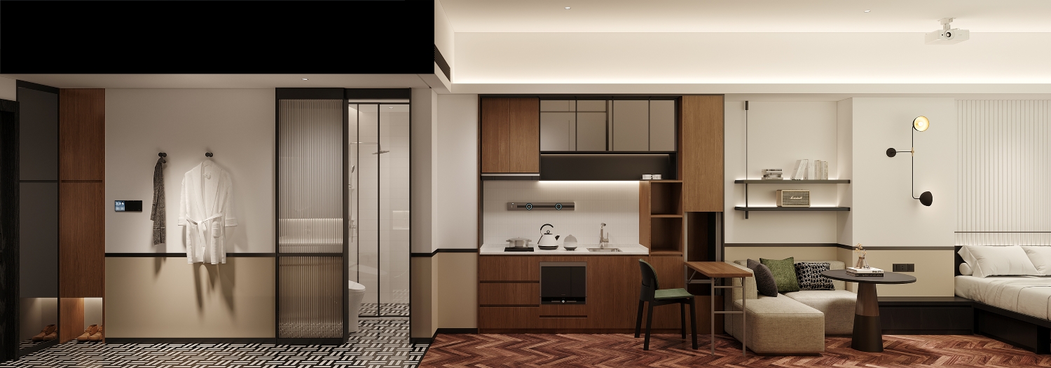 The 17-story building has been redesigned with floors 5–8 dedicated to studio units and floors 9–17 to suites. Due to the original com-mercial layout, all units feature a depth of over 11 meters, making daylight optimization a key focus during KDH’s renovation.