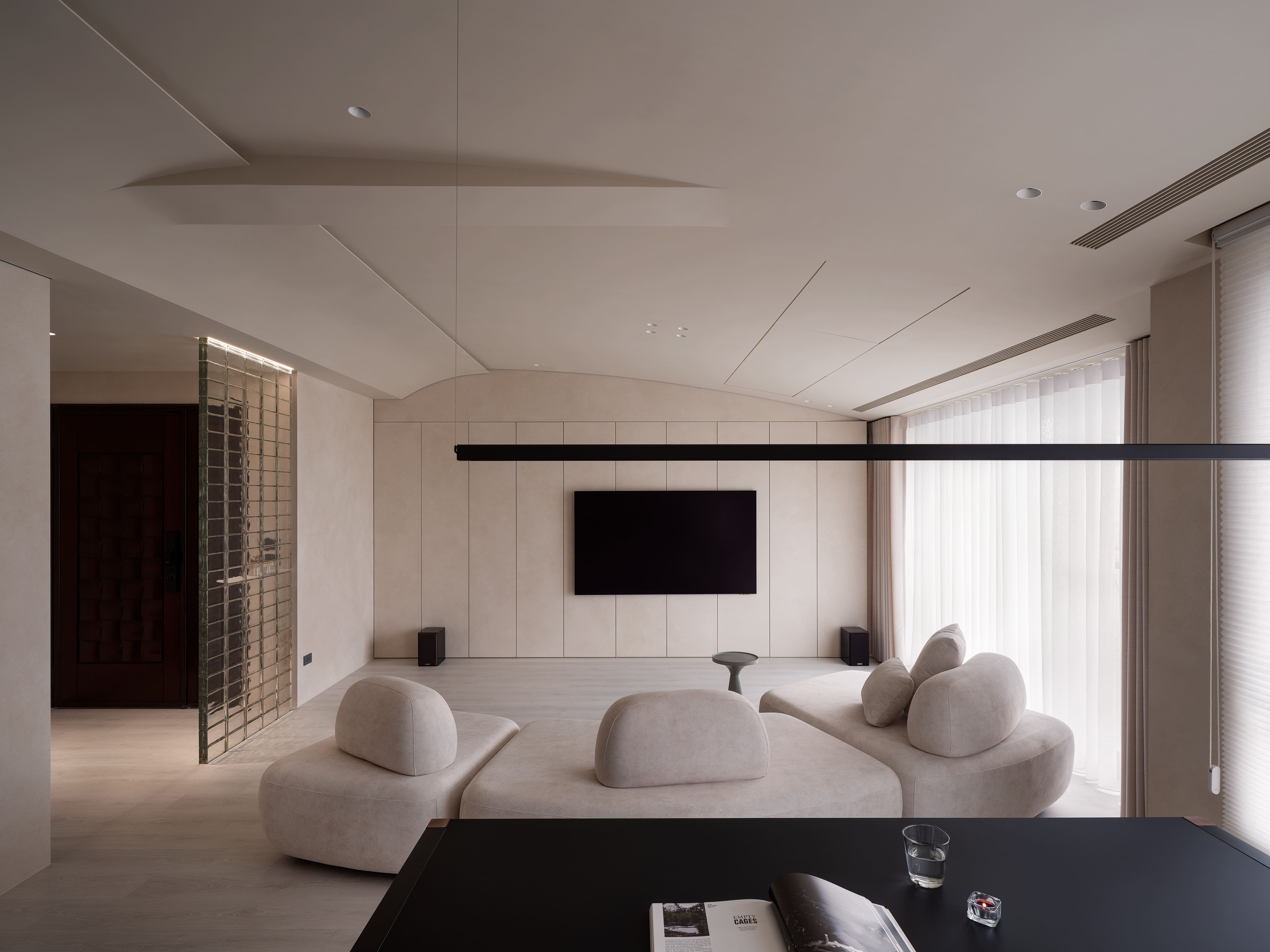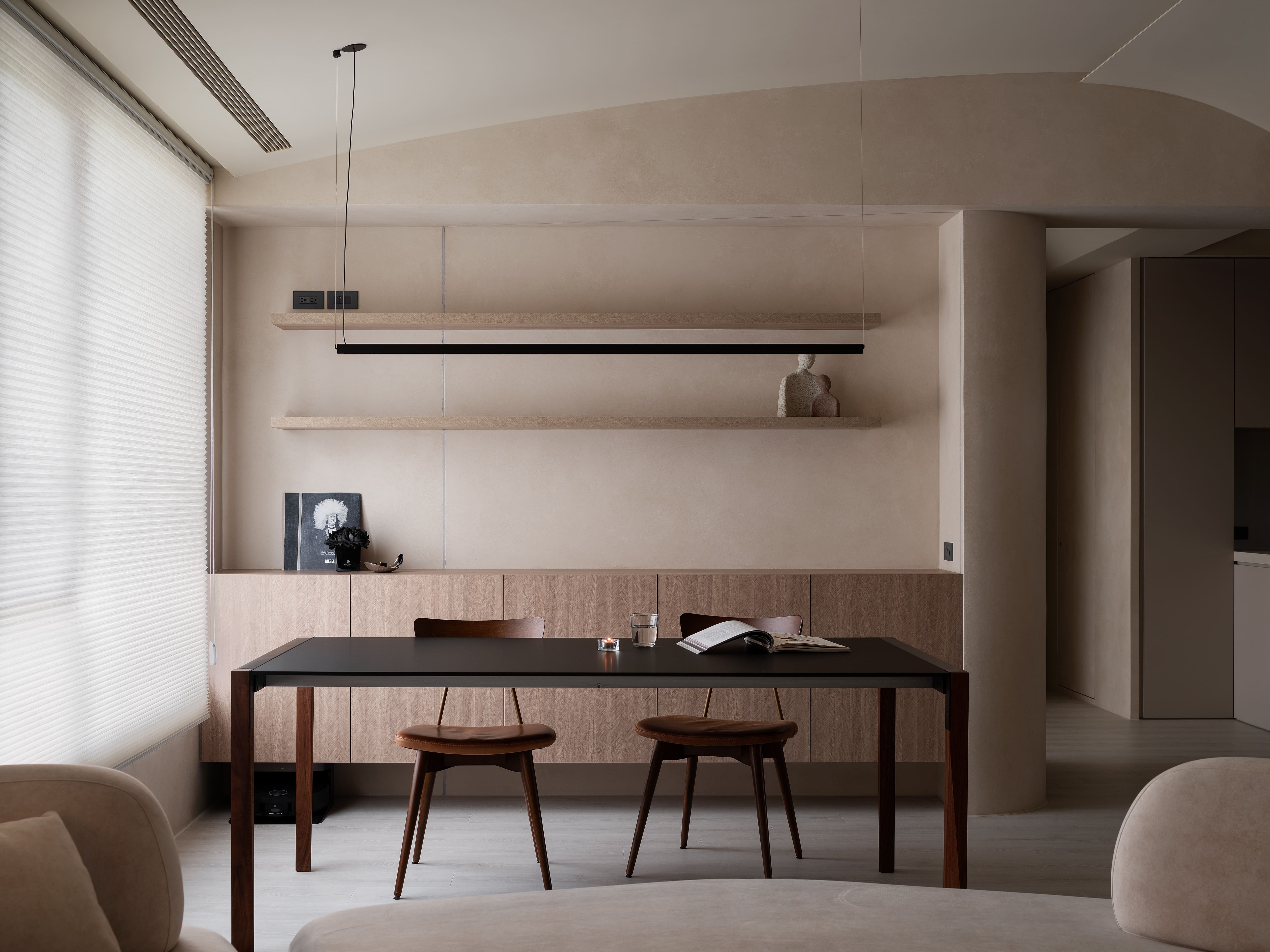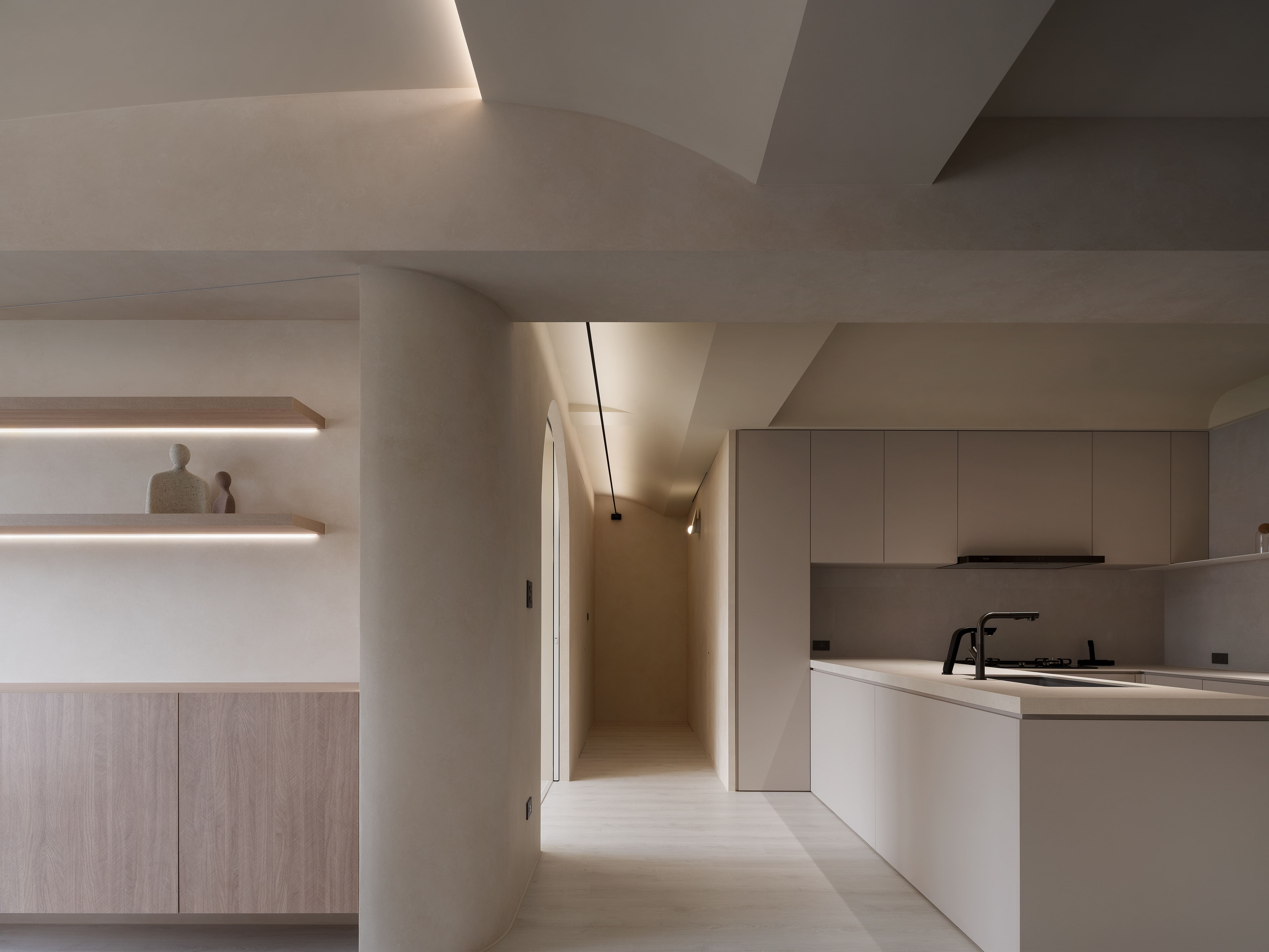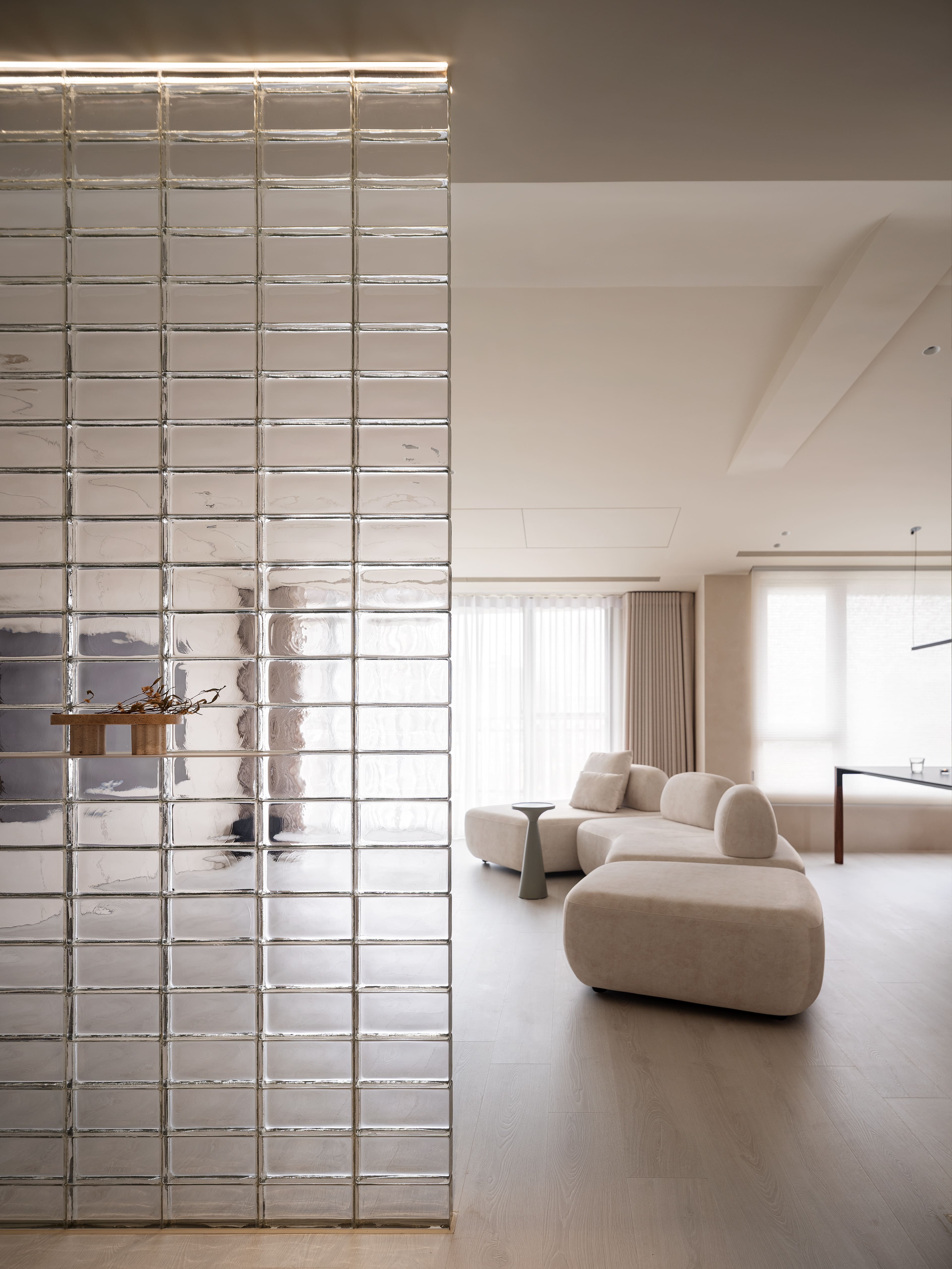 “Redefine” transforms a 10-year-old residence into a serene, low-maintenance home for a minimalist couple. Guided by wabi-sabi and contemporary minimalism, the design employs subdued hues, mineral textures, and curving lines to balance raw simplicity with refined elegance. A glass-block entry screen defines the threshold with light and transparency, while a U-shaped kitchen island with staggered counters adapts to both cooking and casual dining. Subtle arcs soften beams and corners, while natural finishes enhance tactility and ease of care, creating a timeless backdrop for evolving family life.