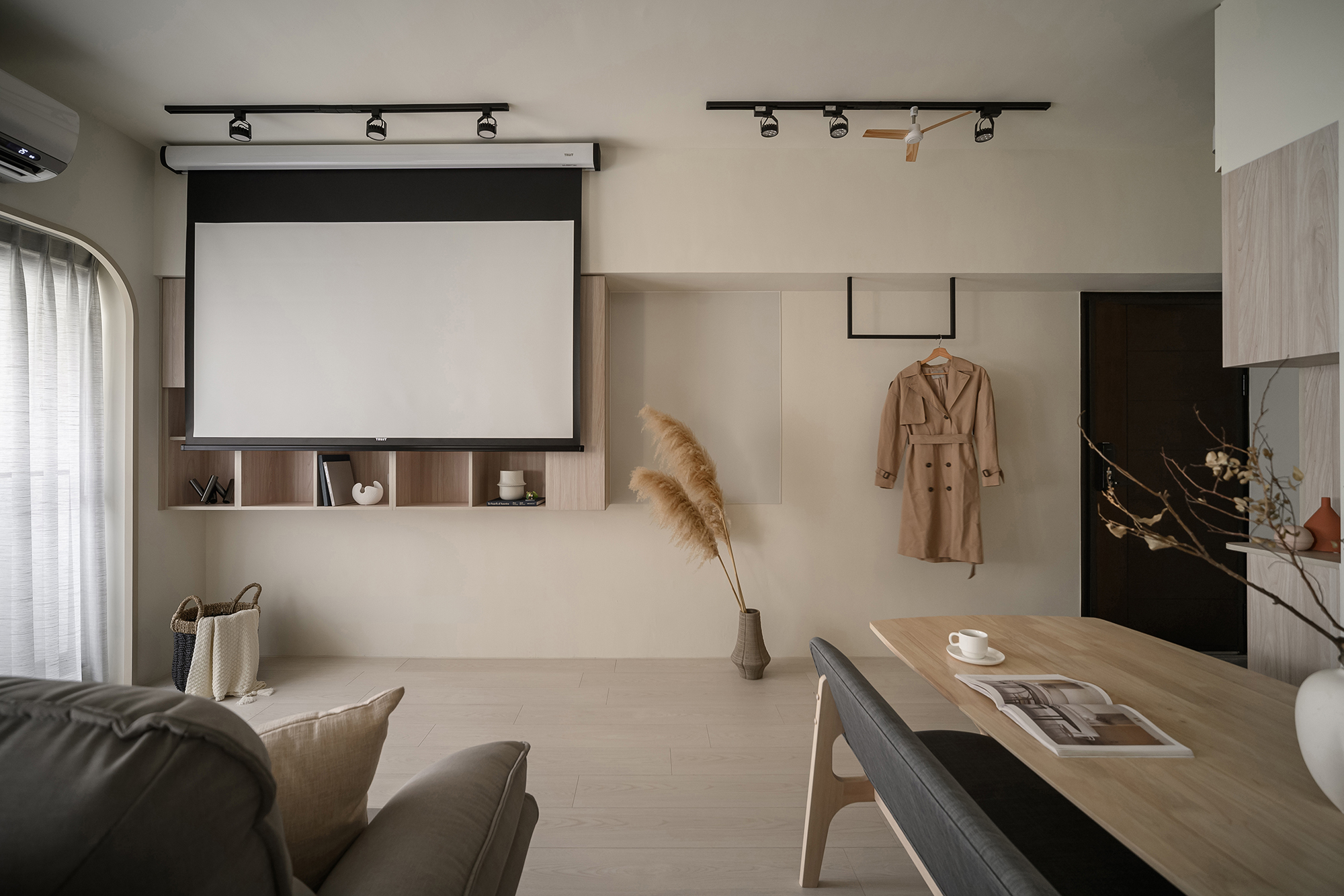 The overall style continues the Japanese-inspired simplicity of Muji aesthetics, with white and light wood as the main palette to create a gentle and airy atmosphere. The most distinctive idea was to break convention. Instead of a traditional television wall, a retractable projection screen was installed, freeing the wall to become a large bookcase. This fulfilled the owners’ love of reading while surrounding the children with books as they grow; when the screen descends, the family enjoys movie nights together, blending functionality with emotional connection.