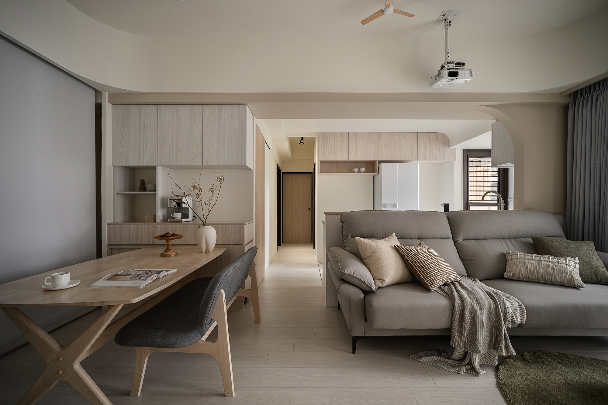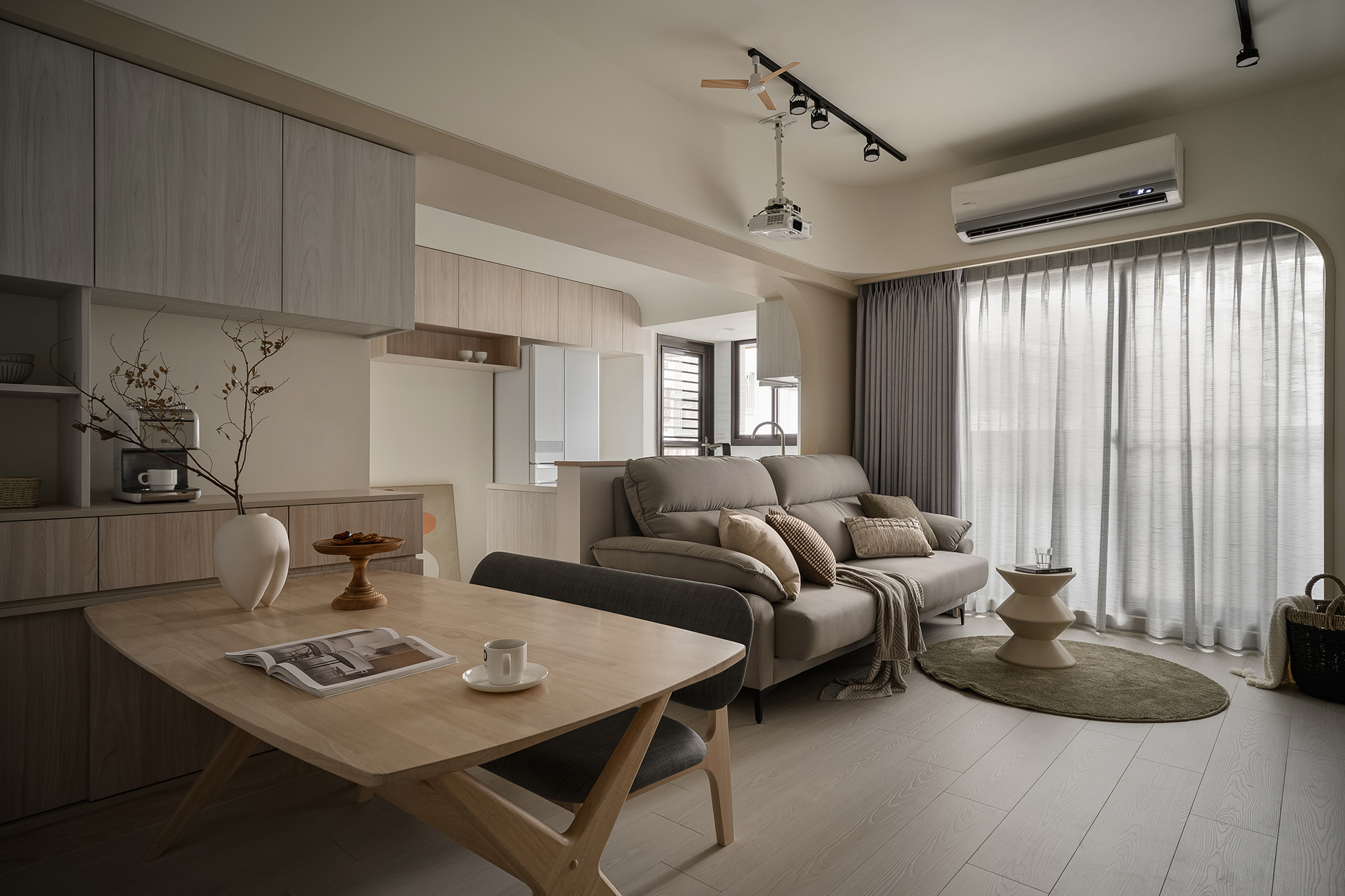 Another highlight is the use of curved vocabulary. Large, heavy beams were softened with arcs that extended to the sofa backdrop and curtain boxes, turning sharp edges into fluid lines and creating an open, flowing visual movement. The 65 cm low dining table also broke standard proportions, encouraging relaxed, natural interaction between children and adults, fostering warmth in daily life.