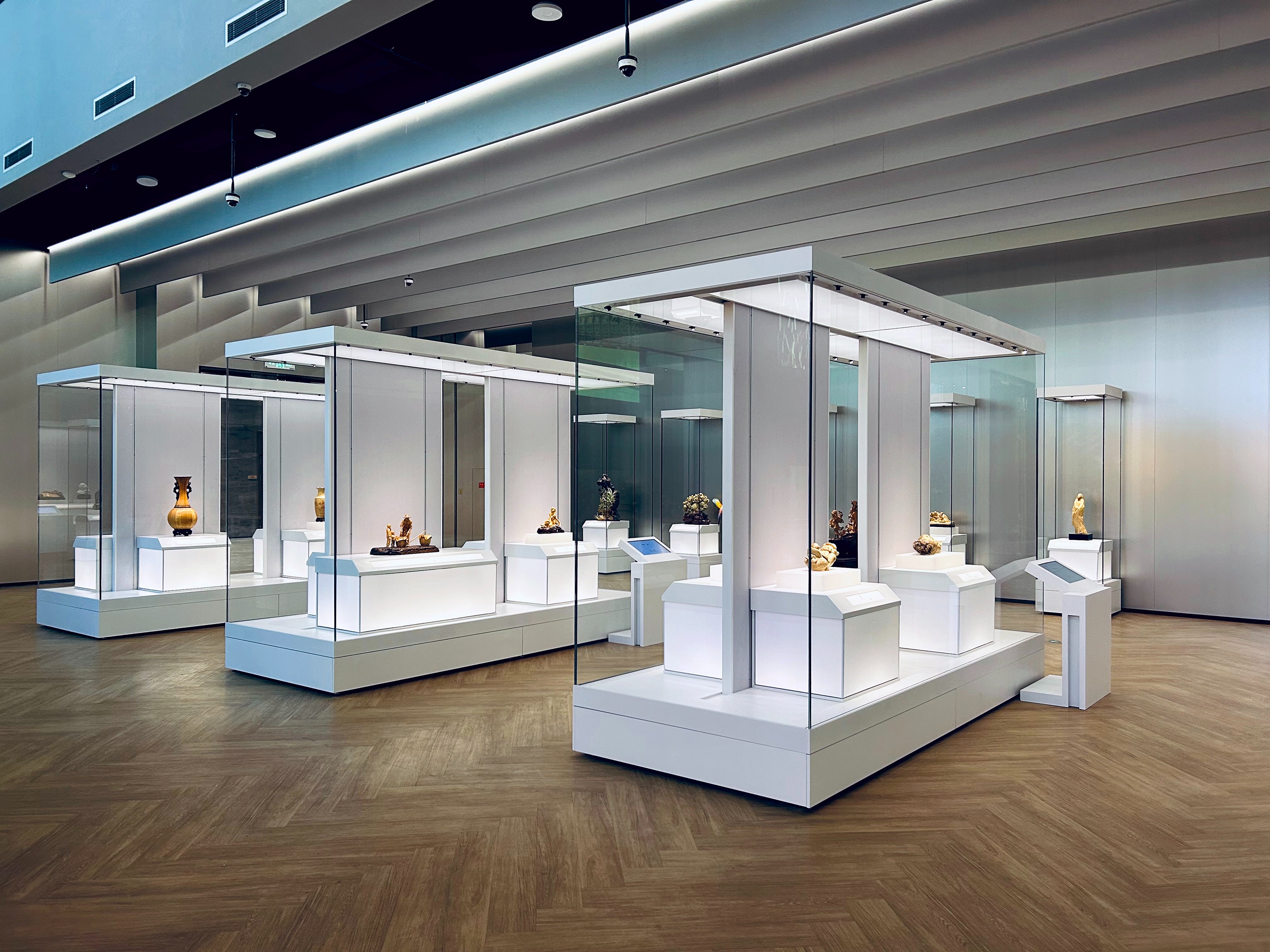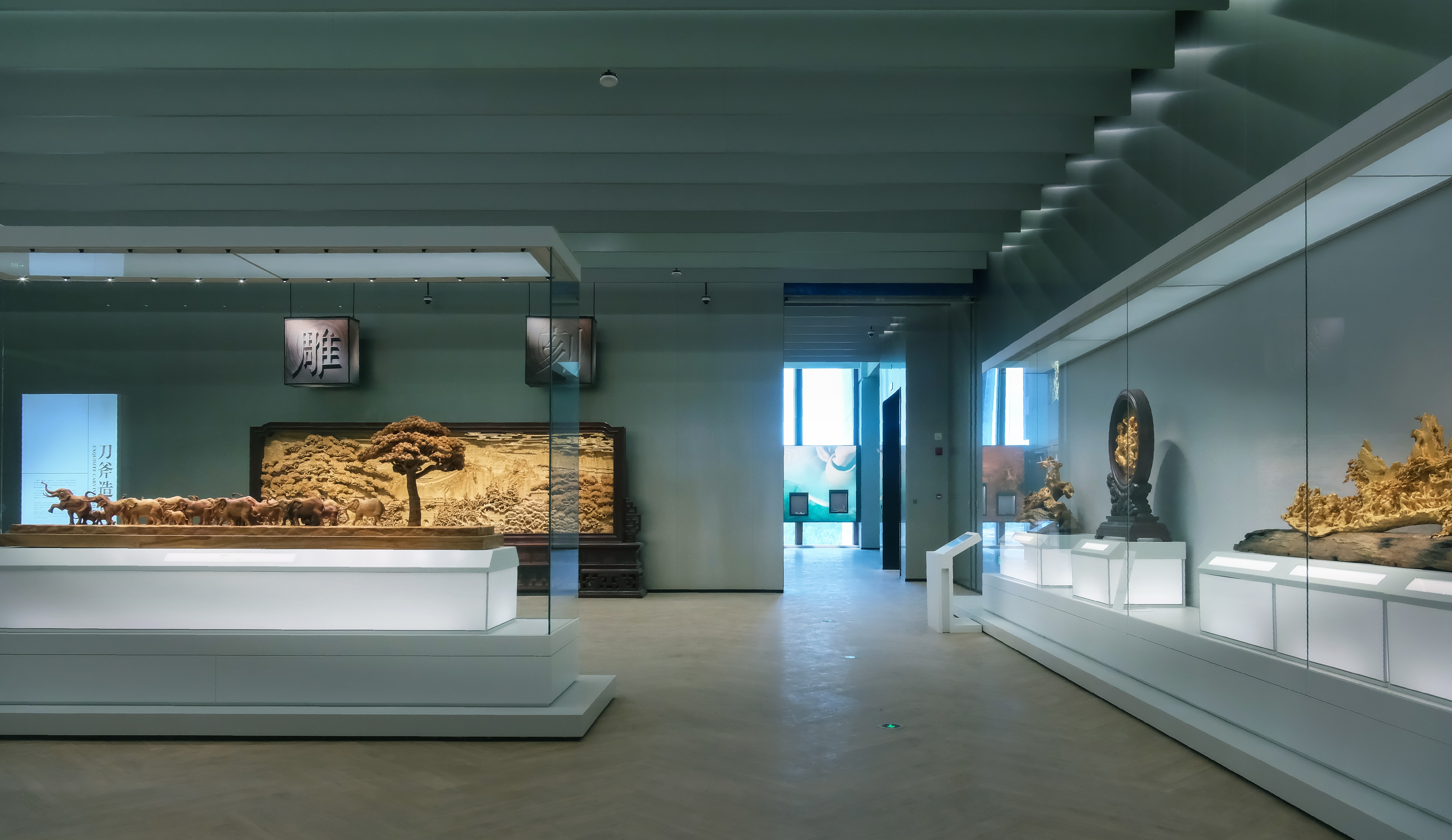 The spatial language adopts lightness and simplicity, using subdued palettes and modern lines to frame heritage works as protagonists. Exhibition methods combine structural installations with digital media, reinterpreting traditional crafts in contemporary form. Material innovation is central: anodized aluminum is applied extensively for the first time in a museum, complemented by natural daylight through expansive glass curtain walls. A vast 23-meter-wide window forms the “Eye of Intangible Heritage,” subtly integrating a traditional stage as a link between past and present.