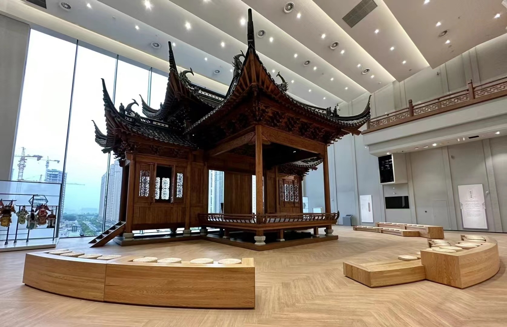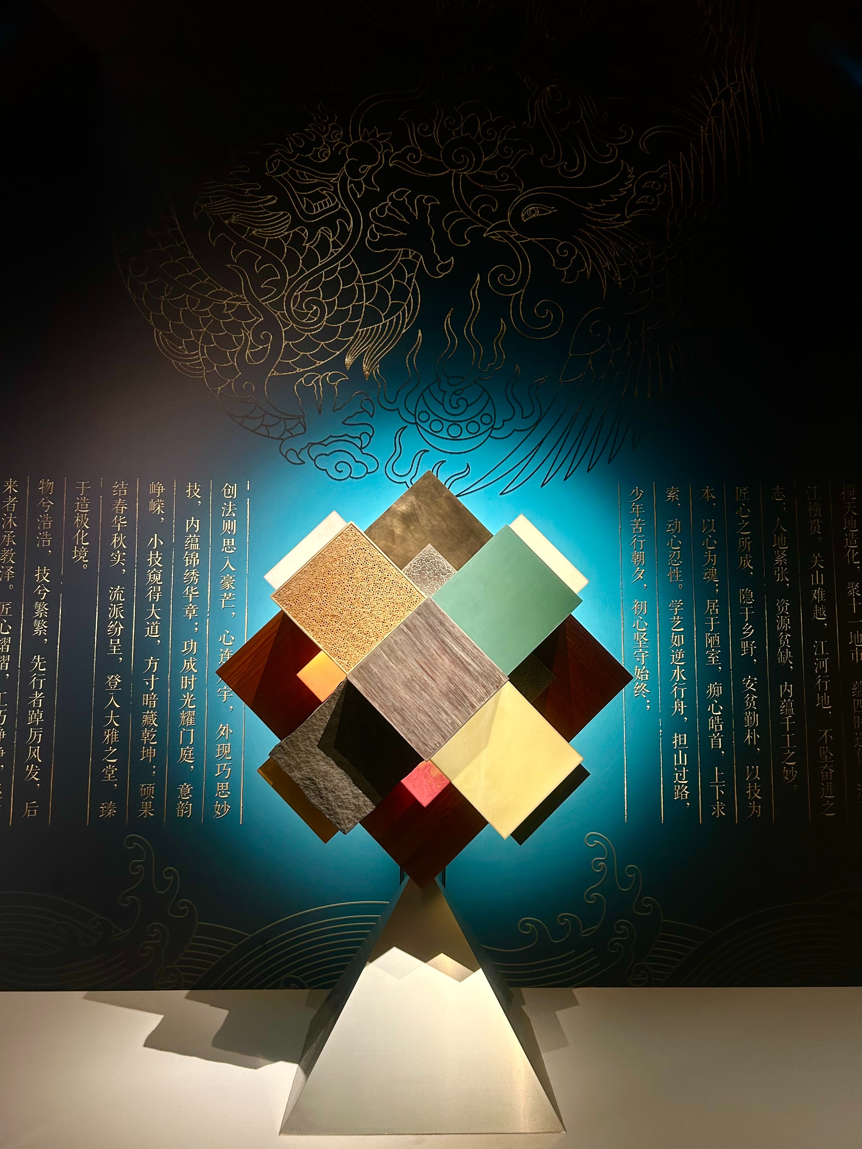 A symbolic highlight is the Luban Lock installation in the entrance hall. Suspended in space and supported by a traditional blade, it incorporates diverse materials from ten heritage crafts, embodying the precision and ingenuity of Zhejiang artisans. This emblem reflects both the diversity of local traditions and the persistence of generations of craftsmen.