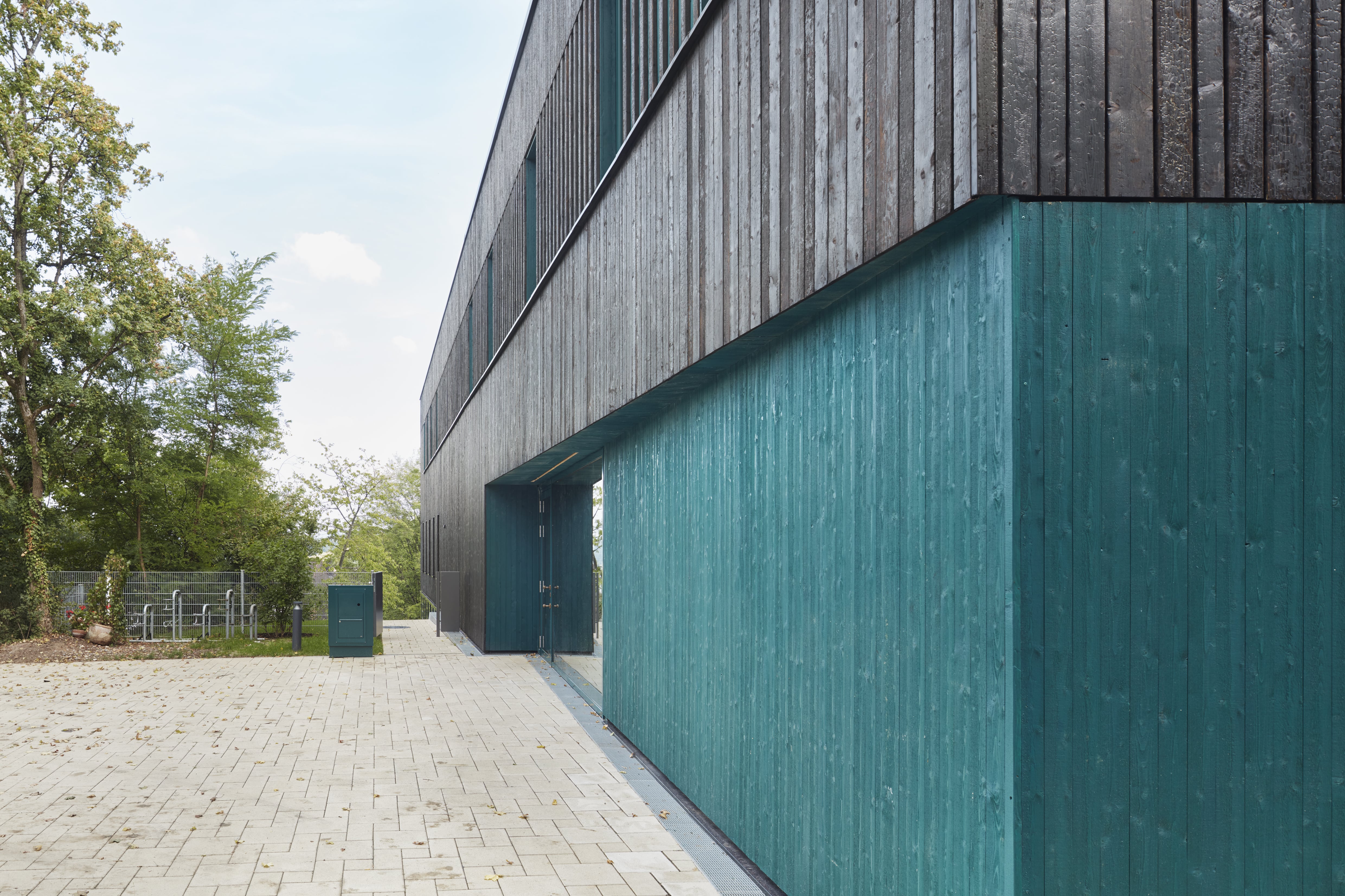 The timber frame structure achieves an enchantingly mystic effect with its façade made of charred spruce and glazed, teal spruce that weaves a pattern. The glazed entrance is set at an angle within the façade, framed in intensely bright, glazed, teal spruce.