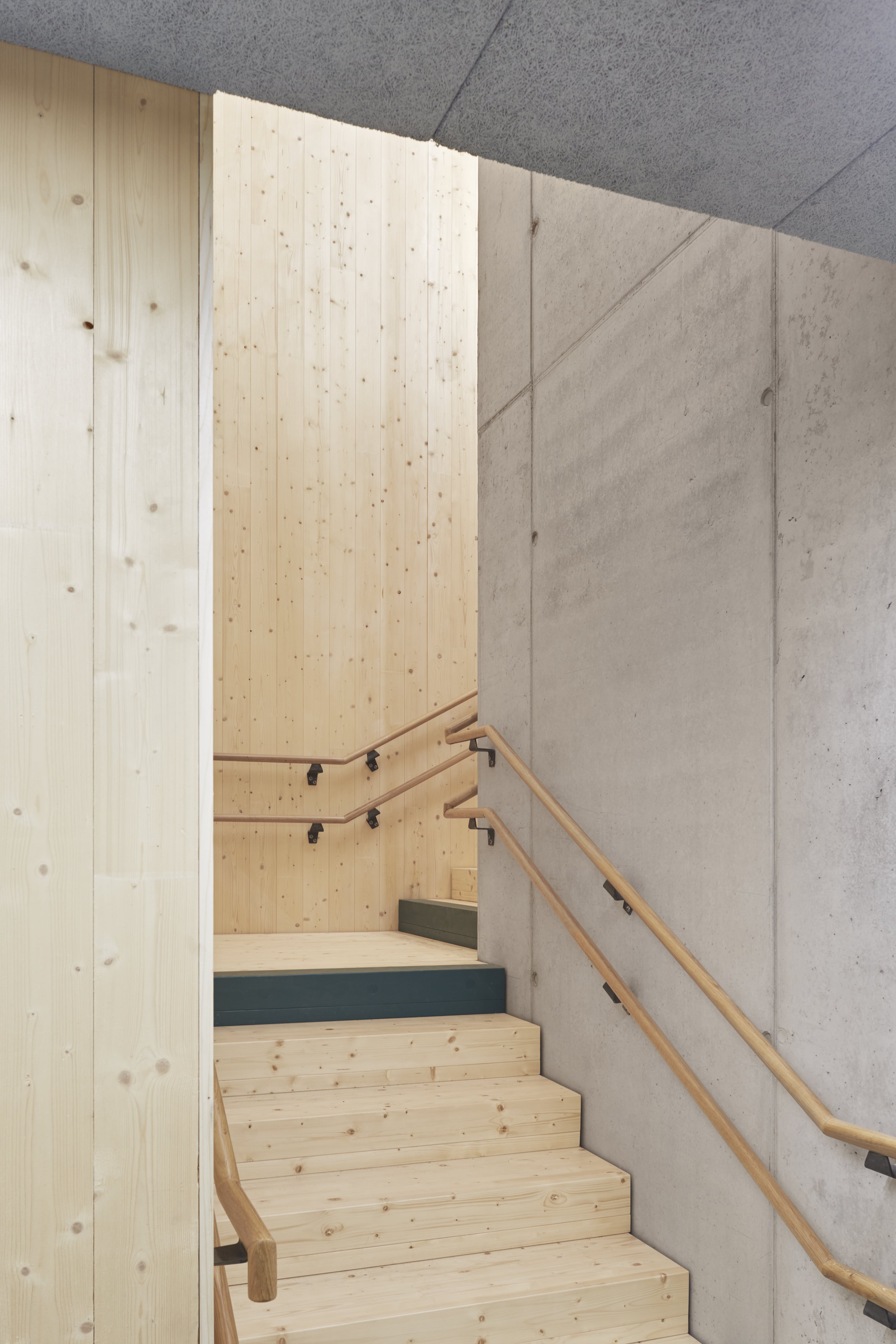 The staircase unites the lift shaft’s exposed concrete with the spruce timber and black steel in a configuration which stimulates children’s natural curiosity to explore their sensory perceptions.
