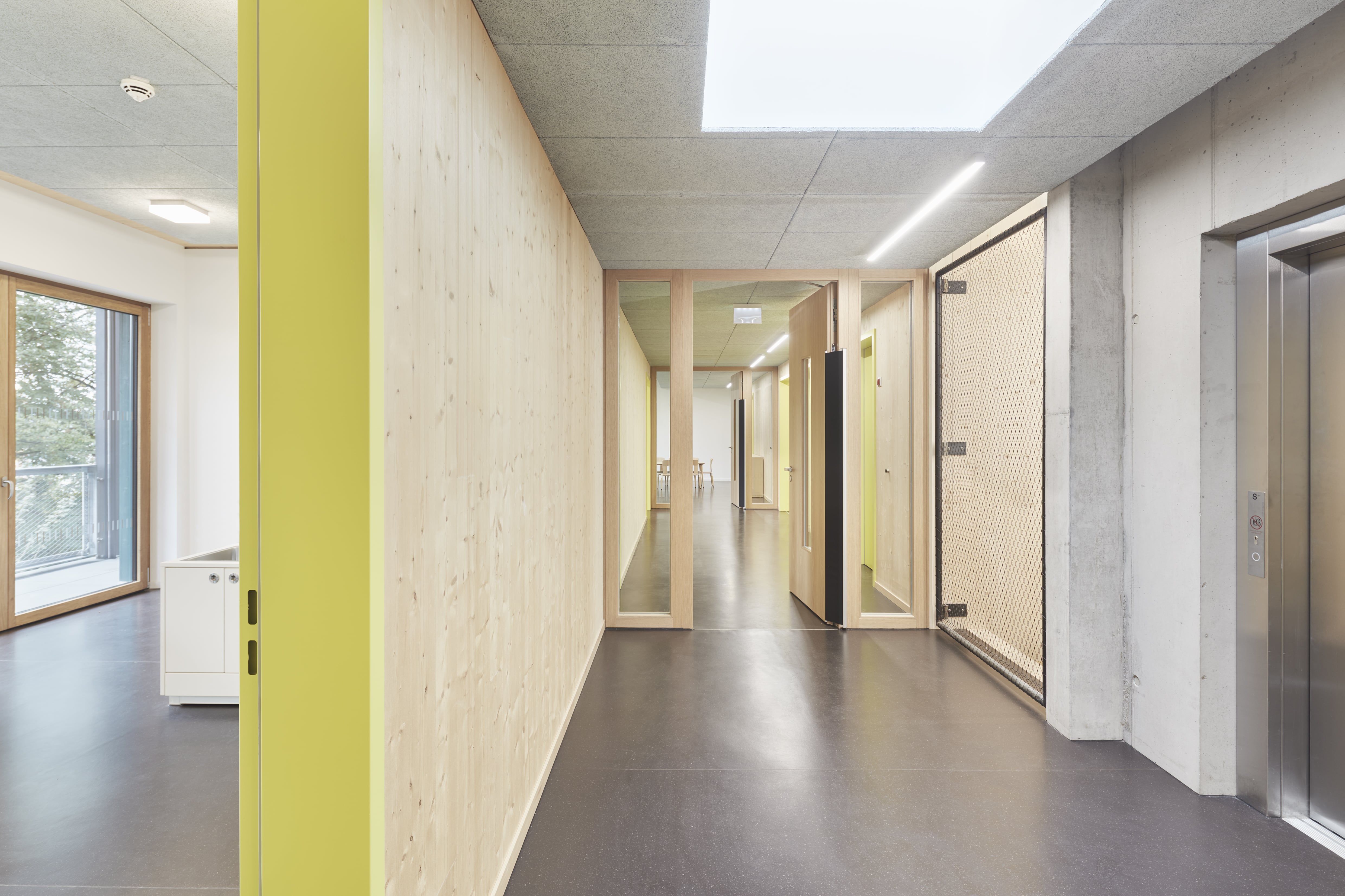 The communication system between materials and colours resembles a bright forest clearing. Walls of light-coloured spruce grow out of a dark-brown, earthy rubber floor. The sulphur-yellow oak doors emulate forest flowers. Window seats and wood wool panels forming a blue canopy make nature a central theme.