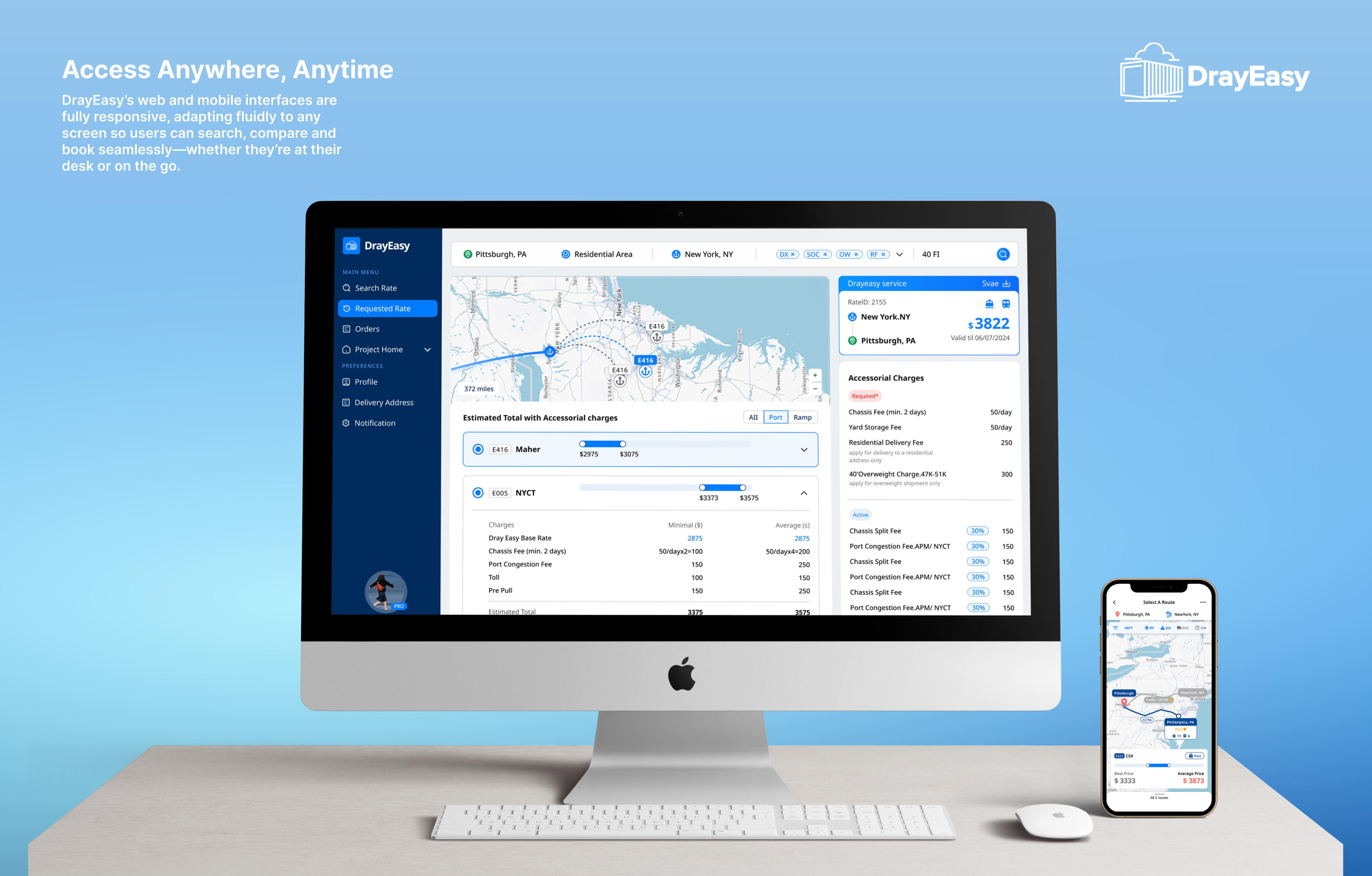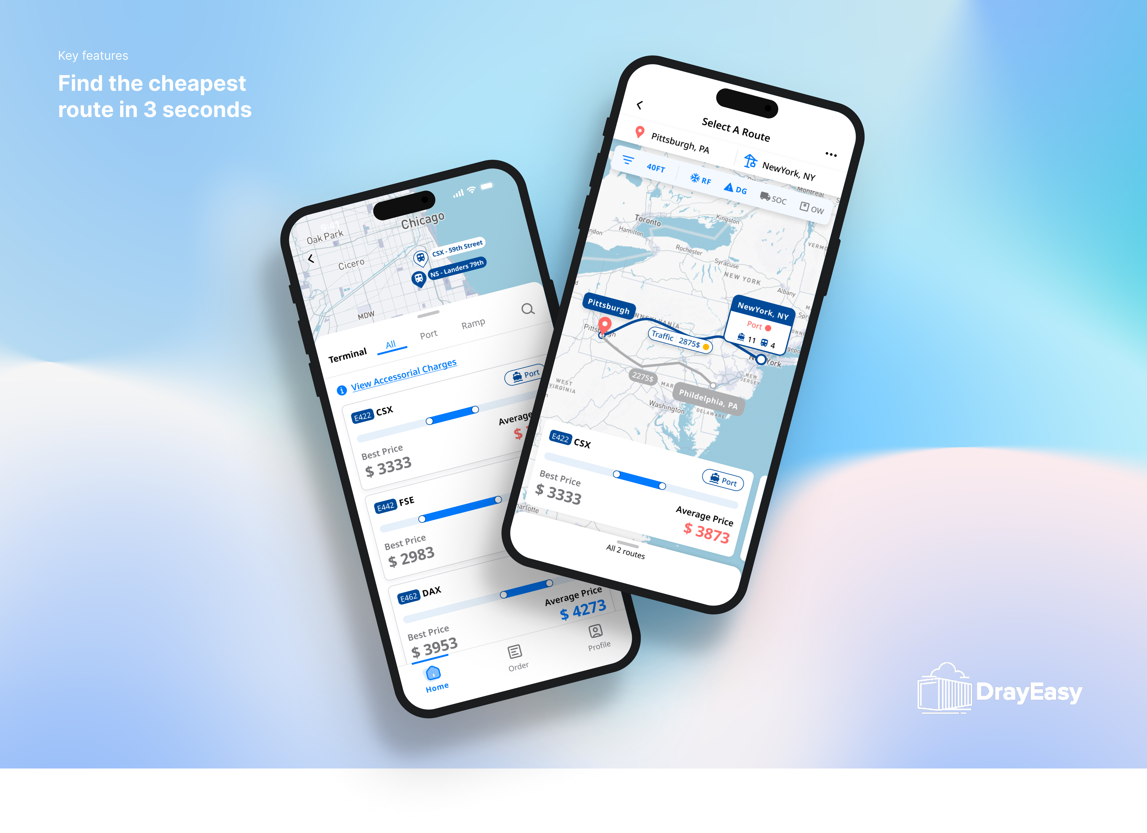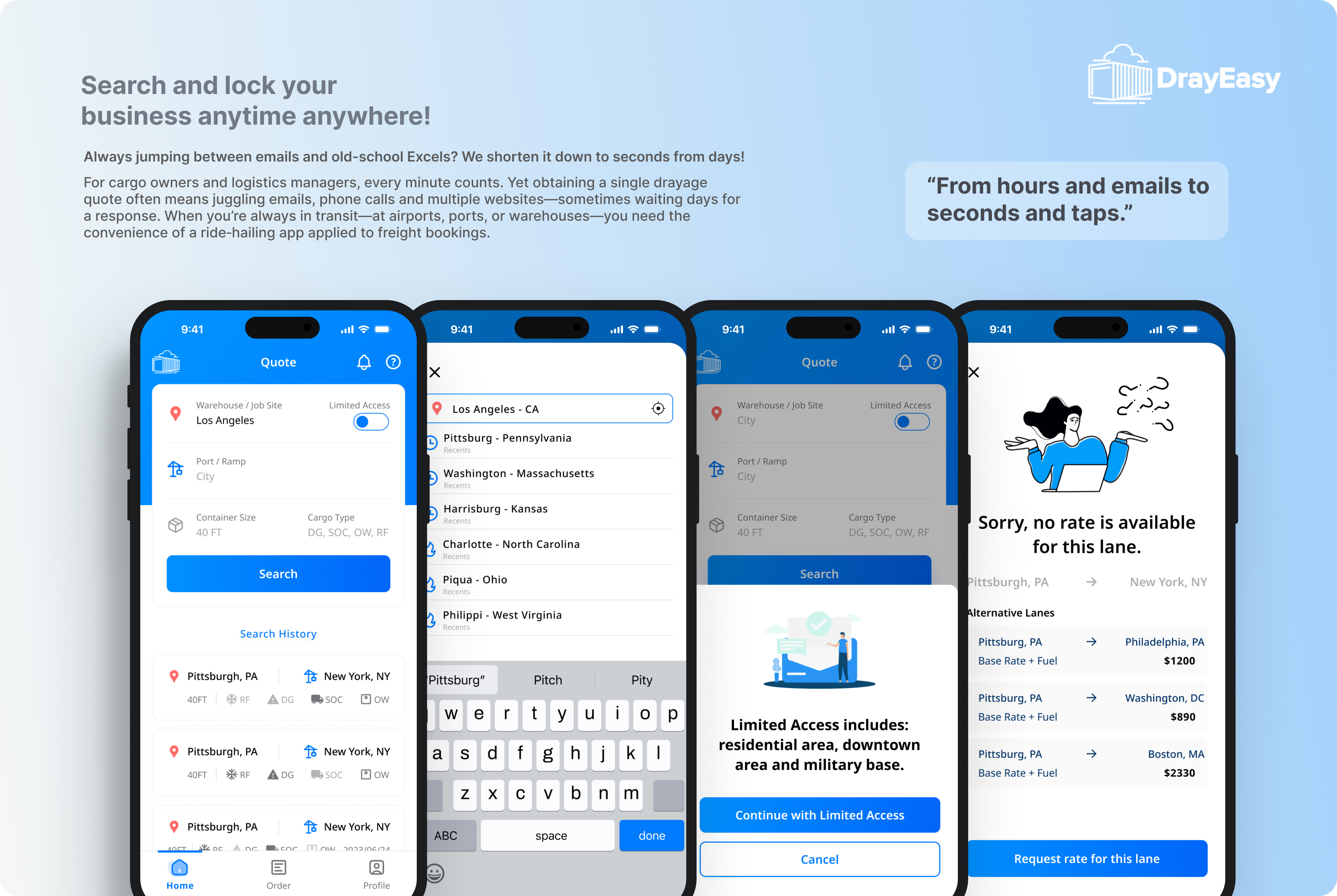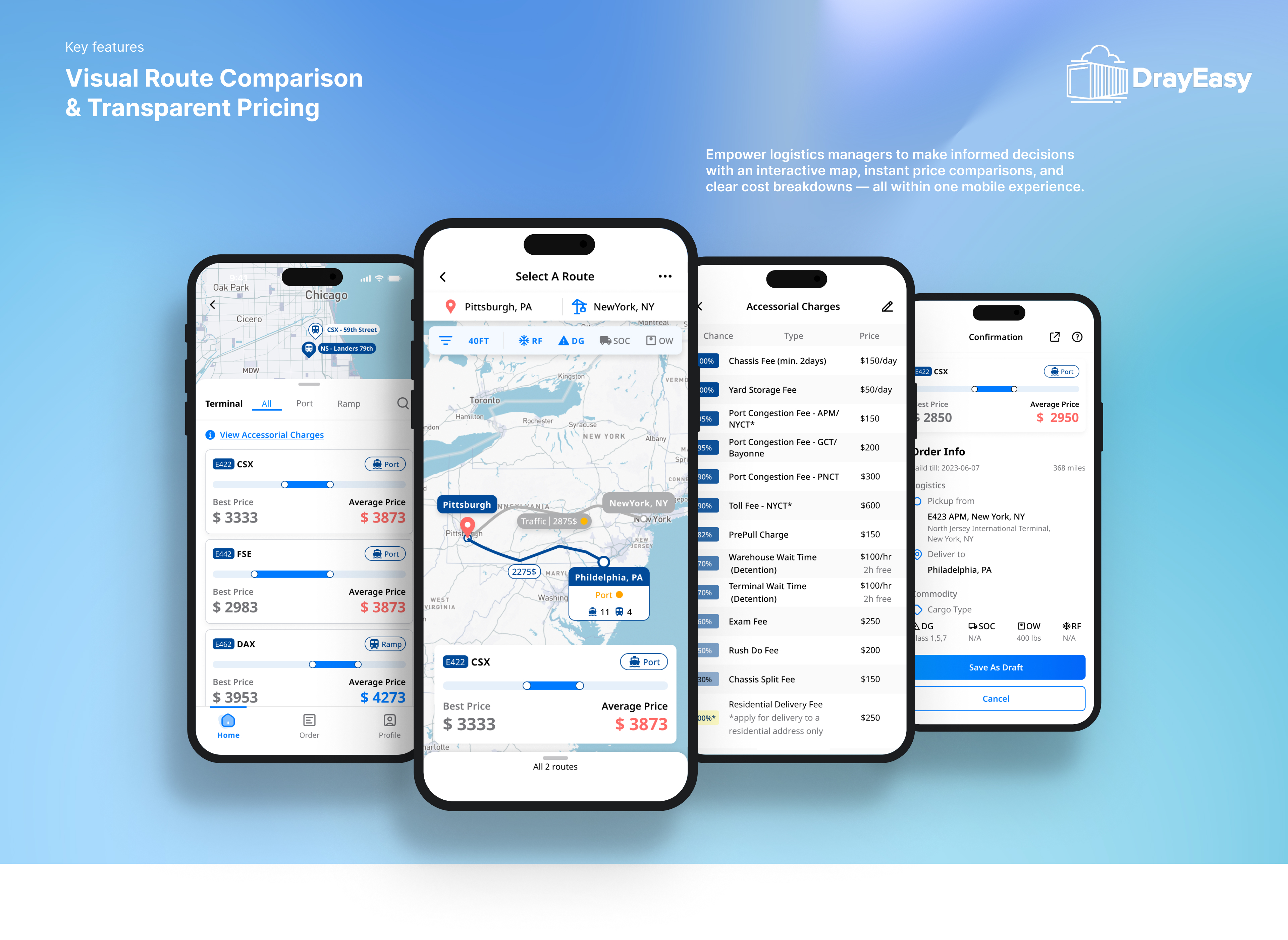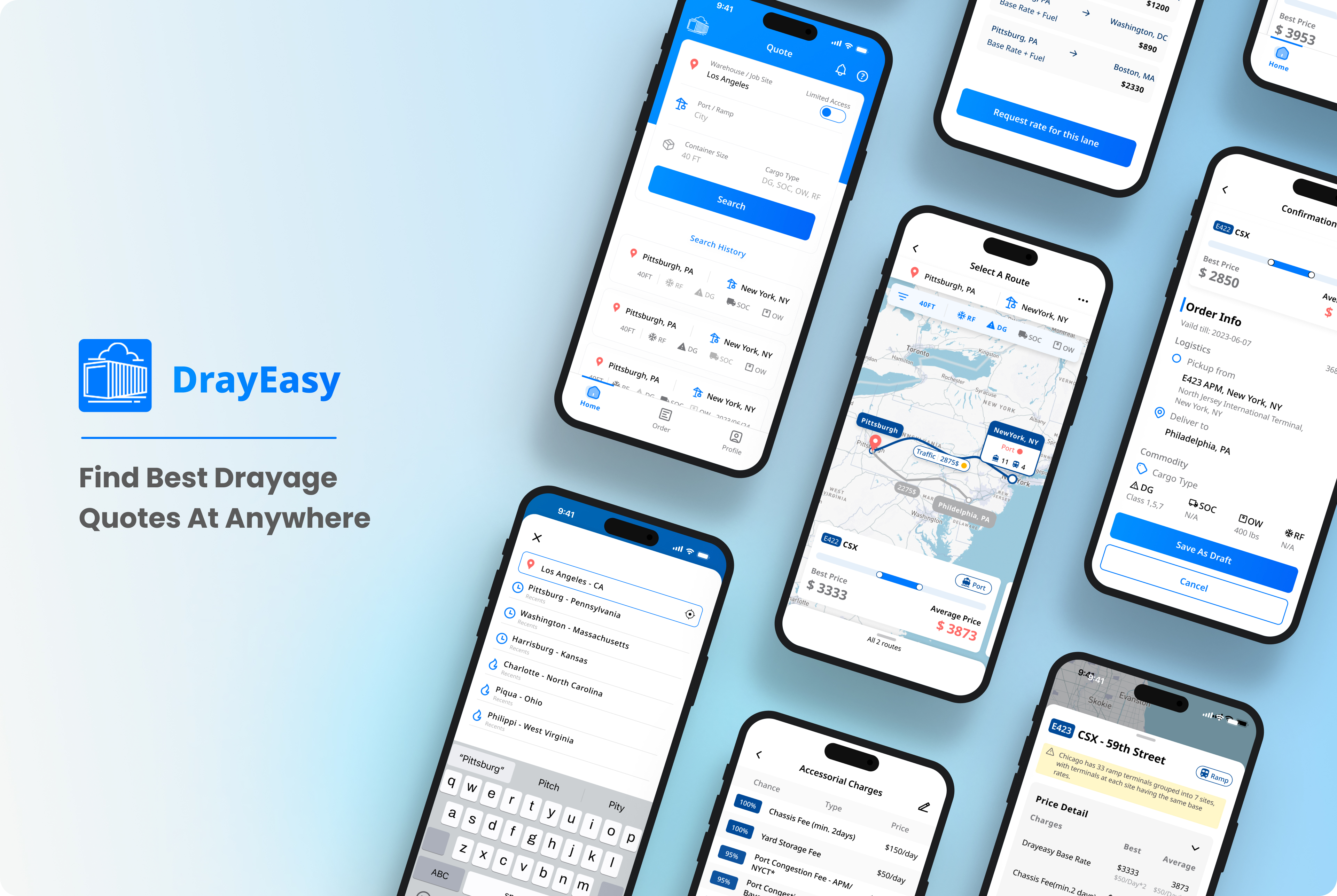 DrayEasy shortens the drayage booking process from 2–3 days to just 5 minutes. Previously, cargo owners and logistics managers could only use a desktop site, requiring long sessions at a computer just to get a single quote. As a two-person design team, we extended the platform to mobile to reduce friction and recover lost market share. Research showed 67% of users found the desktop order flow too slow, and 80% of logistics managers worked on the move. Through interviews and usage analysis, we iteratively designed user flows, wireframes, prototypes, and high-fidelity UI, standardizing branding and accessibility across products. The mobile app introduced a streamlined experience with a prominent search bar, reusable history cards, suggested quotes when no results appear, and an optional map view of ports. By removing unnecessary steps, users could now search, compare, and book in minutes. Launched in 2024, the redesign drove a 230% increase in daily active users, a 47% boost in order quantity, and significant reductions in order completion time. DrayEasy’s mobile transformation shows how data-driven, user-centered design can improve customer satisfaction while aligning with business growth.