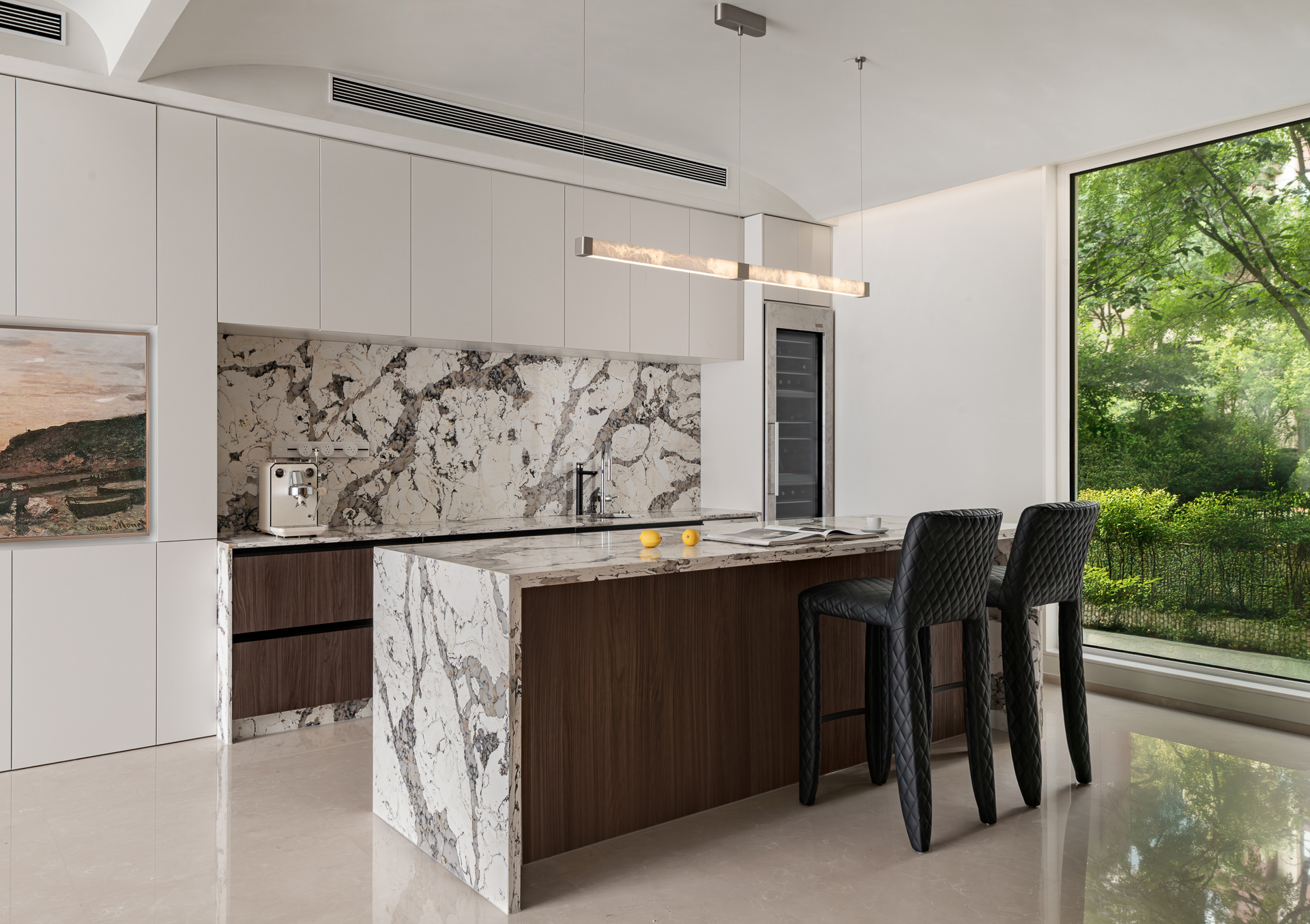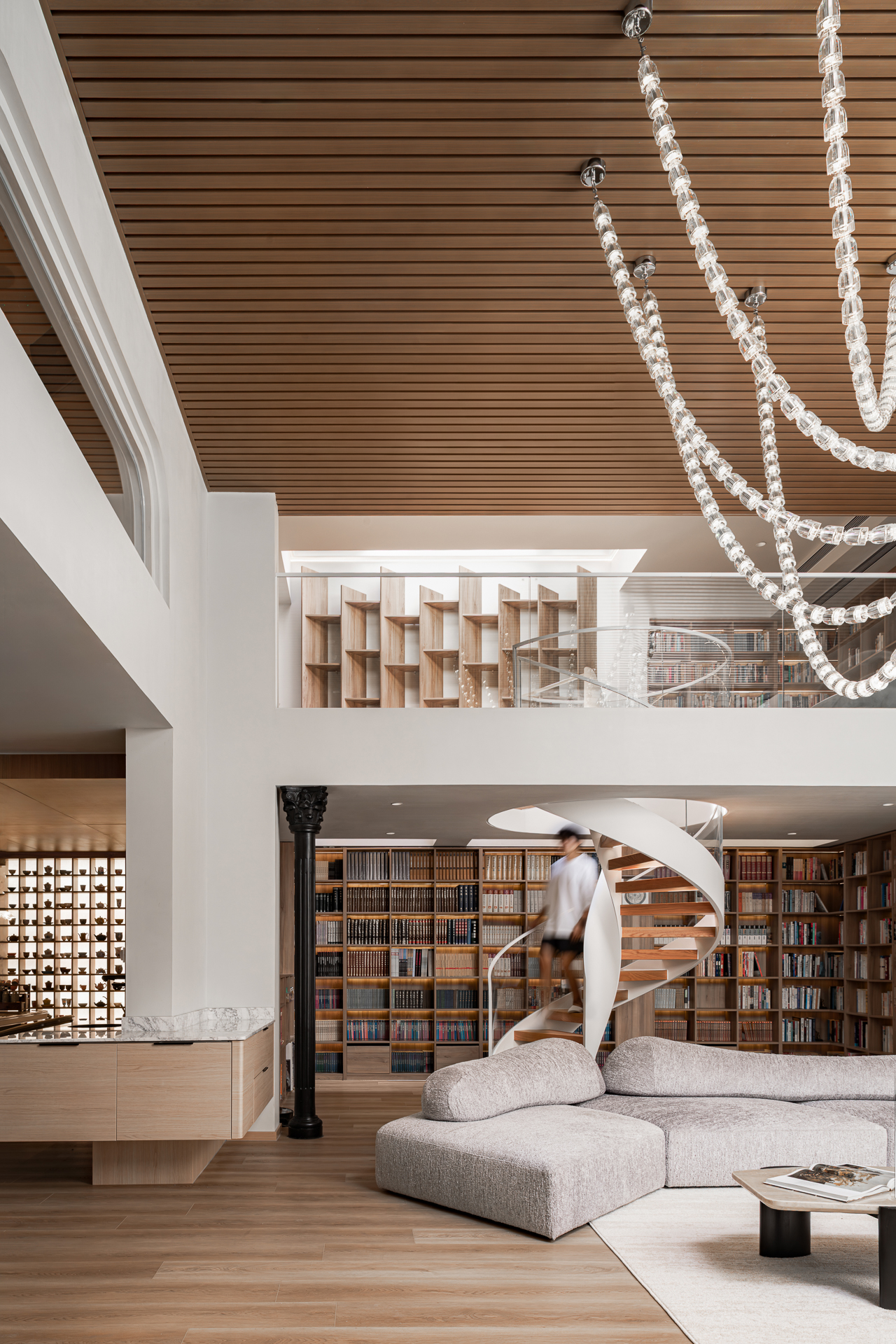With a human-centric approach, the layout is reimagined according to human scale and object proportions. Flowing and open circulation, an interactive basement, spiral staircase, and double-height windows enhance leisure awareness and family interaction, significantly improving the residence’s humanized quality.