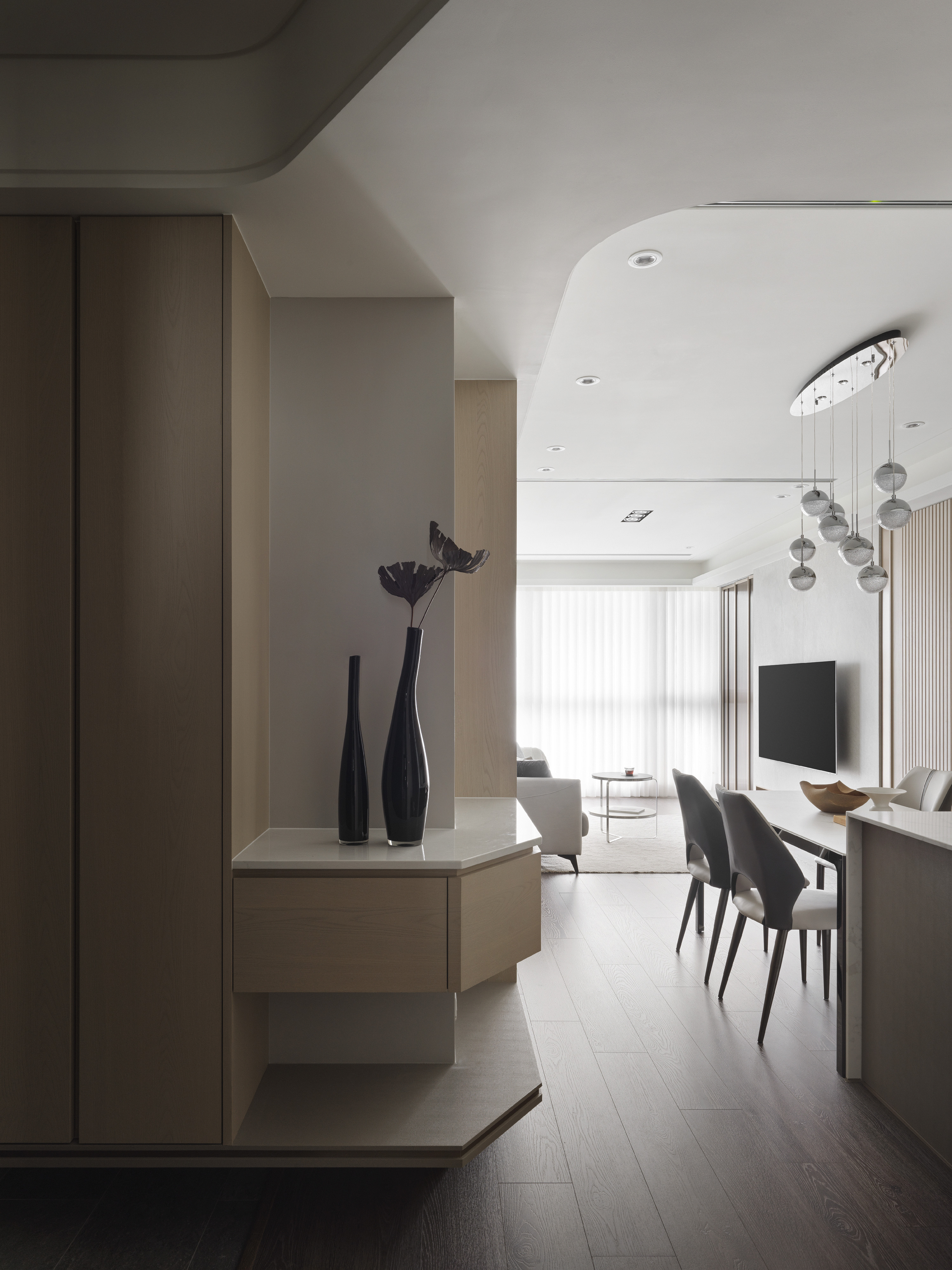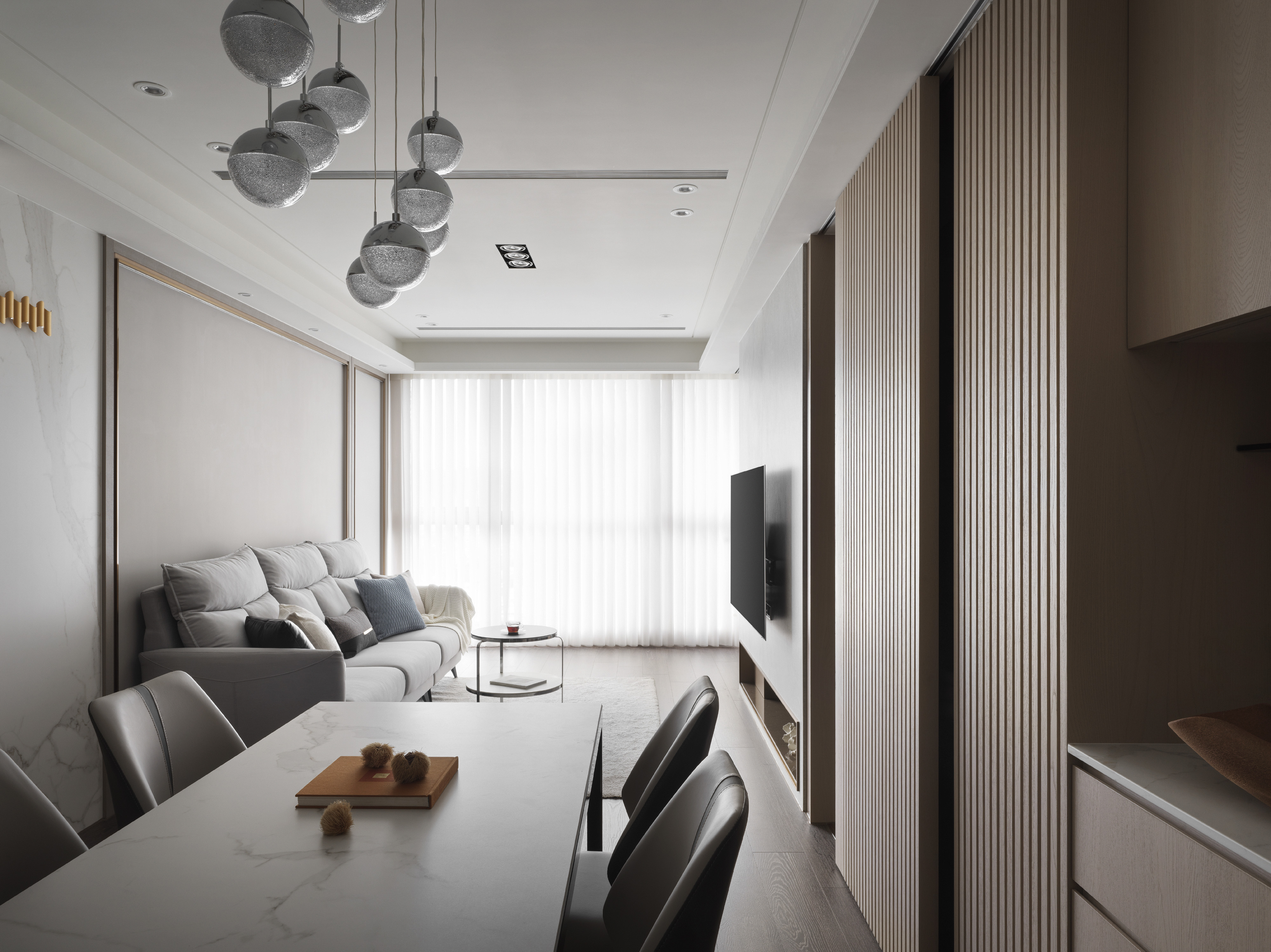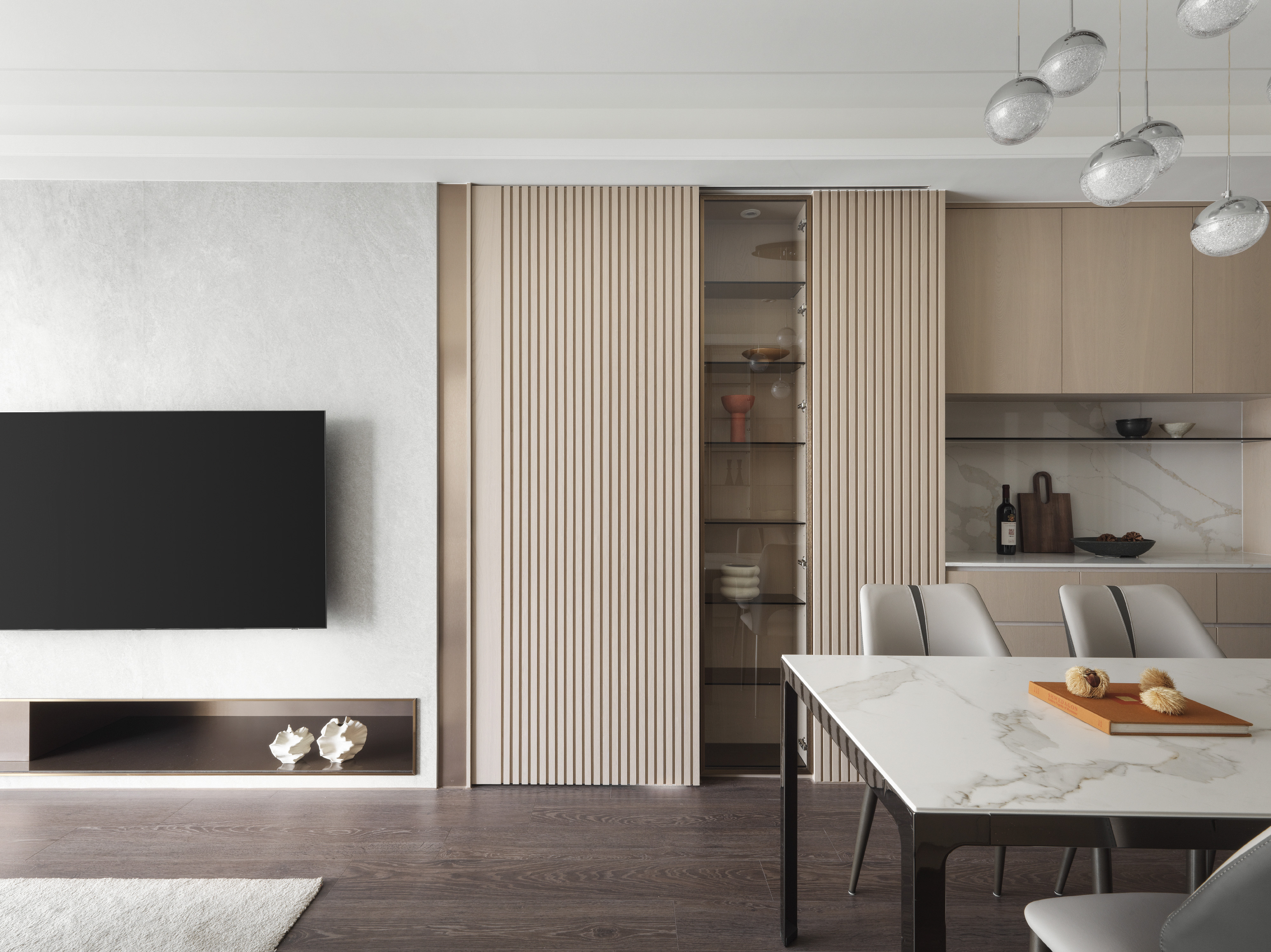 Thoughtfully redesigned the high floor with expansive windows to maximize its views. Removed the original partitions and replaced the frosted sliding glass doors, allowing the living room to enjoy a dual panorama of floor-to-ceiling windows when opened. Swap the positions of the sofa and TV wall to bring the scenery as a central part of daily life.