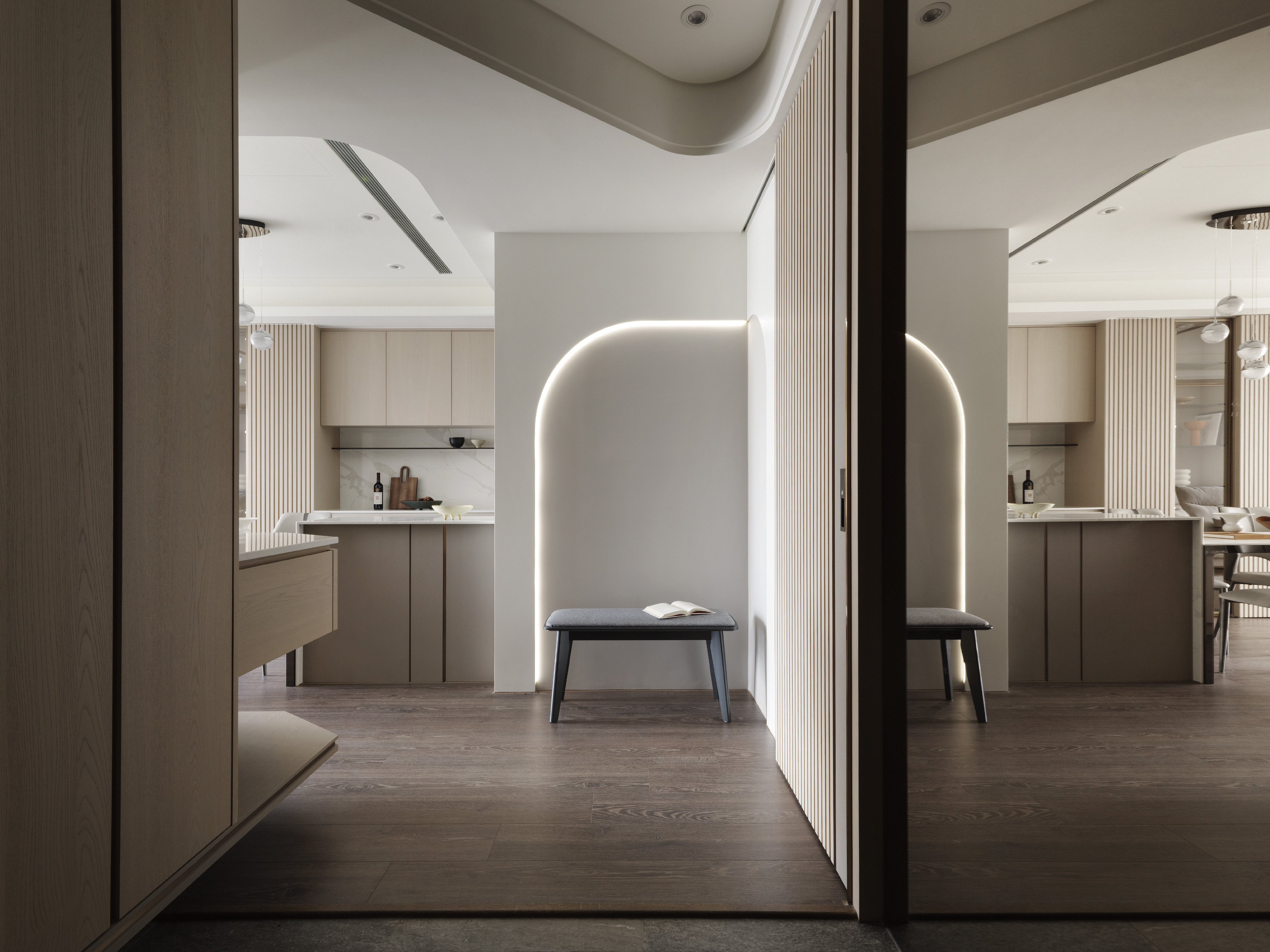 A sense of quiet luxury guides the material palette—restrained, contemporary, and yet rich in detail—warm woods are paired with accents of metal and leather, enhancing the layers of the interior. Subtle stone patterns and timber tones anchor the space while brushed metallic finishes introduce a refined touch. Grille lines and curved contours soften the geometry, creating a flowing, user-friendly design. The atmosphere that results is calm, elegant, and inviting.