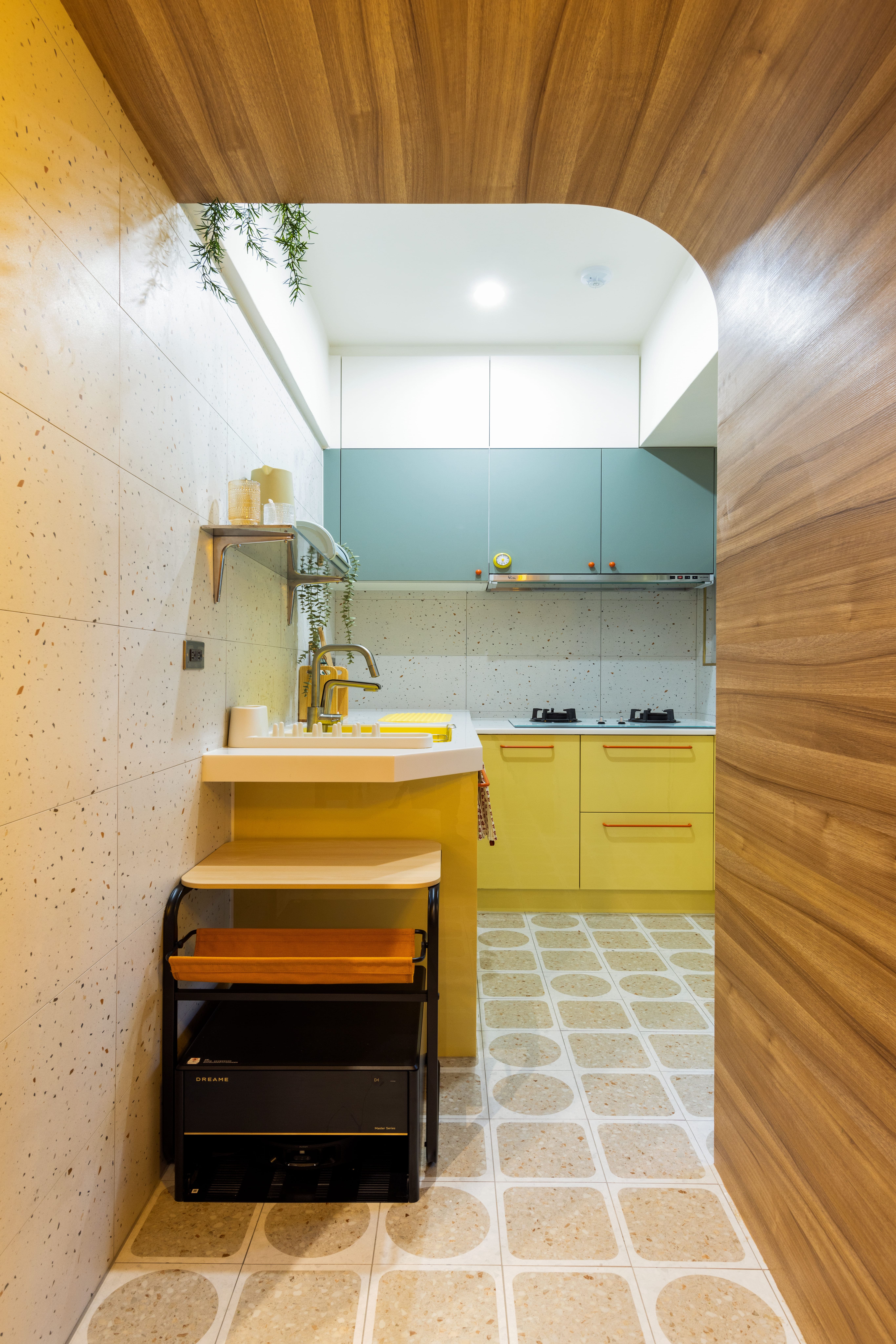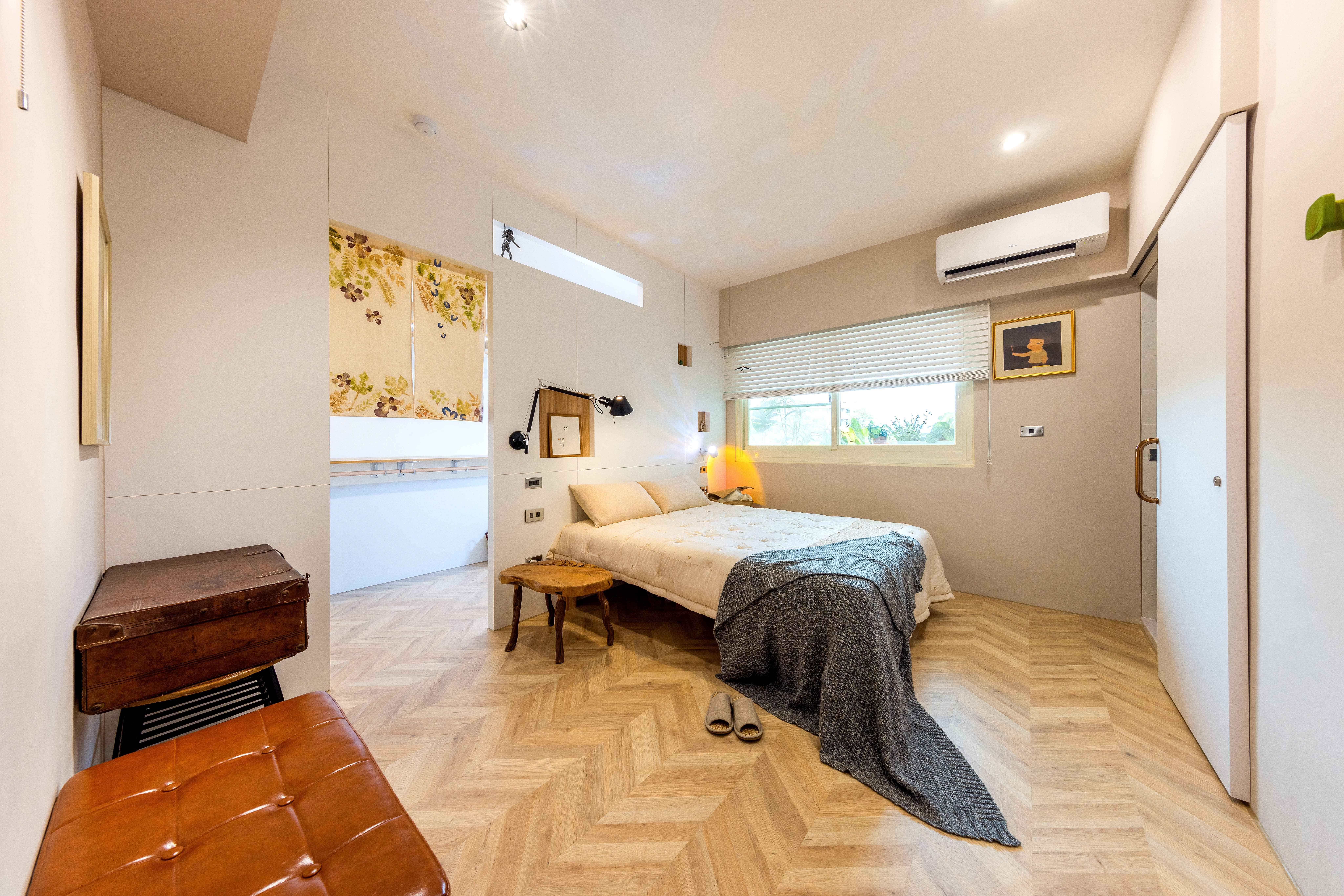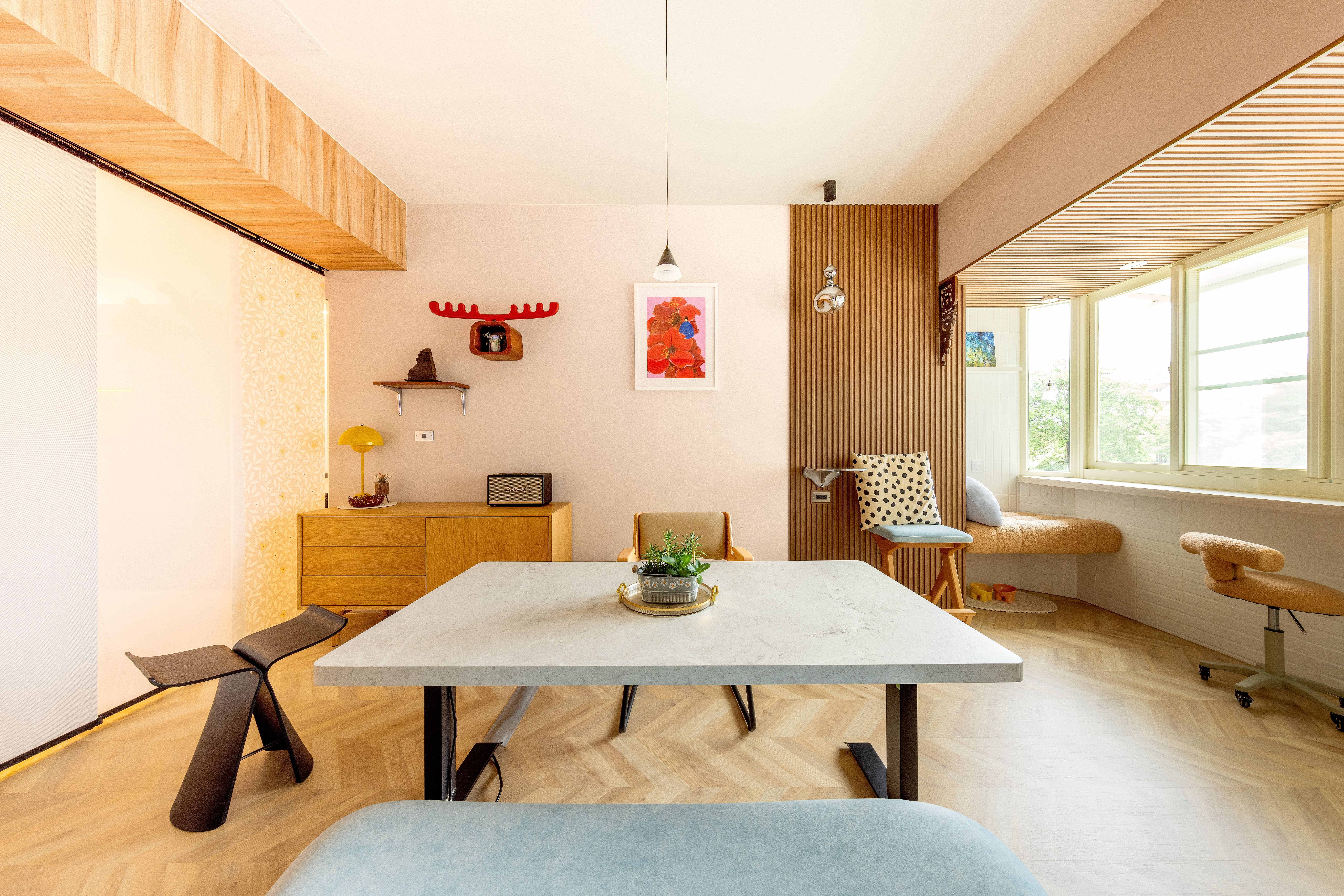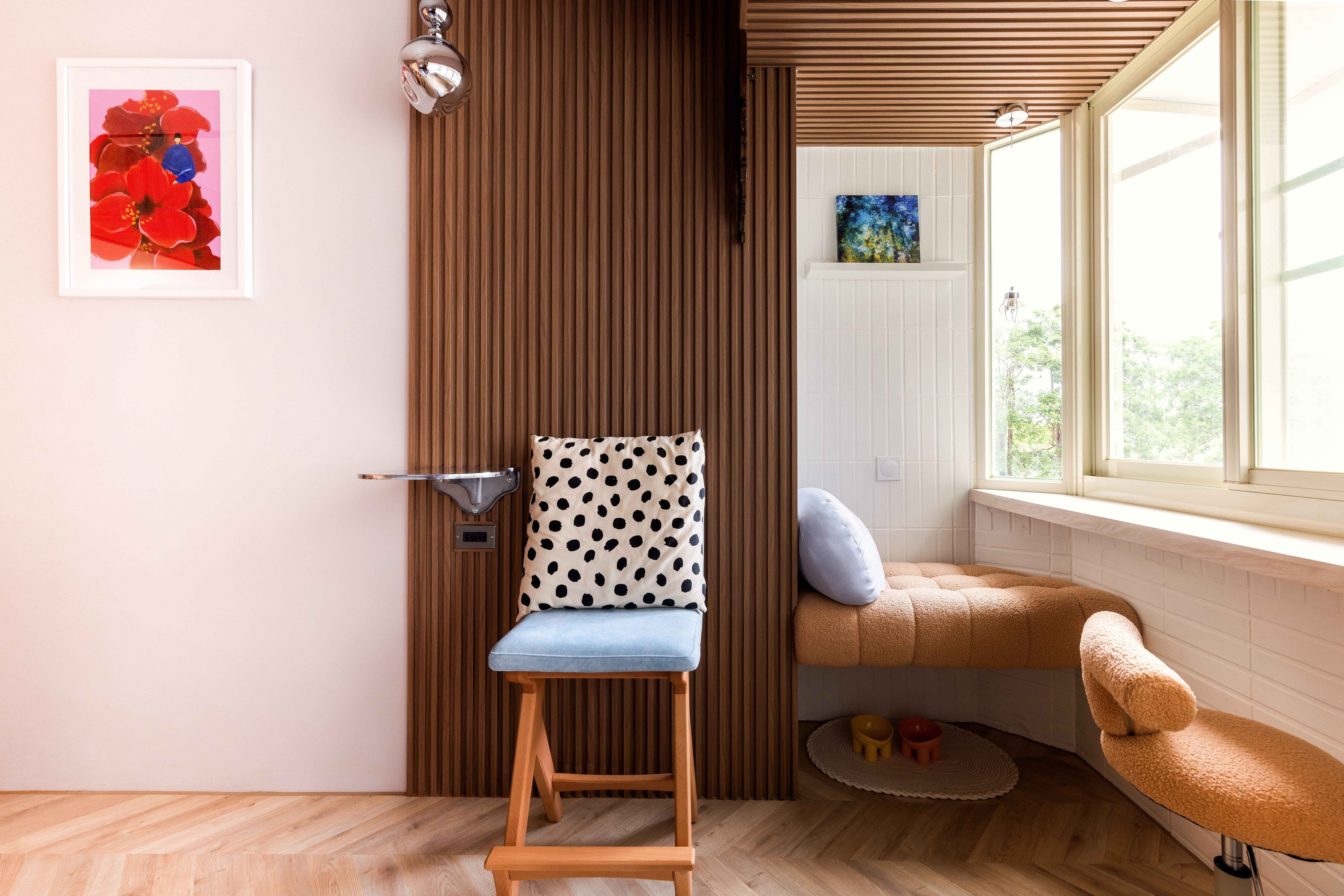 Safety is embedded in daily living. In the hallways, handrails are equipped with motion-sensor lights for nighttime guidance. The bathroom features a 90-centimeter shower with slip-resistant flooring, a wider sliding door, a flower-shaped faucet, and a touchless toilet. In the dining area, a navy palette paired with warm yellow light makes a modern bistro, accented by the homeowner’s animal figurines. Warm wood tones and vibrant colors create a calm yet lively atmosphere. In the living room, the original air conditioning vent is preserved and framed with a retro stained-glass window to create shifting plays of light and shadow, infusing daily life with poetic charm. The front balcony is reimagined as a coffee bar and relaxation nook, framing views of the old cityscape and highlighting the interplay of new and old within the home. The master bedroom uses soft pink accents to reflect the female homeowner’s free-spirited personality, complemented by a semi-open walk-in closet that balances functionality and openness. The secondary bedroom embraces a calming green palette for the younger brother with fabric-draped open wardrobes that combine lightness and convenience. Together, the design of both bedrooms provides privacy while still carrying subtle traces of shared life. A cat passage in the storage room wall doubles as ventilation, creating joyful coexistence.