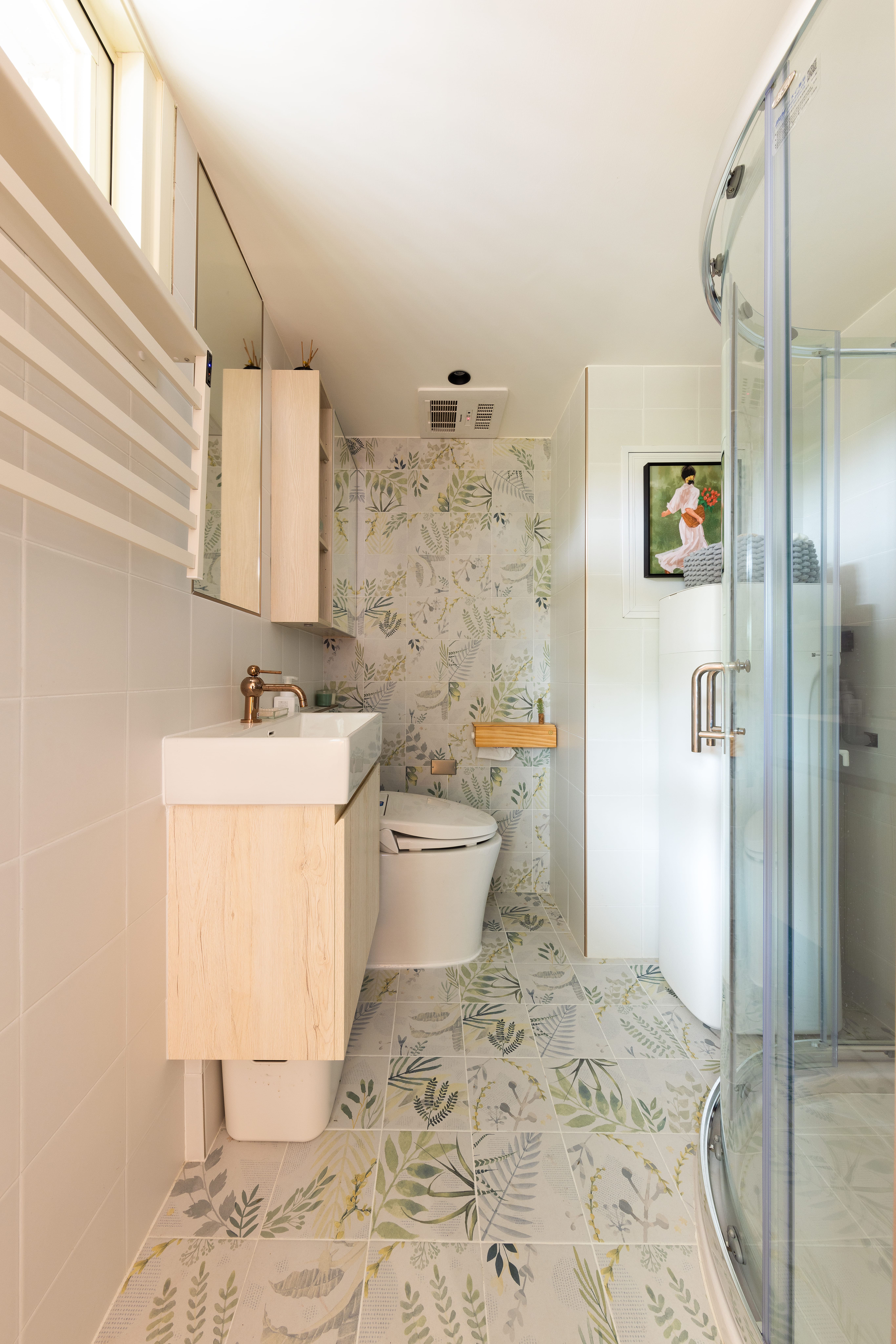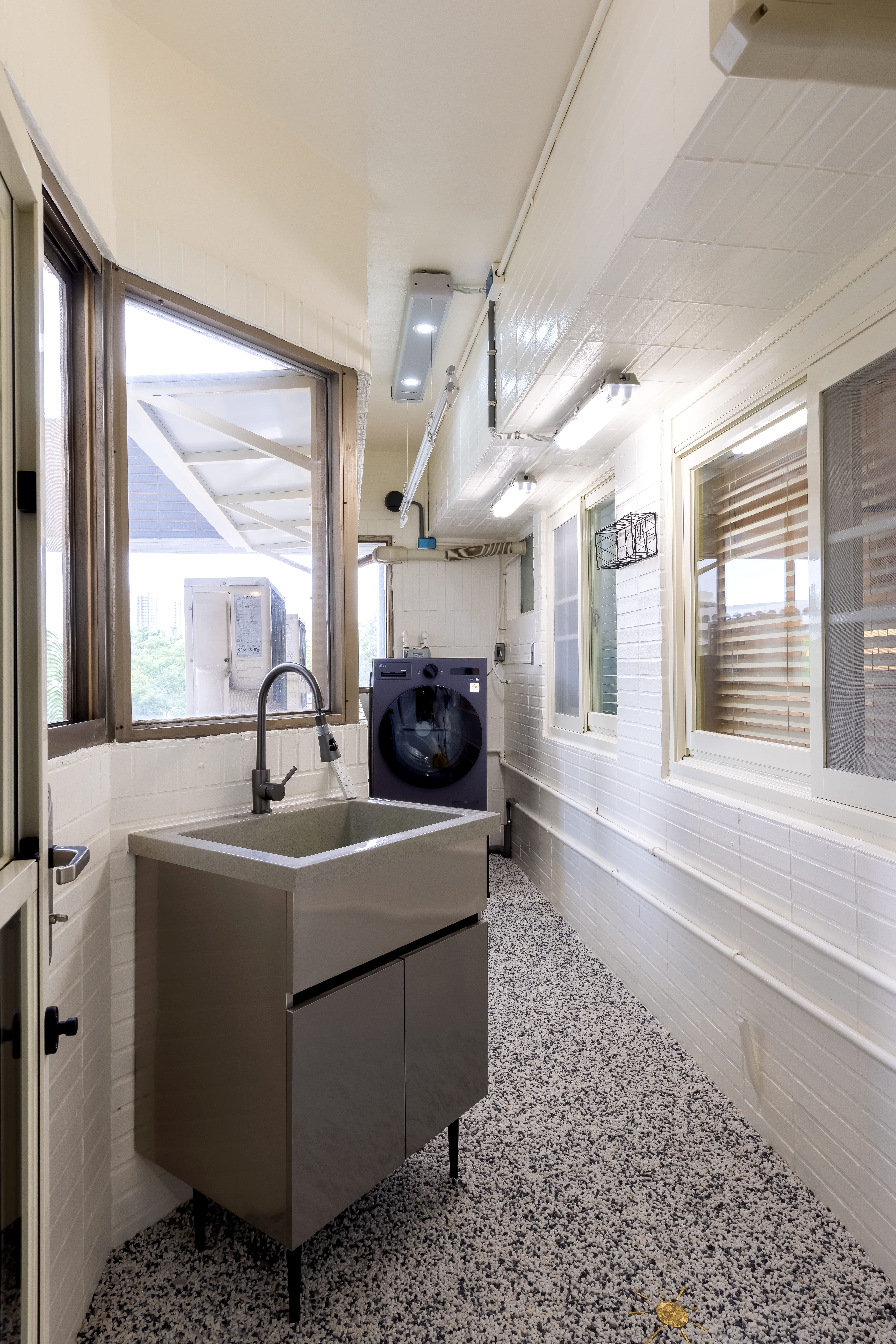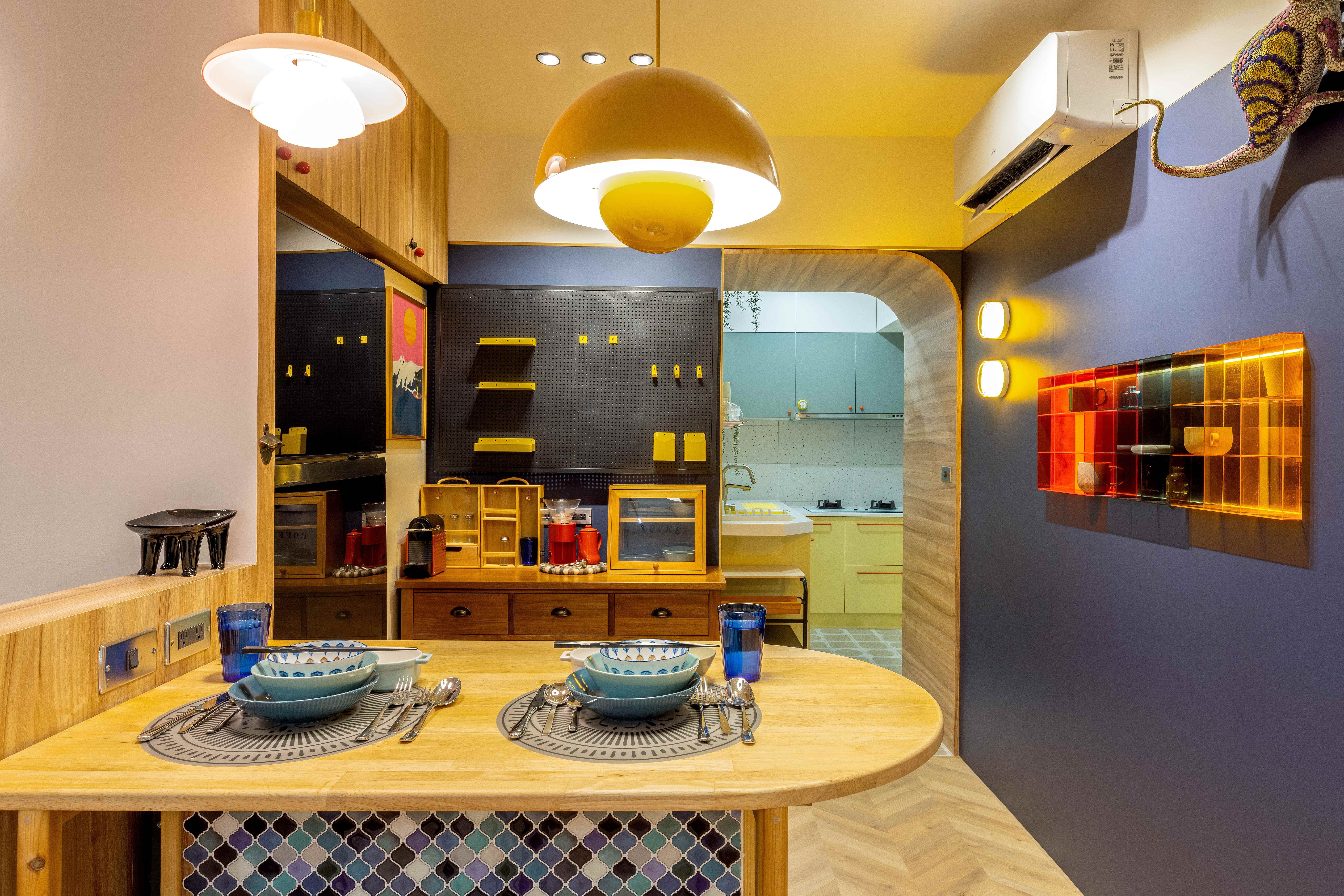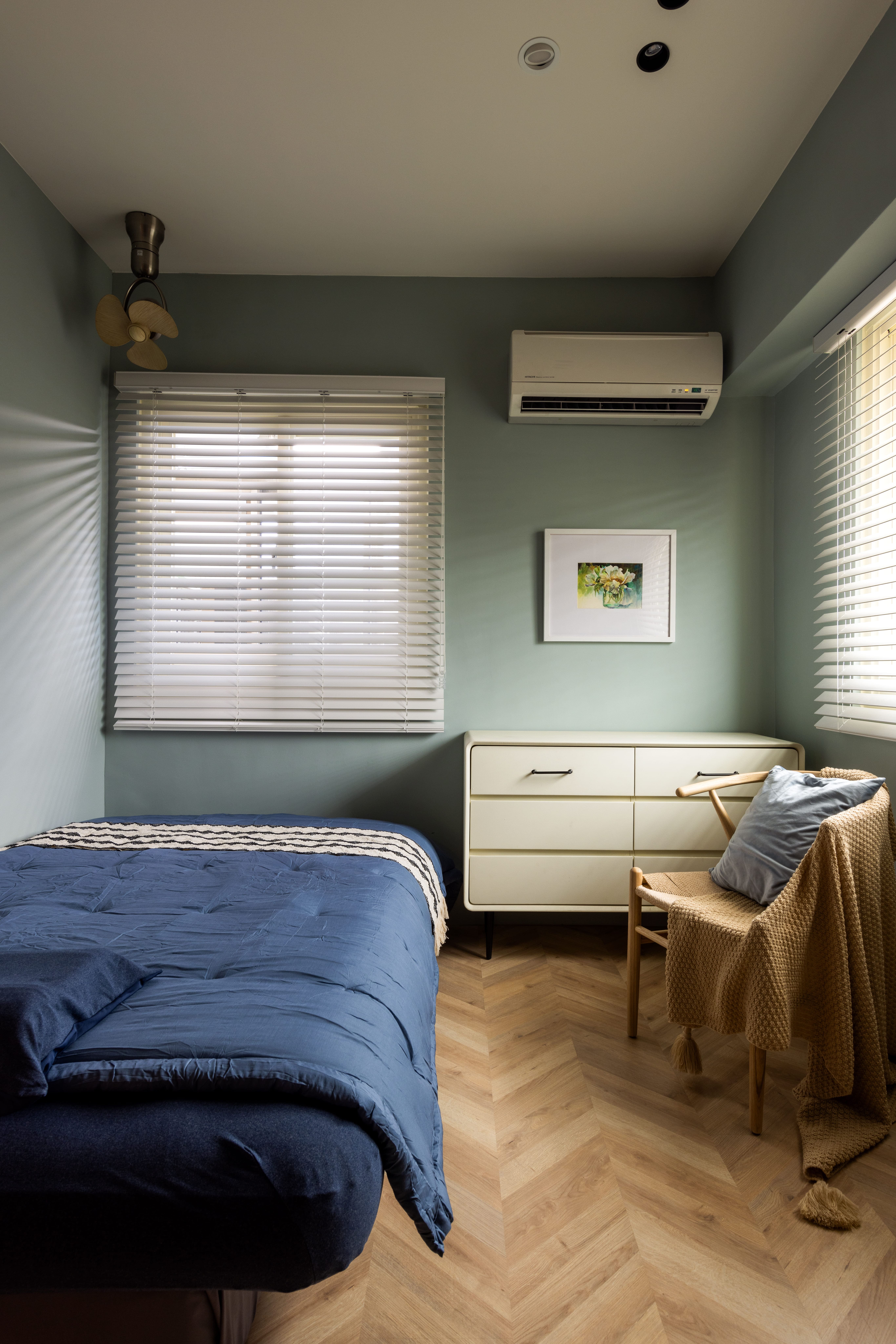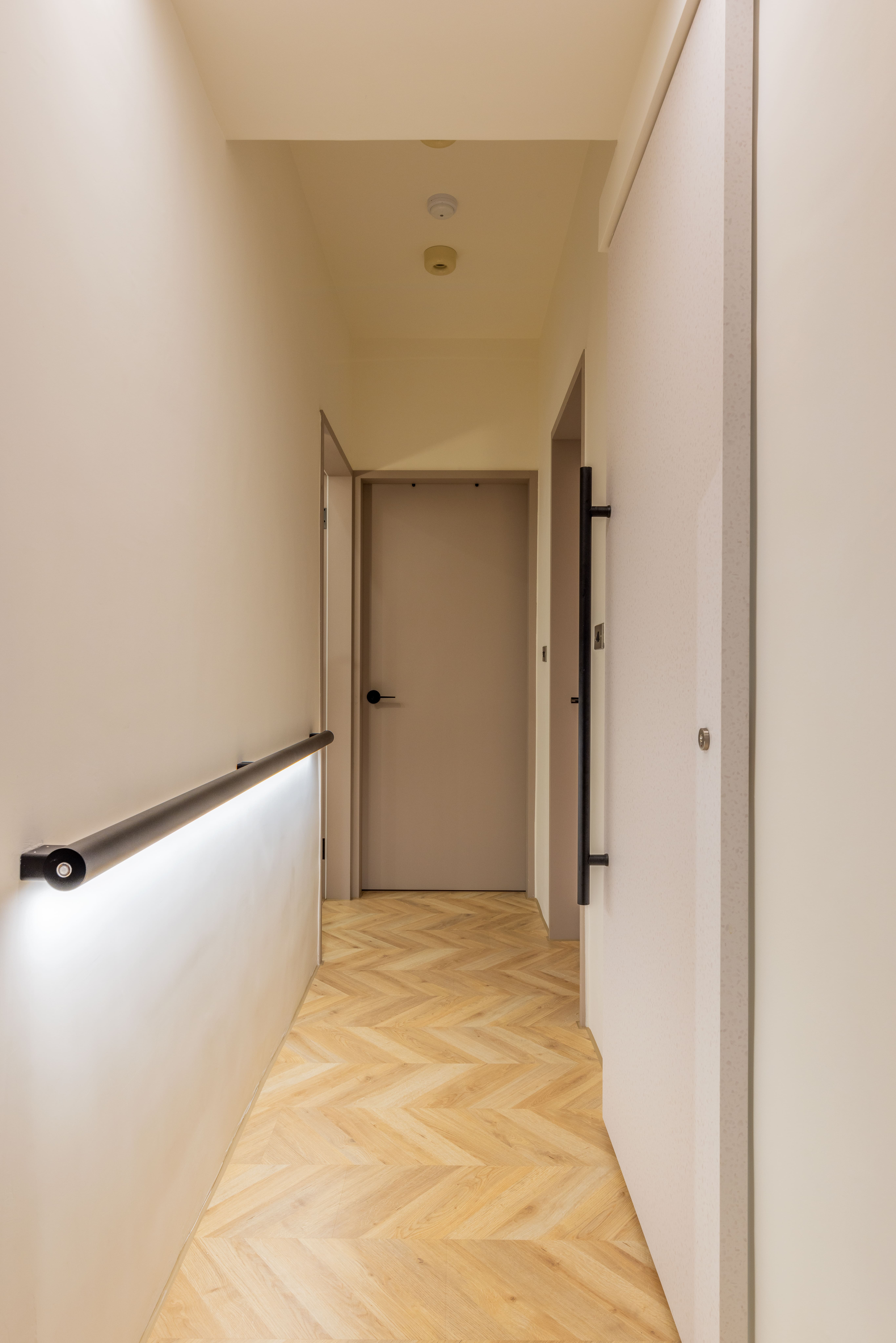 Safety is embedded in daily living. In the hallways, handrails are equipped with motion-sensor lights for nighttime guidance. The bathroom features a 90-centimeter shower with slip-resistant flooring, a wider sliding door, a flower-shaped faucet, and a touchless toilet. In the dining area, a navy palette paired with warm yellow light makes a modern bistro, accented by the homeowner’s animal figurines. Warm wood tones and vibrant colors create a calm yet lively atmosphere. In the living room, the original air conditioning vent is preserved and framed with a retro stained-glass window to create shifting plays of light and shadow, infusing daily life with poetic charm. The front balcony is reimagined as a coffee bar and relaxation nook, framing views of the old cityscape and highlighting the interplay of new and old within the home. The master bedroom uses soft pink accents to reflect the female homeowner’s free-spirited personality, complemented by a semi-open walk-in closet that balances functionality and openness. The secondary bedroom embraces a calming green palette for the younger brother with fabric-draped open wardrobes that combine lightness and convenience. Together, the design of both bedrooms provides privacy while still carrying subtle traces of shared life. A cat passage in the storage room wall doubles as ventilation, creating joyful coexistence.