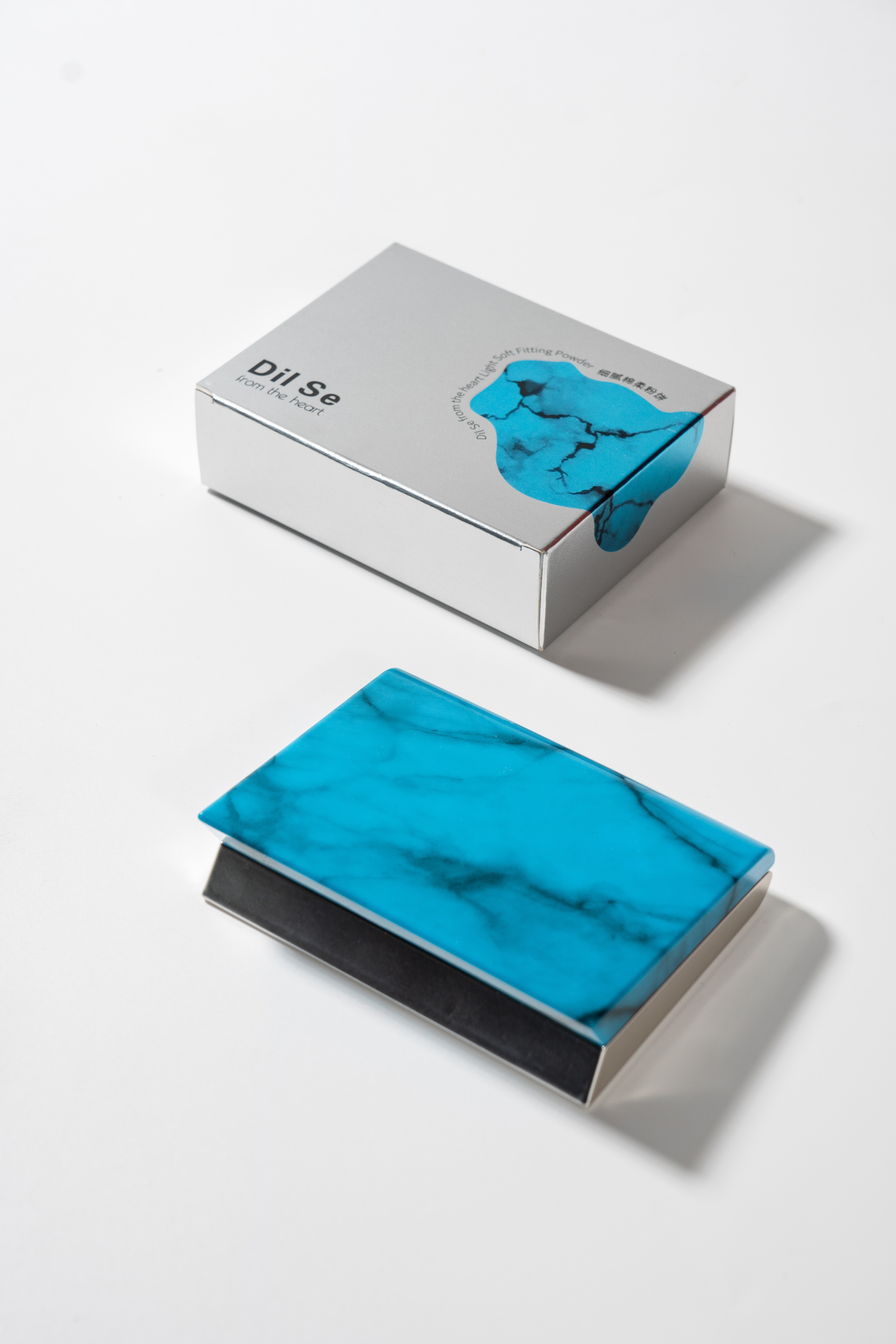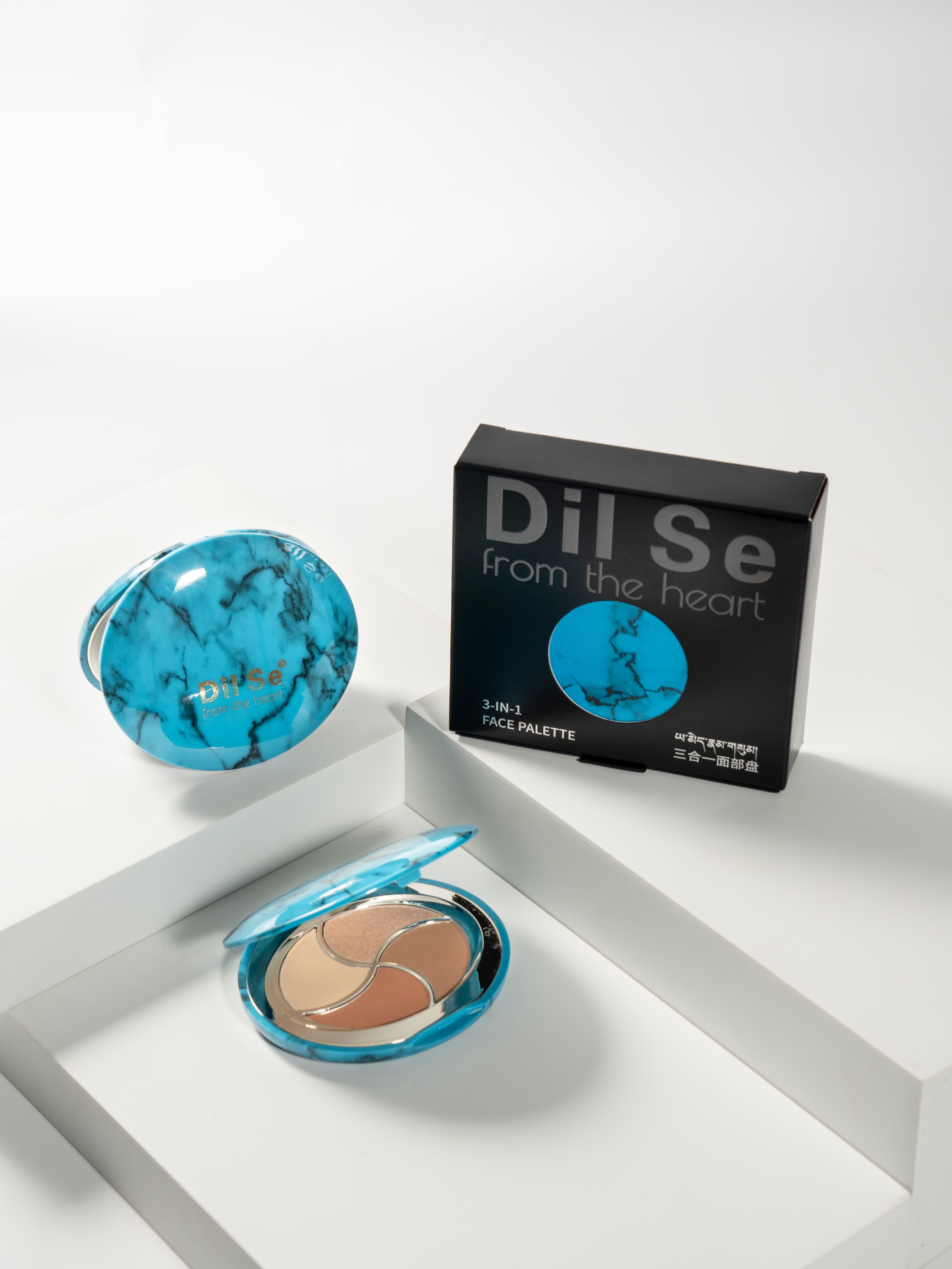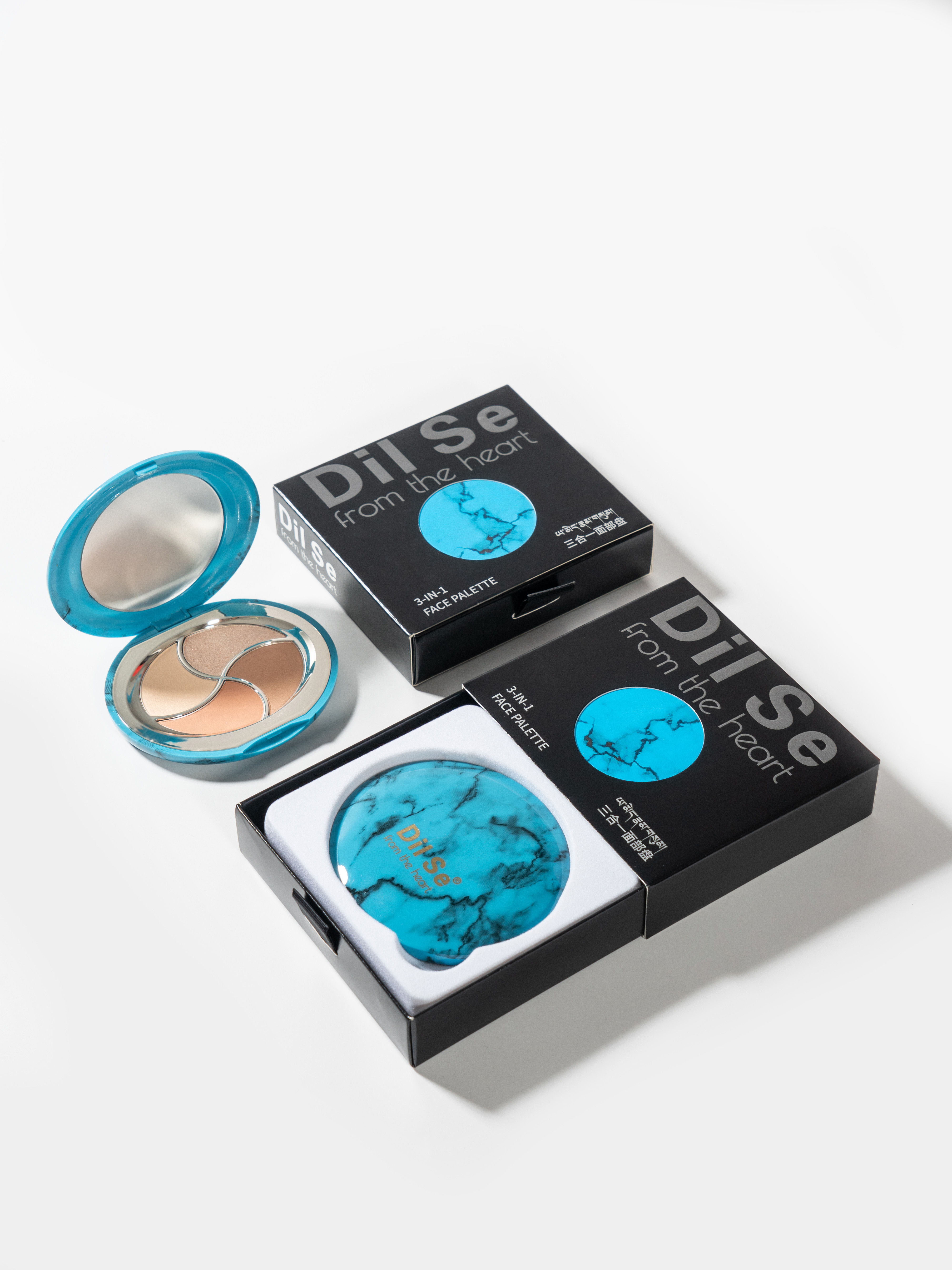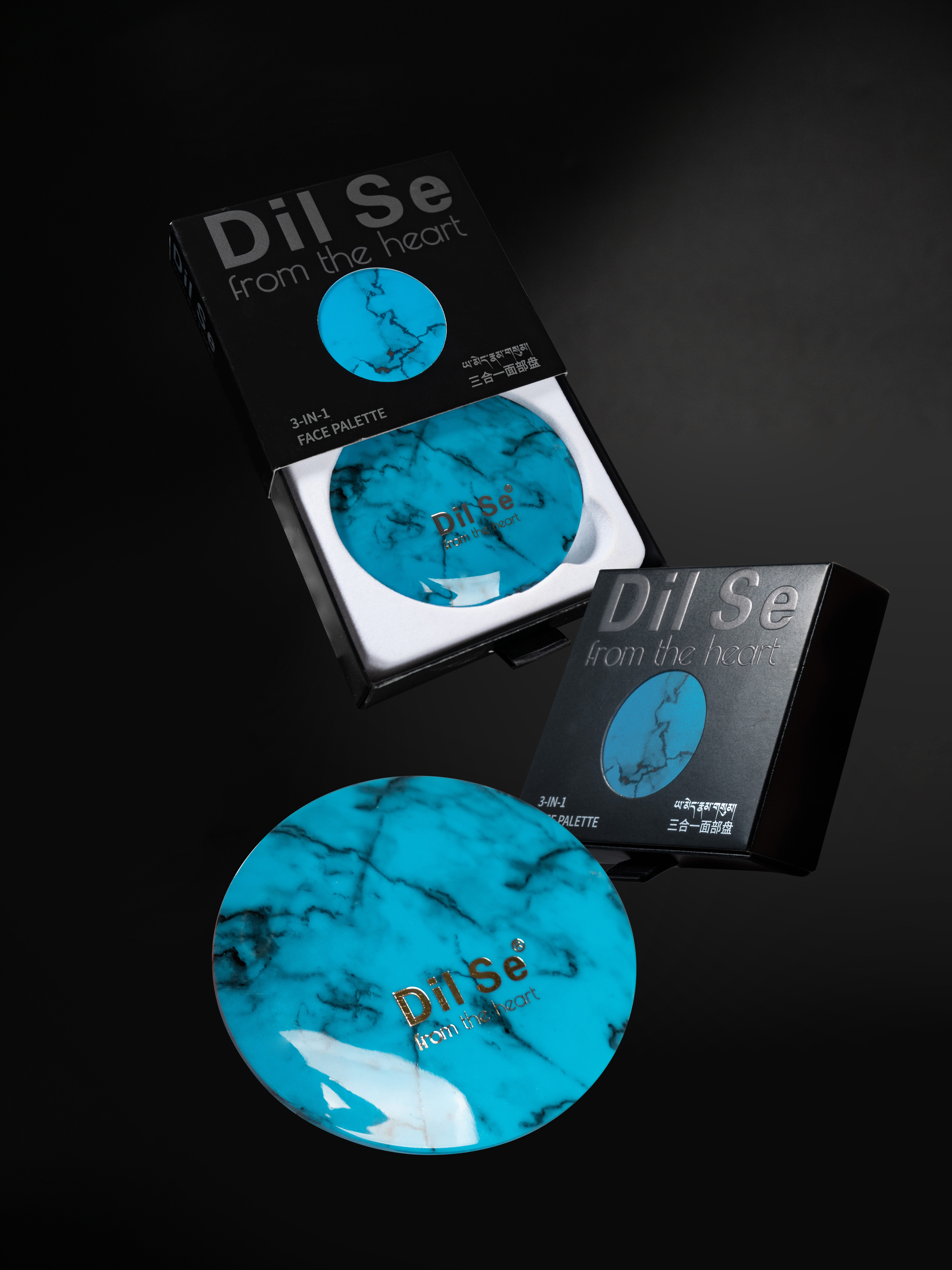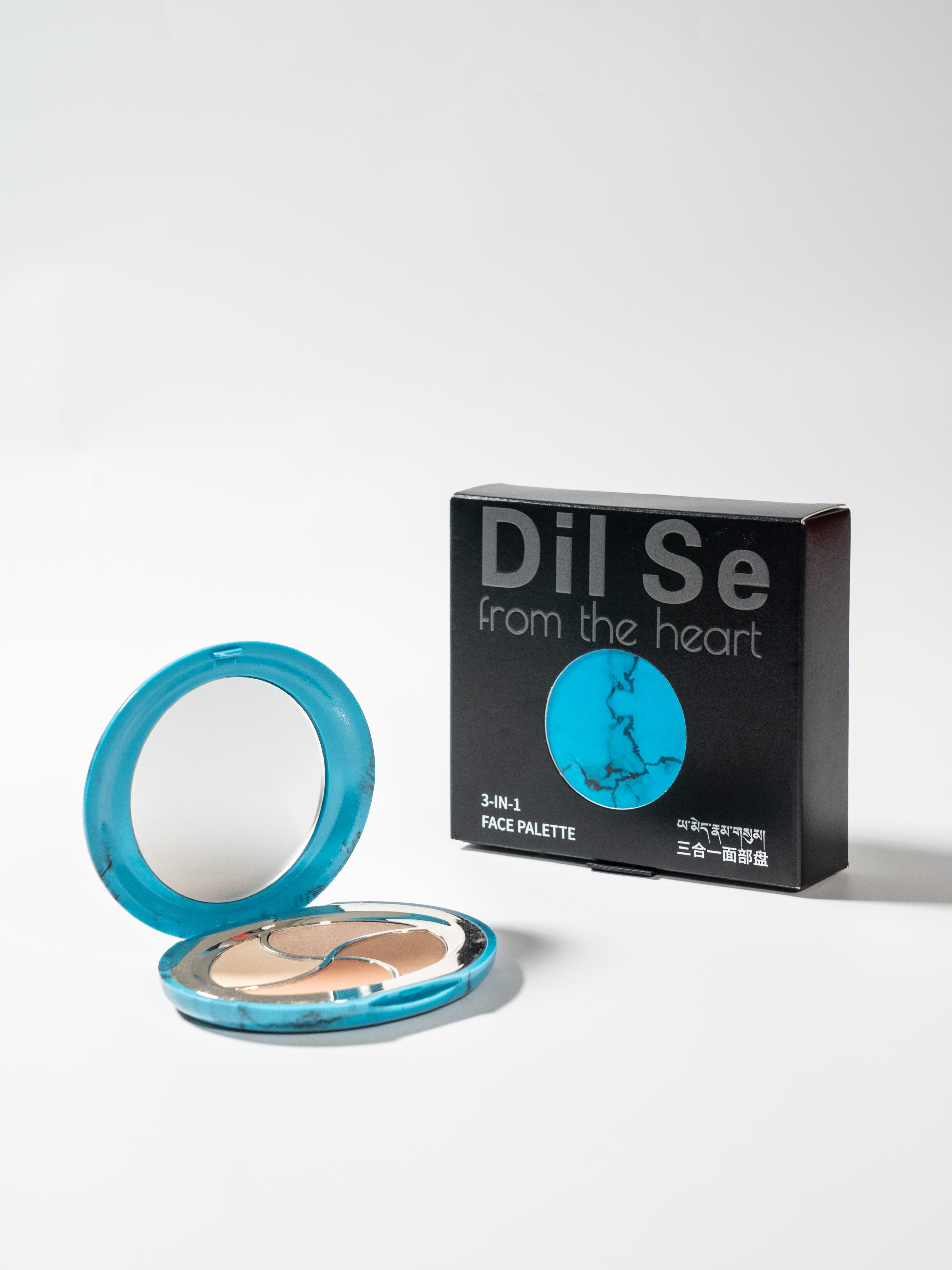 The packaging design for the dilse three-in-one face palette draws from the spiritual core of traditional Tibetan jewelry. It is inspired by the classic combination of turquoise and silver. In Tibetan culture, turquoise symbolizes the tranquility of nature and carries blessings, its deep hue reflecting a timeless pursuit of harmony. Silver represents the purity of moonlight and spirit. Together, they embody the dual themes of "protection" and "light."
