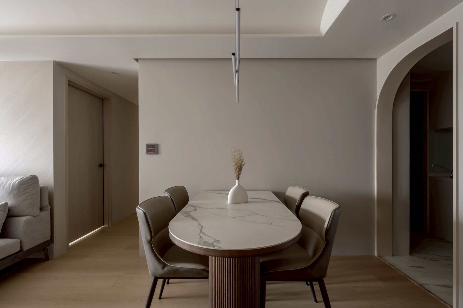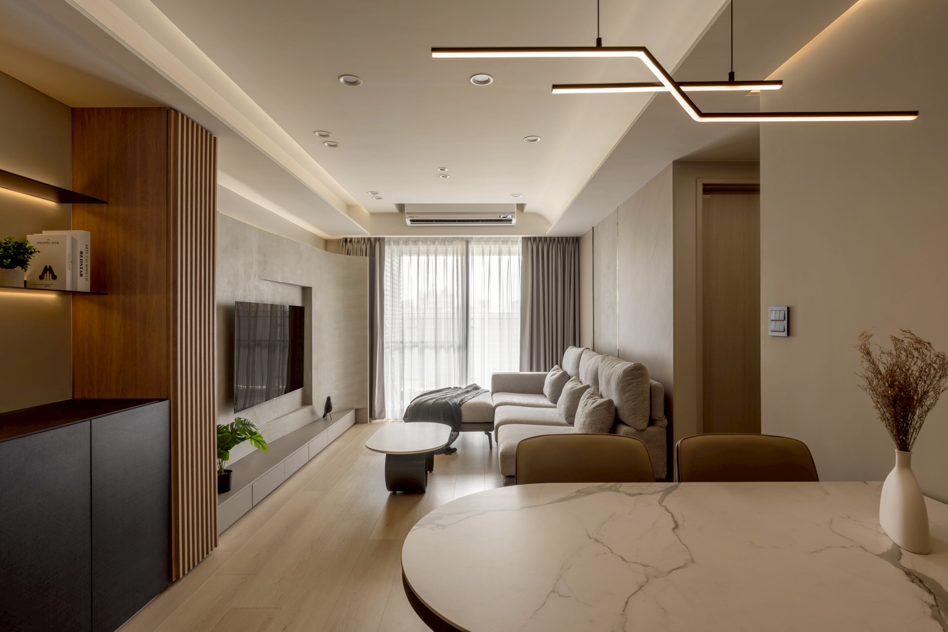 This project showcases the design of an elegantly completed residence, where rational spatial planning seamlessly merges with organic lines, resulting in a welcoming three-bedroom home that features two inviting living rooms and two well-appointed bathrooms. At the heart of the design lies a commitment to enhancing circulation and functionality, effectively balancing practicality with striking aesthetic appeal. This balance is achieved through the thoughtful selection of materials, dynamic grid patterns, and graceful curved elements. Furthermore, natural light gracefully cascades through the varied textures of the facade and the meticulously chosen floor finishes, infusing the interior with a warm and inviting ambiance. As a result, the overall design not only facilitates smooth daily routines but also allows residents to fully embrace the warmth and tranquility of their surroundings, enriching their everyday experience. In essence, this residence harmonizes comfort with sophistication, creating a space that feels both practical and deeply nurturing.