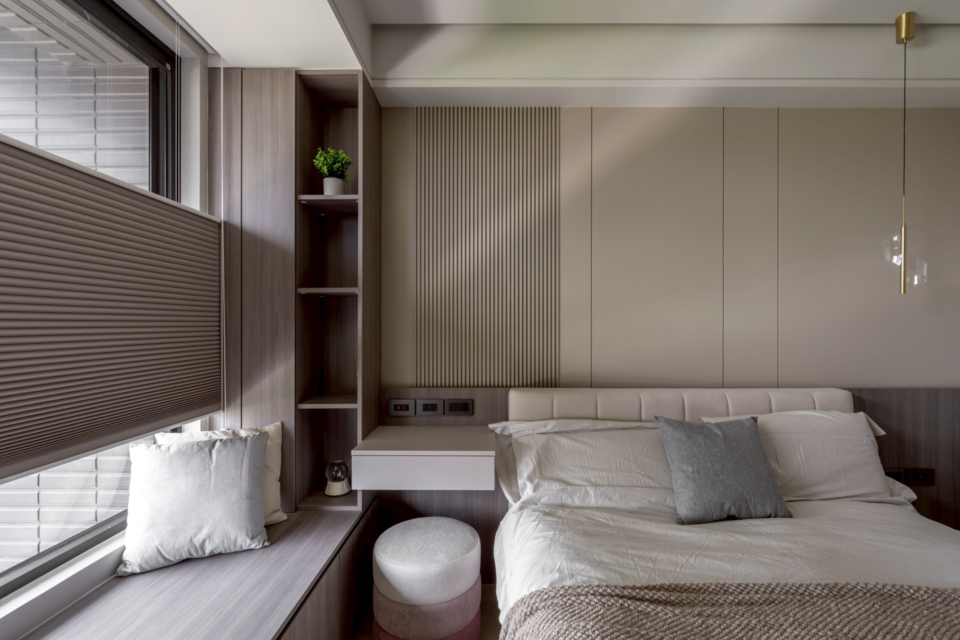 The private domain is a remarkable blend of design and functionality, prominently featuring expansive windows that artfully weave light and shadow through the diverse textures of various materials. Moreover, the wardrobe employs an innovative, compartment-free design, allowing the homeowner to effortlessly customize its layout to meet their daily needs.