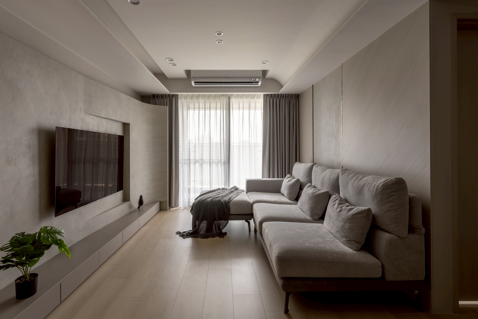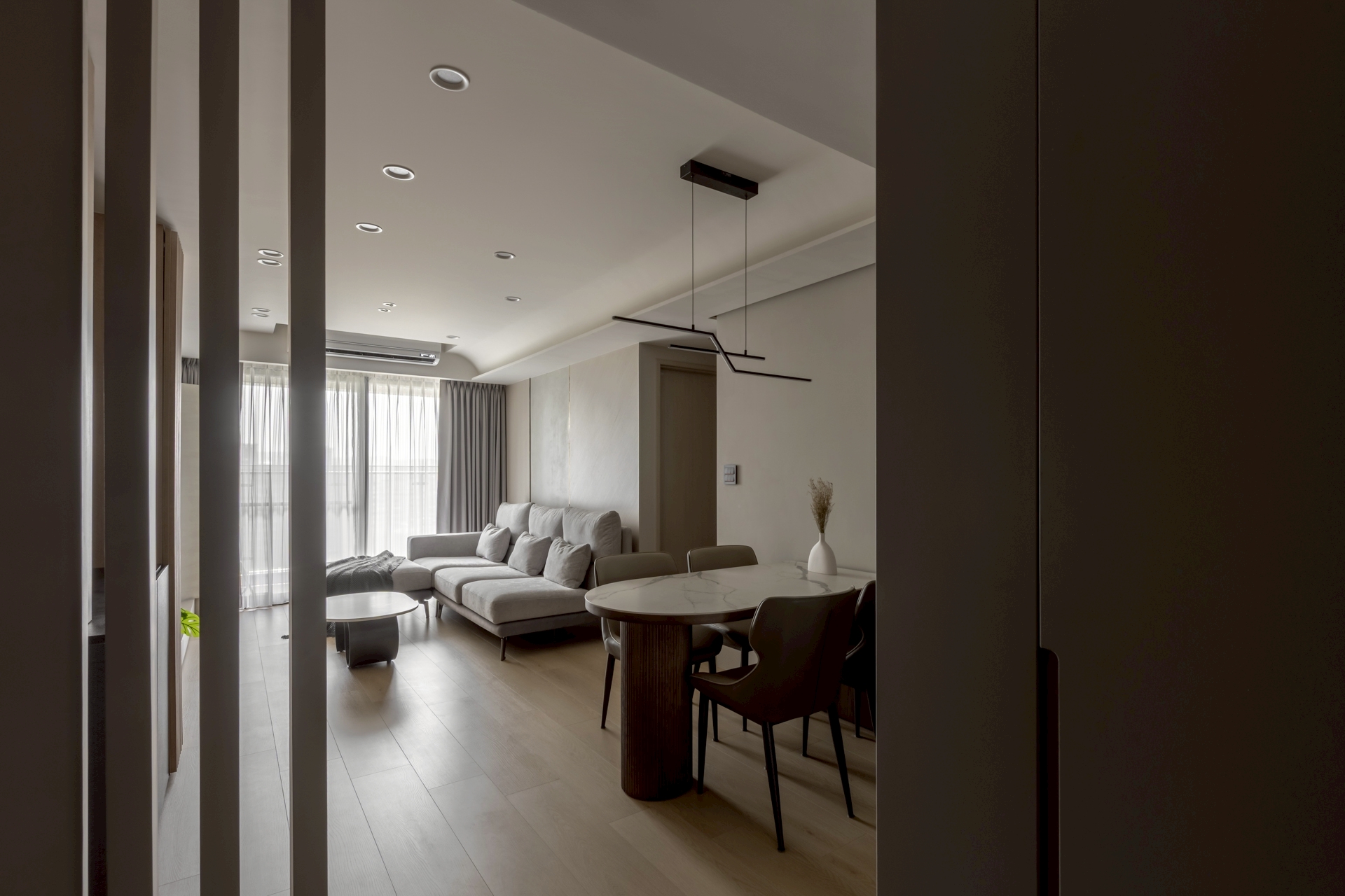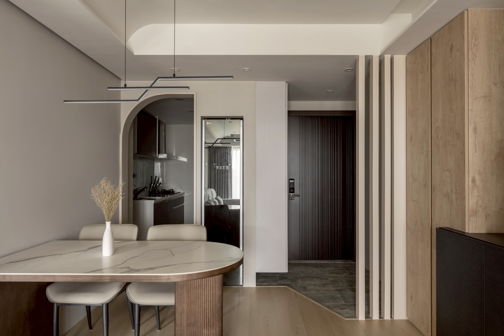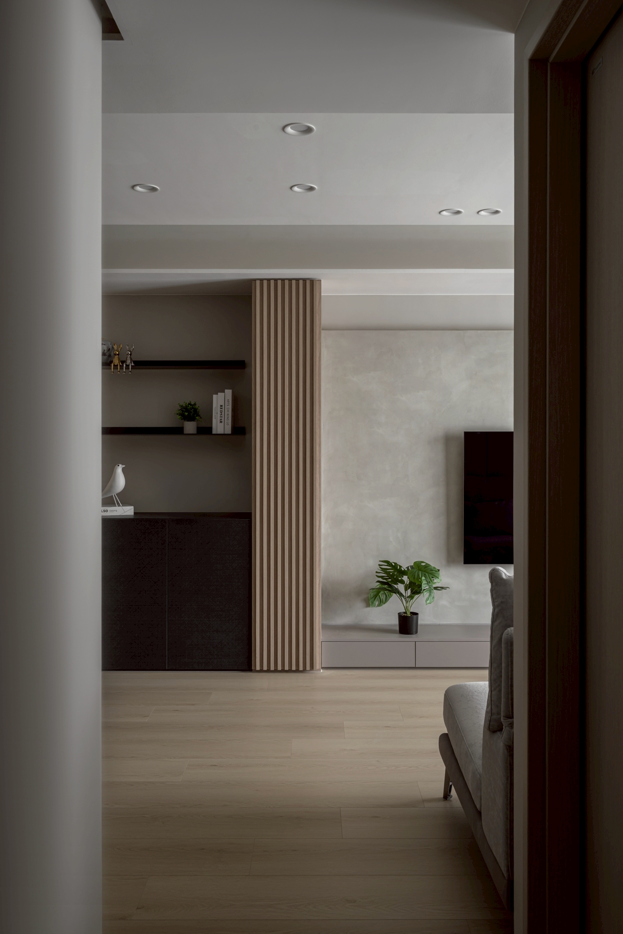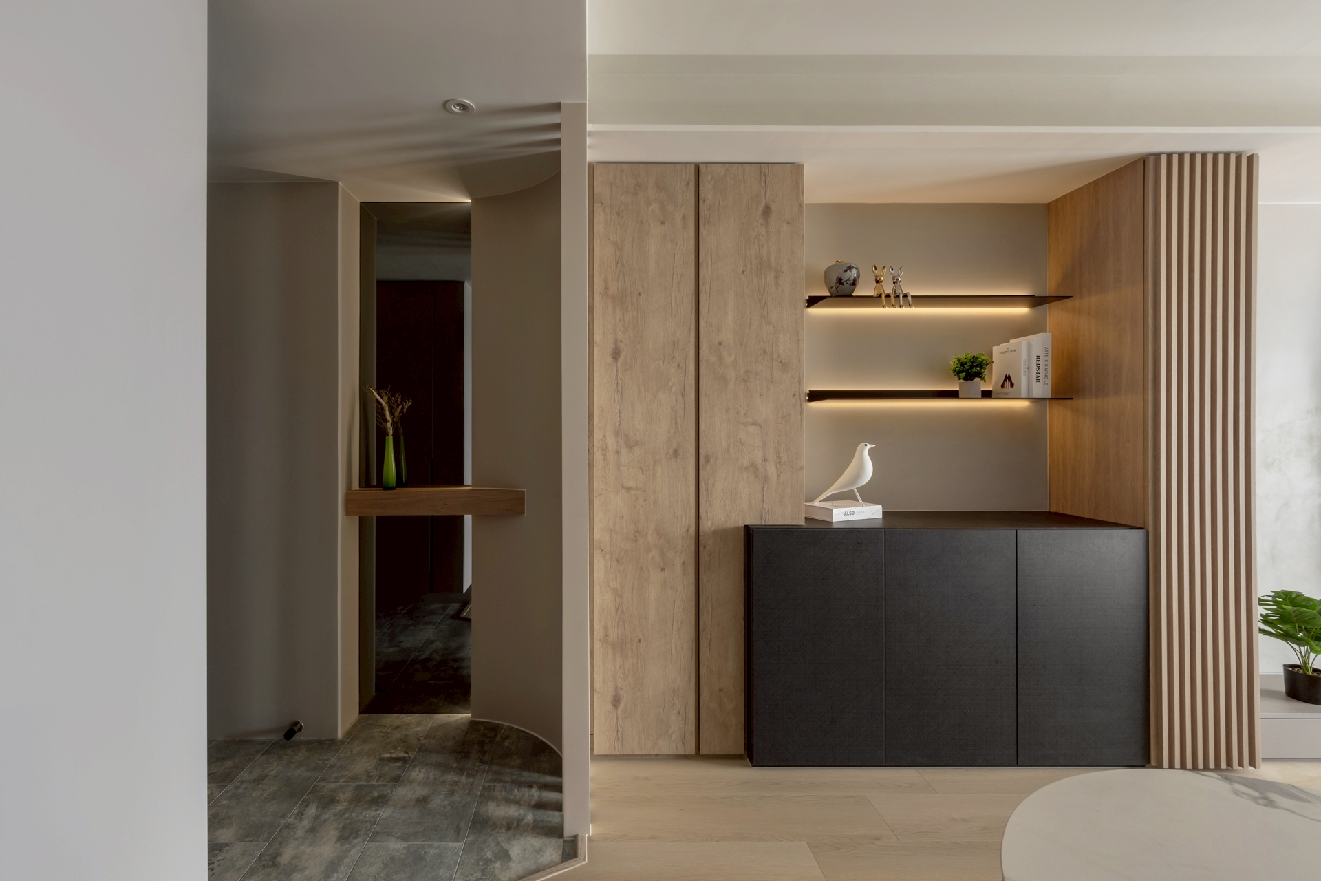 The entryway boasts a thoughtfully designed shoe cabinet, enhanced with an elegant latticework pattern that not only complements the aesthetic but also effectively mitigates direct airflow. This clever design choice strikes a perfect balance between storage functionality and air circulation, fostering a truly welcoming atmosphere. Moreover, the incorporation of curved elements into the facade adds to the soft and sophisticated ambiance, creating an inviting visual experience. Meanwhile, the television is artfully recessed into a groove, which delivers a sleek and streamlined appearance, ensuring that the overall look remains clean and modern. The carefully curated color palette, which centers on harmonious gray and white tones, is beautifully contrasted with warm wood finishes. Together, these elements paint a picture of minimalist yet striking artistic beauty, elevating the entire space and making a lasting impression on all who enter.