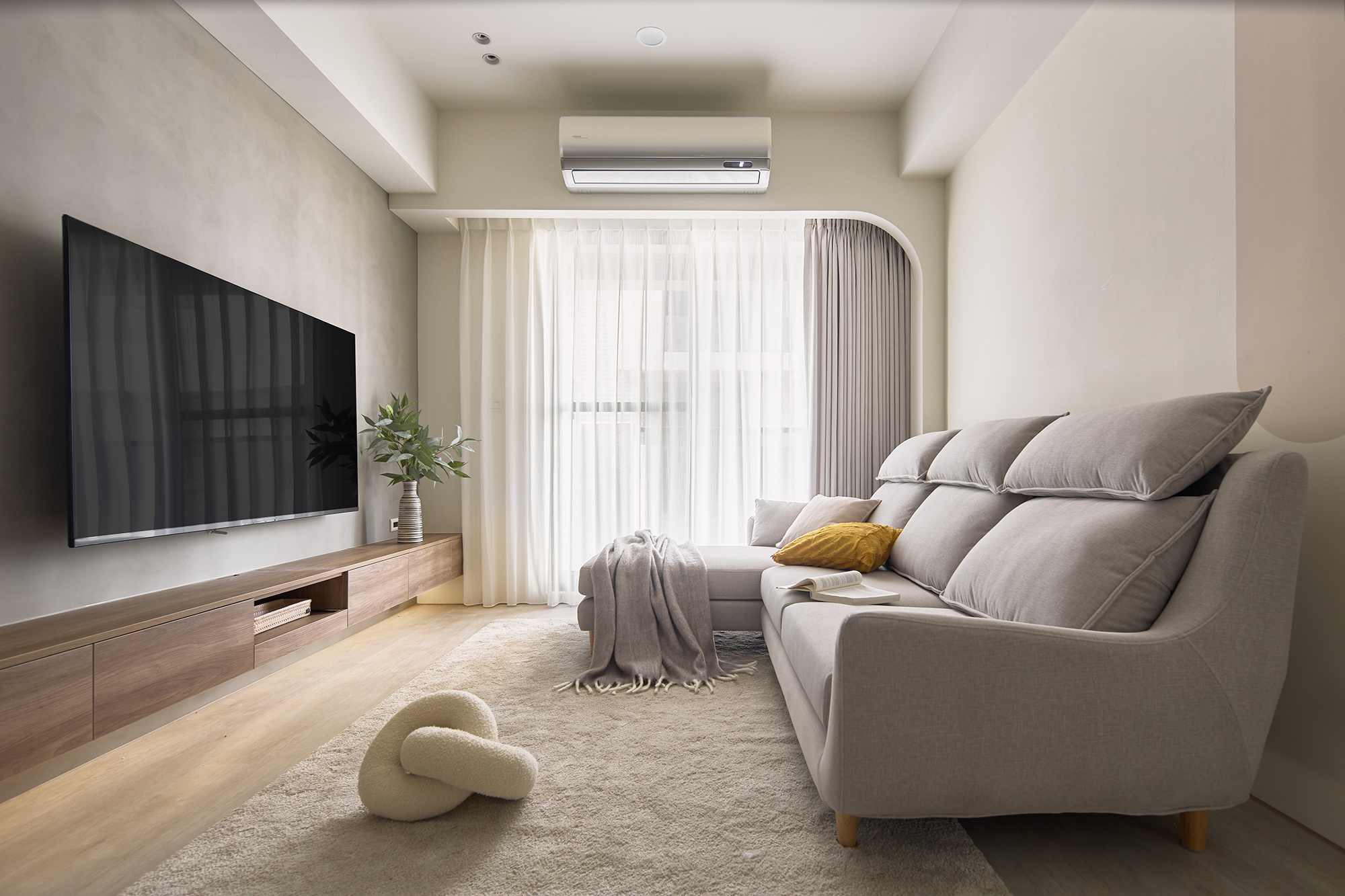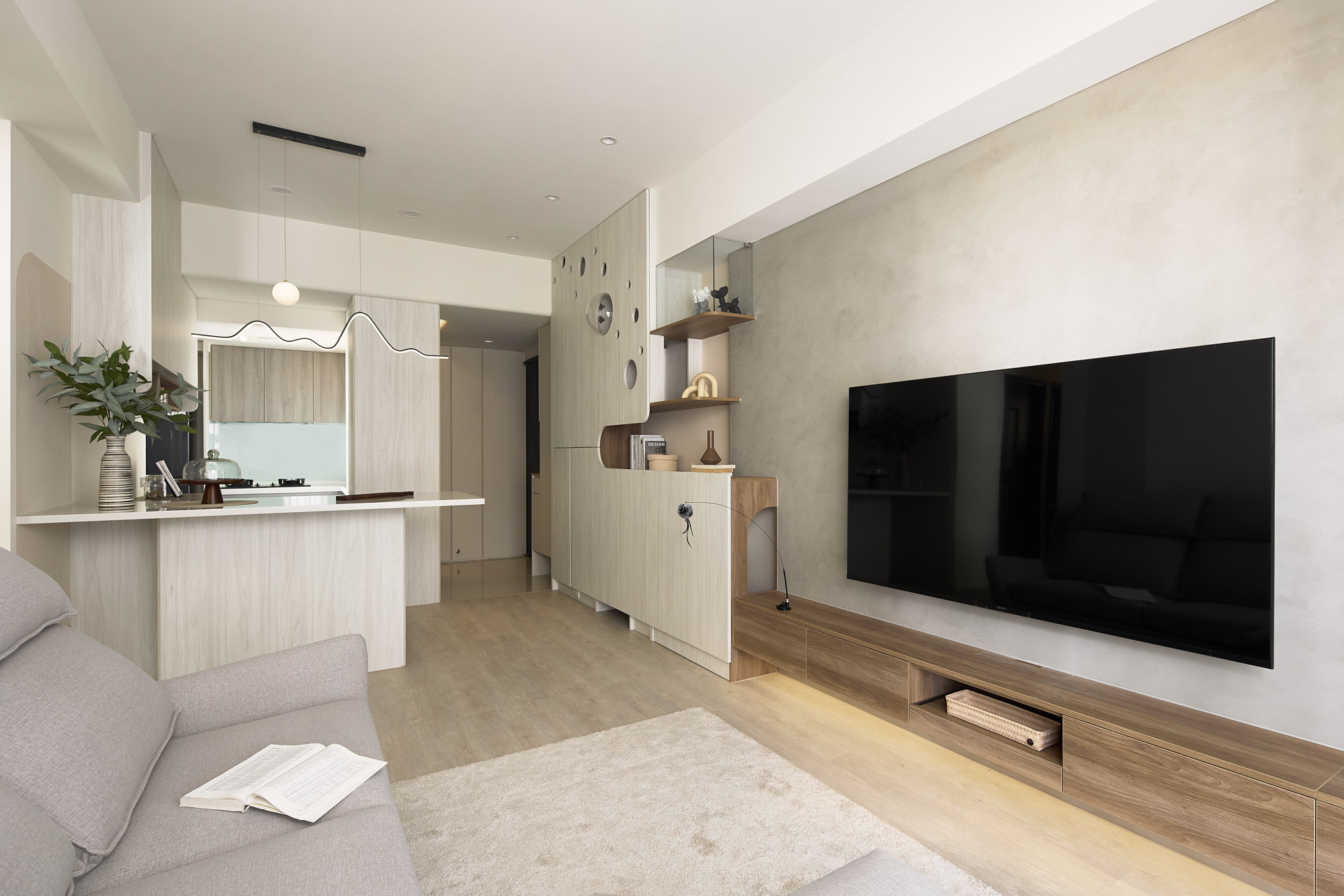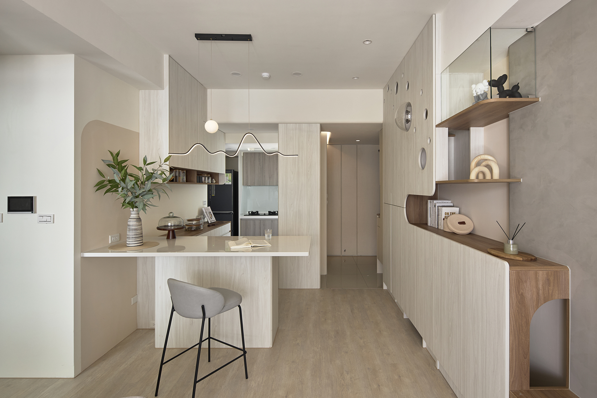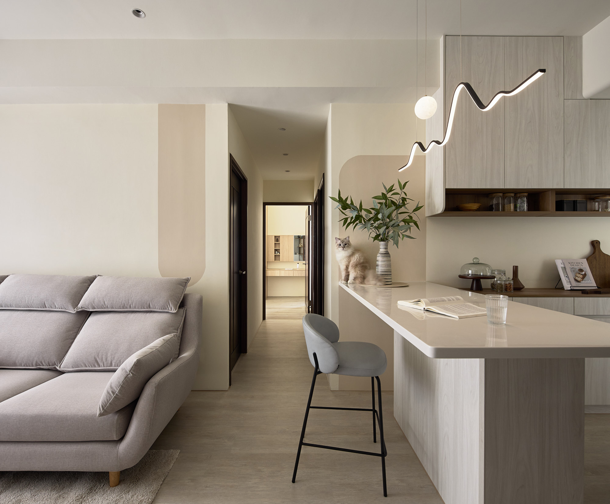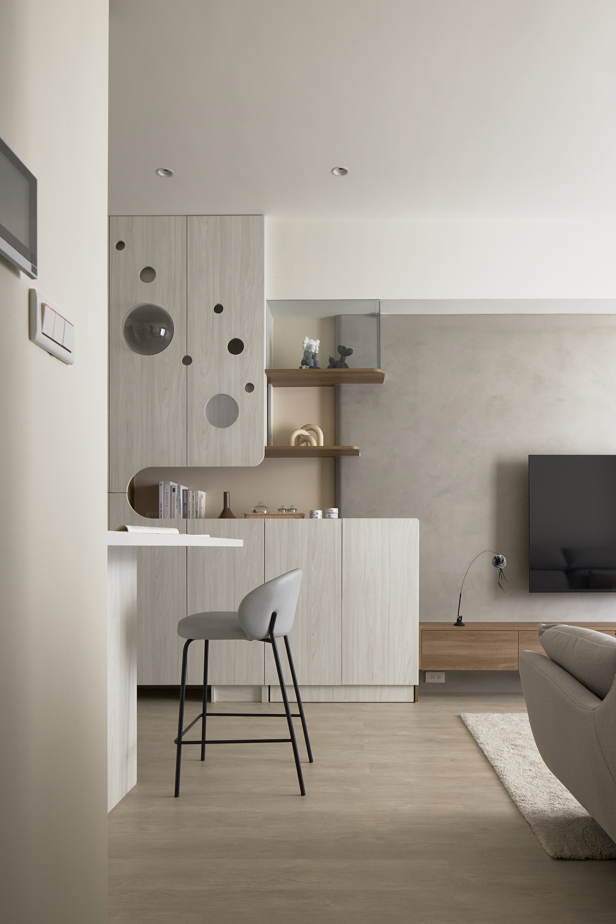Stepping into the inviting foyer, one will be seamlessly welcomed into the expansive open-plan communal area, which artfully combines the kitchen, dining space, and living room. This thoughtfully designed layout not only facilitates fluid circulation but also allows natural light to cascade throughout the area, enhancing the sense of spaciousness and comfort, even within the confines of limited square footage. Notably, the design team has ingeniously incorporated a dedicated cat activity zone into the main living room wall cabinet. With meticulously crafted side cutouts and circular openings, cats can delightfully climb and roam while the litter box and cat tree remain discreetly concealed, striking a perfect balance between aesthetics and functionality. At the heart of the kitchen, an engineered stone island effortlessly connects to the cabinetry, featuring storage beneath that conveniently doubles as a dining table or a cozy reading nook. Enhancing the overall visual appeal, streamlined pendant lights are suspended gracefully above the island, serving as a striking focal point that elevates the entire space.
