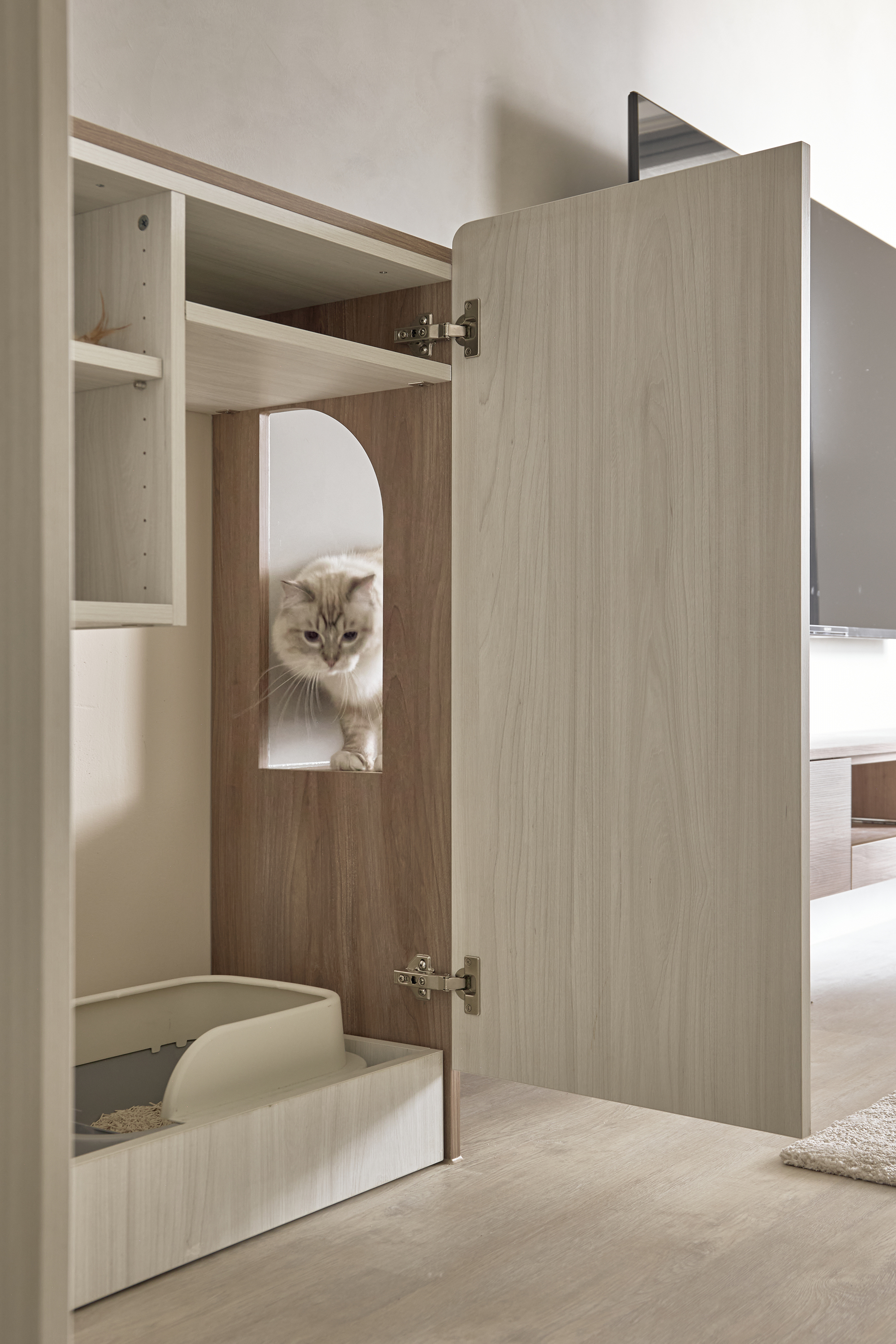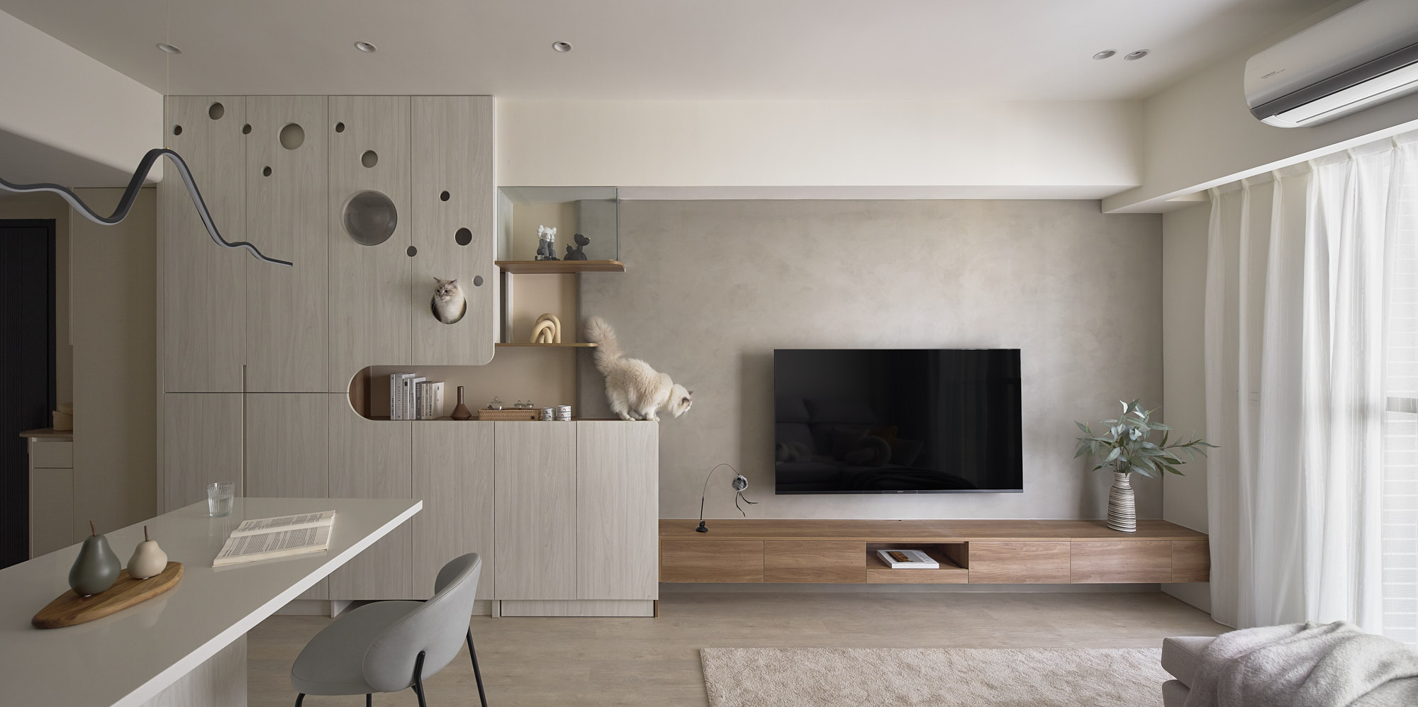 The homeowners envisioned a meticulously designed shared living space that would not only accommodate their long-time feline companion but also elevate the overall experience of daily life. To bring this vision to fruition, they established distinct yet harmonious circulation paths, allowing both humans and cats to navigate their own realms while remaining intimately connected. Moreover, the aesthetic of the space embraces a minimalist Nordic style, effortlessly combining form and function. This design philosophy is characterized by a soothing palette of soft browns, whites, and grays, creating an inviting atmosphere. The thoughtful incorporation of elegant woodwork and gracefully curved elements further enhances the visual appeal, evoking warmth and tranquility throughout the environment. Consequently, the space serves as a picturesque backdrop for heartwarming scenes of everyday life, beautifully illustrating the deep bond shared between humans and their beloved cats. Each corner exudes a sense of harmony, where comfort and style coexist, making it not just a residence but a nurturing sanctuary for both its inhabitants and their cherished feline friend.