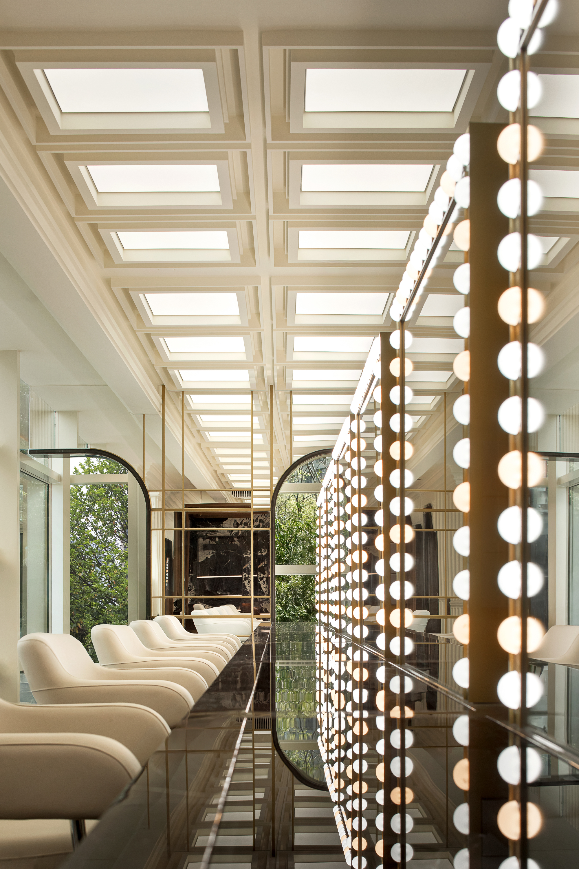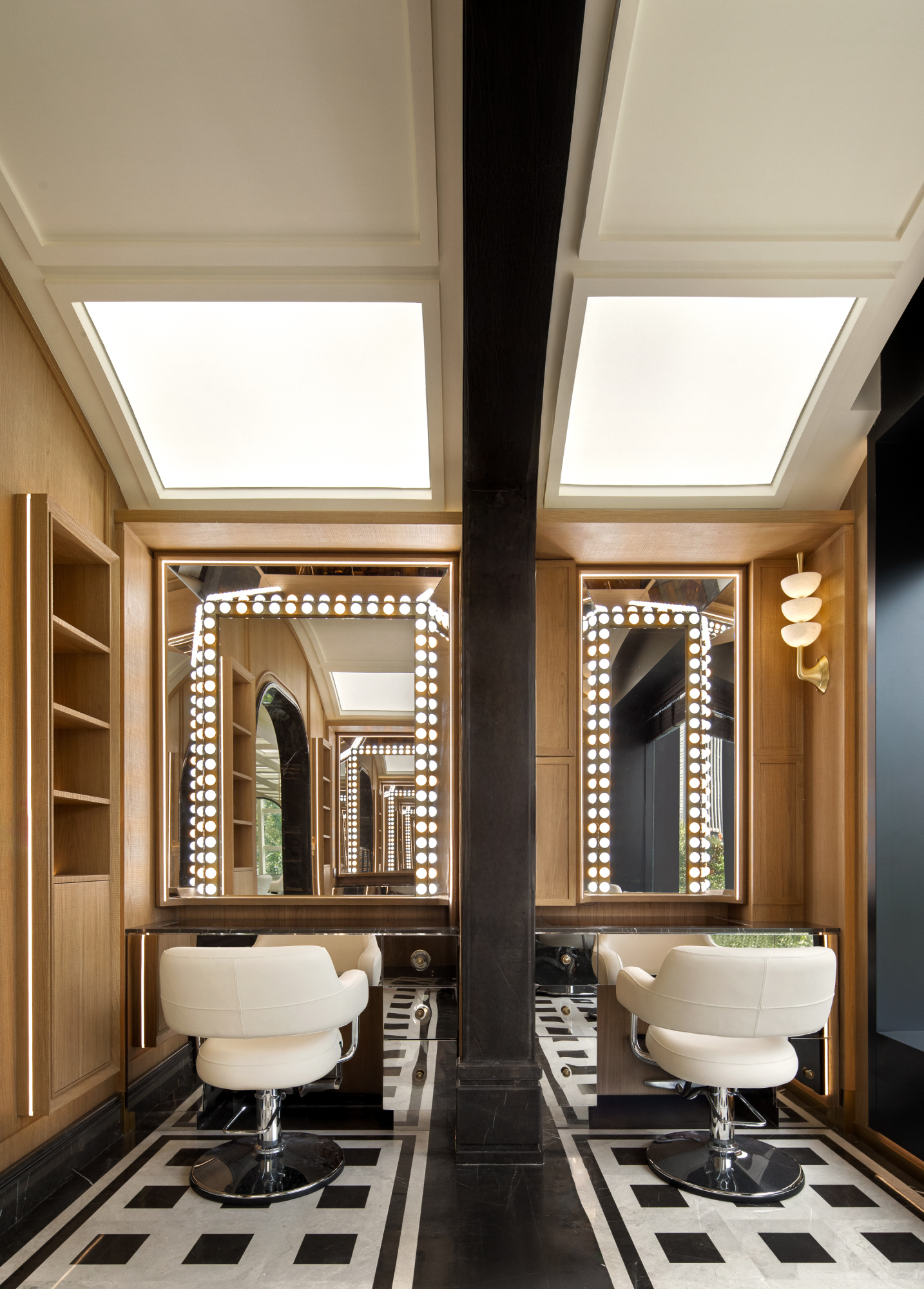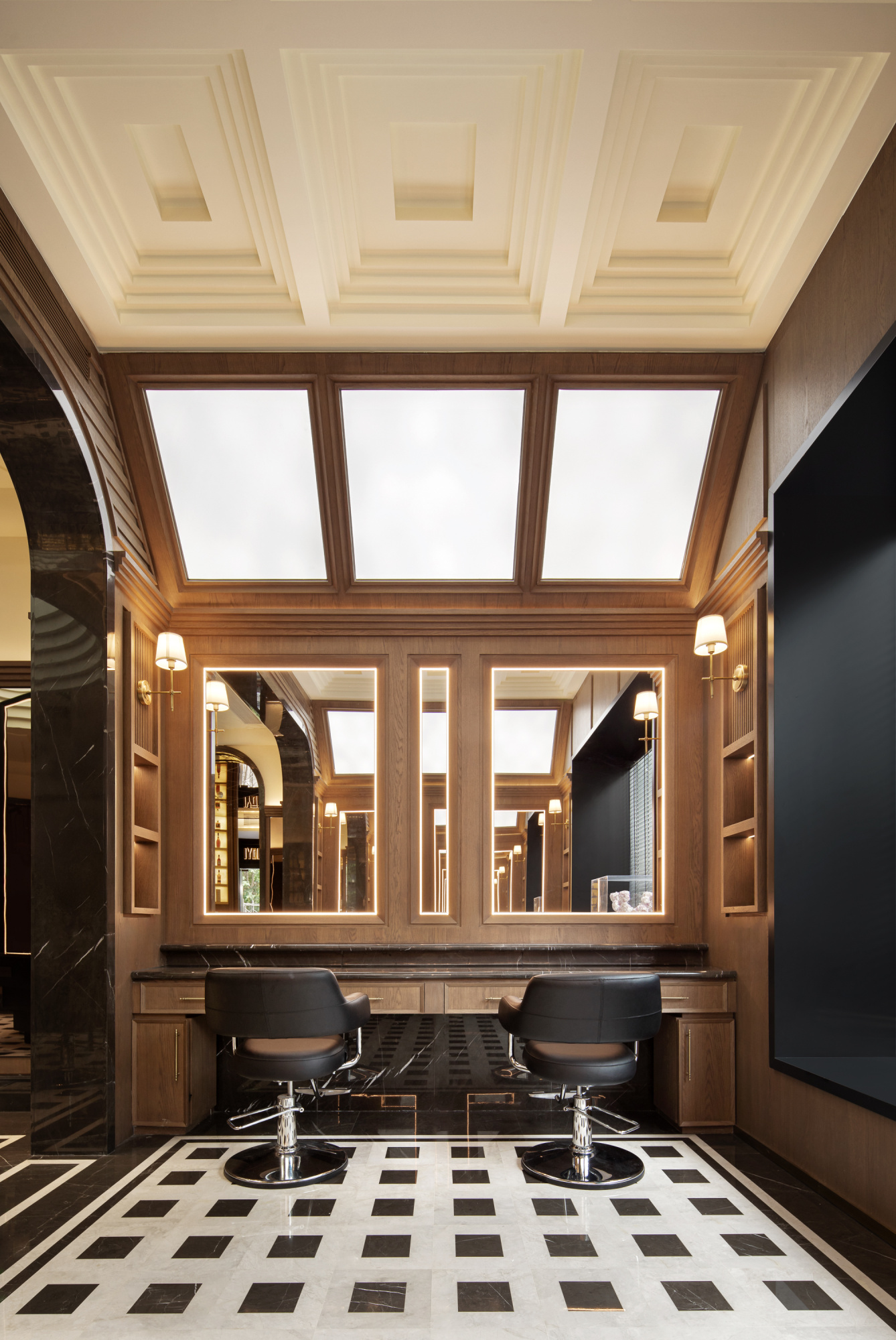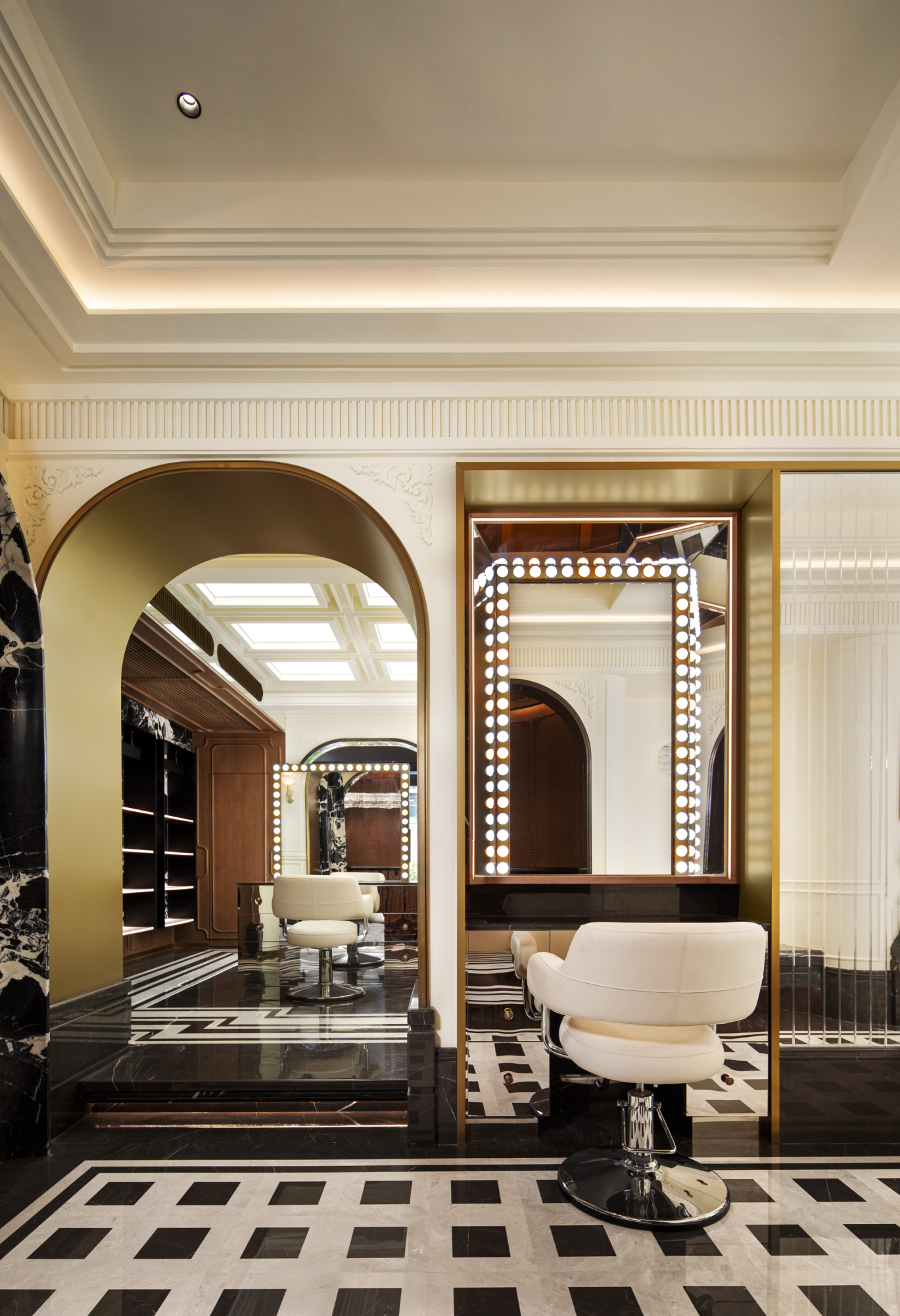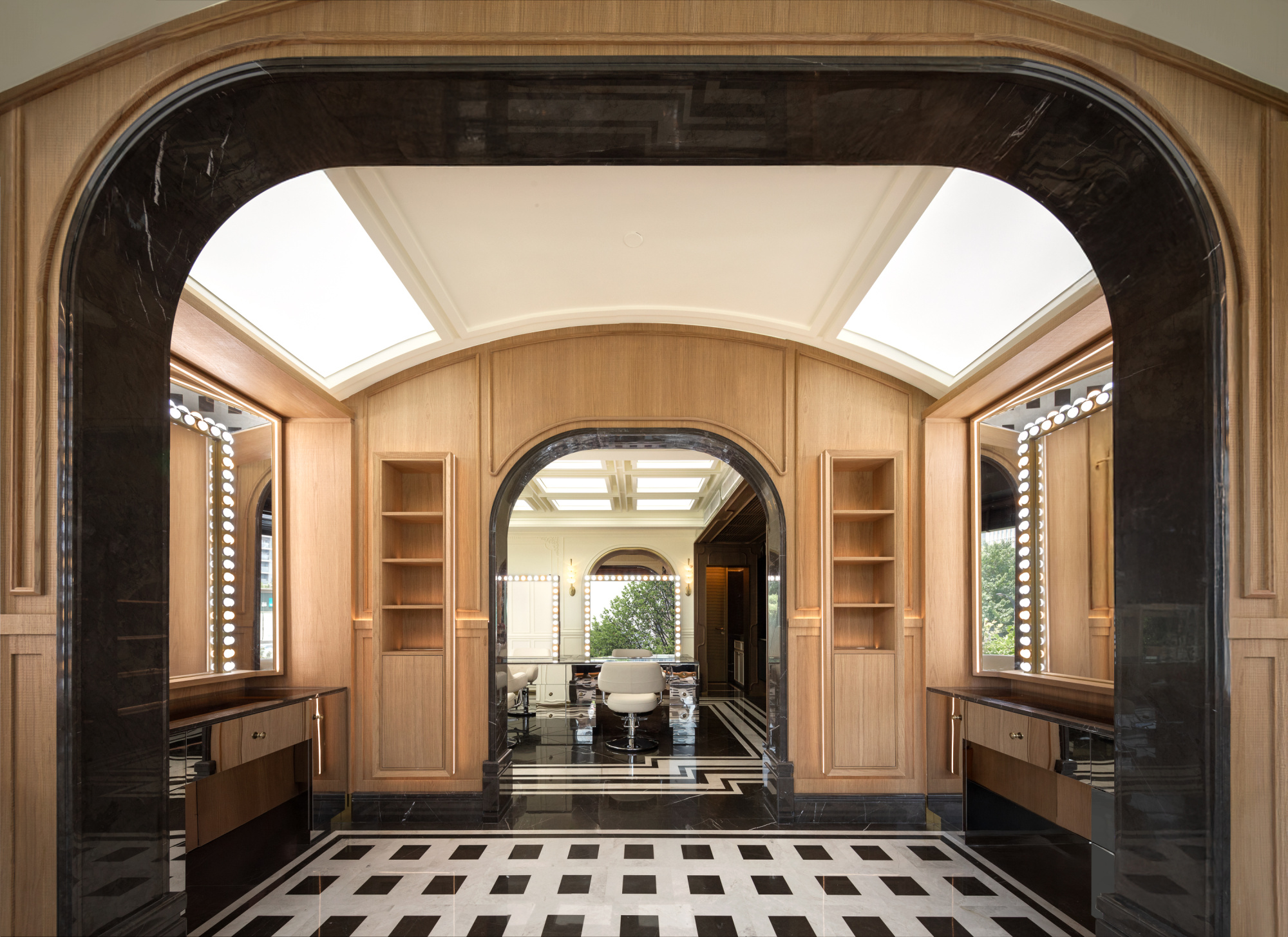 VIP Makeup & Styling Area: A curved ceiling, grid-patterned light films, and large windows introduce ample natural light. Combined with warm wood and marble materials, this creates a comfortable and exclusive high-end service experience.