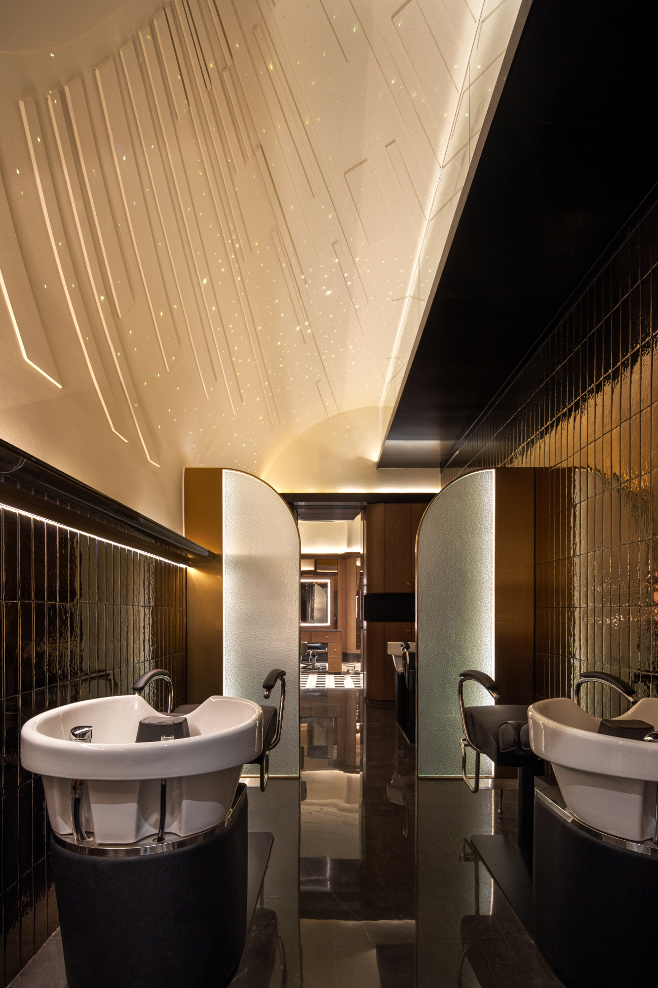 Hair Washing Area: The ceiling uses dotted lights and radial light strips to mimic a starry sky effect. Semi-arc glass partitions define the space while maintaining visual and light permeability, enhancing the ceremonial feel of the daily hair washing experience.