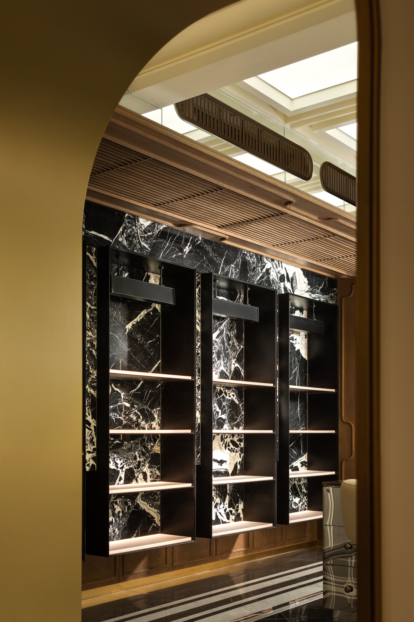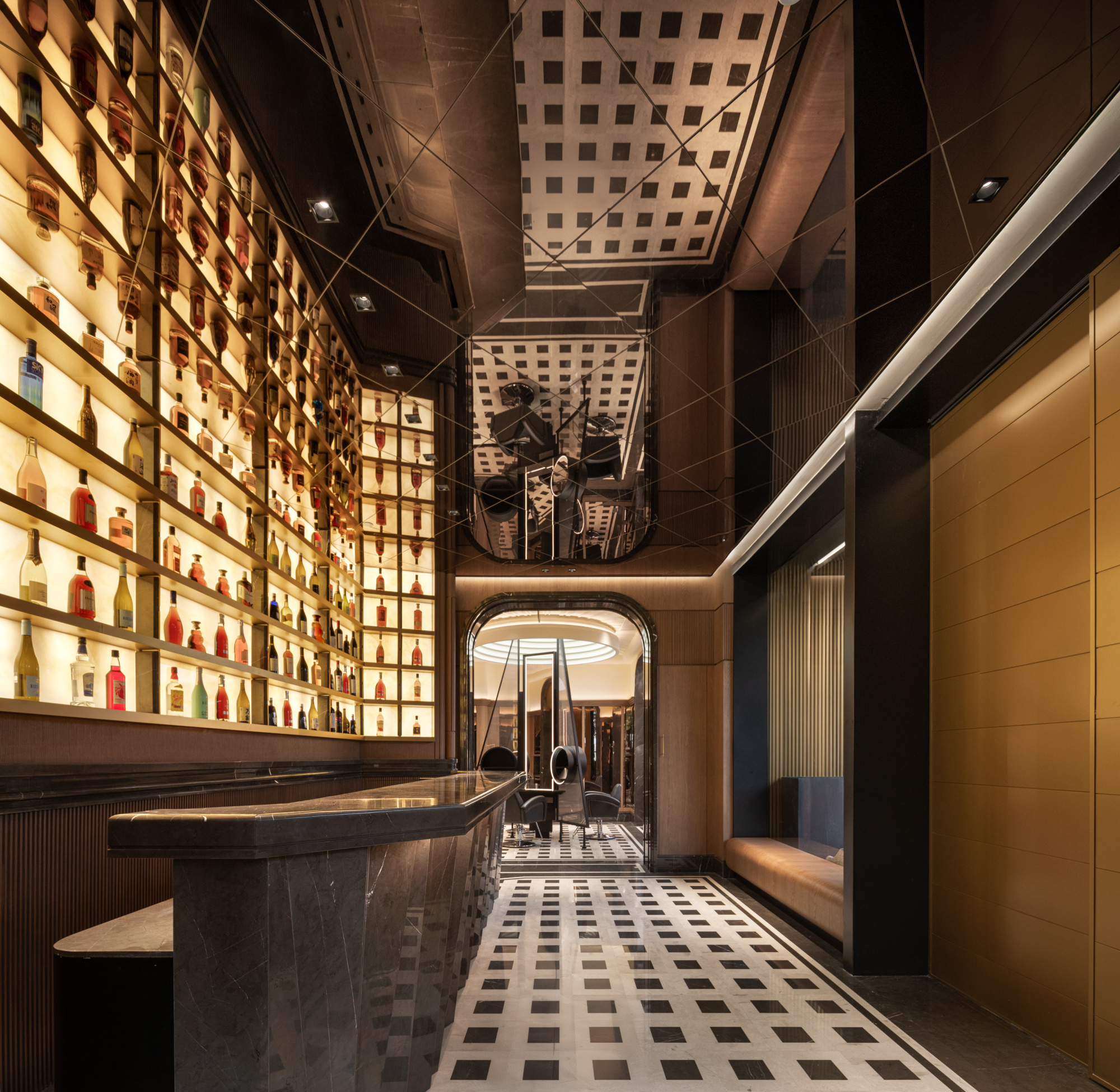 Reception Area: The dark grey marble base of the front desk is diagonally cut, creating a strong geometric visual impact. A metal wine cabinet and a backlit jade wall, illuminated by warm yellow lighting, foster a luxurious atmosphere, while the black-and-white checkerboard floor reinforces a sense of order.